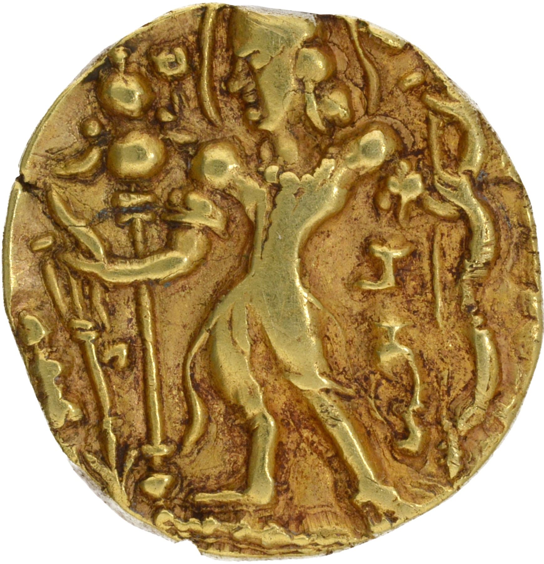 Gupta Dynasty, Chandragupta II (Vikramaditya) (375-415 CE), Gold Dinar, "Archer" type, Obv: the king standing facing left, nimbate, holding a longbow in his left hand and an arrow in his right, a Garuda standard on the left field, the Brahmi legend “Chandra" below the king's arm, Rev: the goddess Lakshmi, nimbate, facing forward and seated in the padmasana posture on a lotus, holding a diadem in her right hand and a lotus in her left, a tamgha in the top left field, the Brahmi legend "Sri Vikramah" in the right field, 7.77g, 18.02mm, (Variant of Altekar. Bayana Hoard # Pl. IX-15/TGE, S. Kumar # Class. III-A.6.2), high relief, about extremely fine, Rare in this condition.