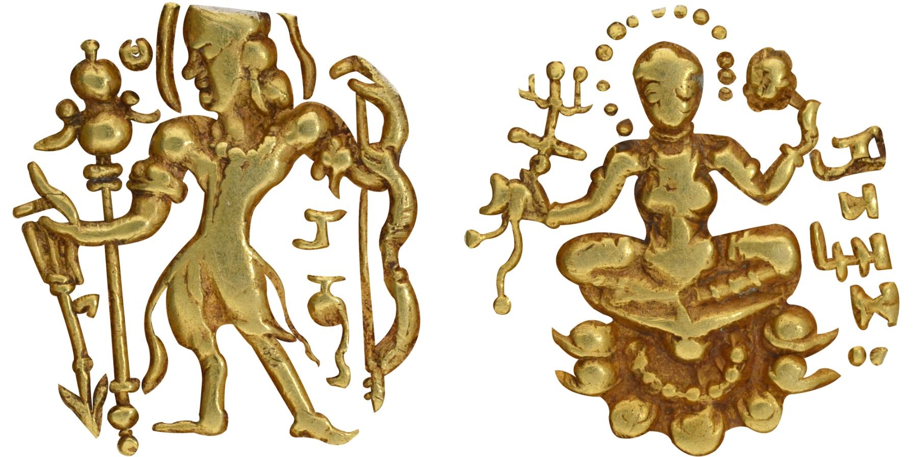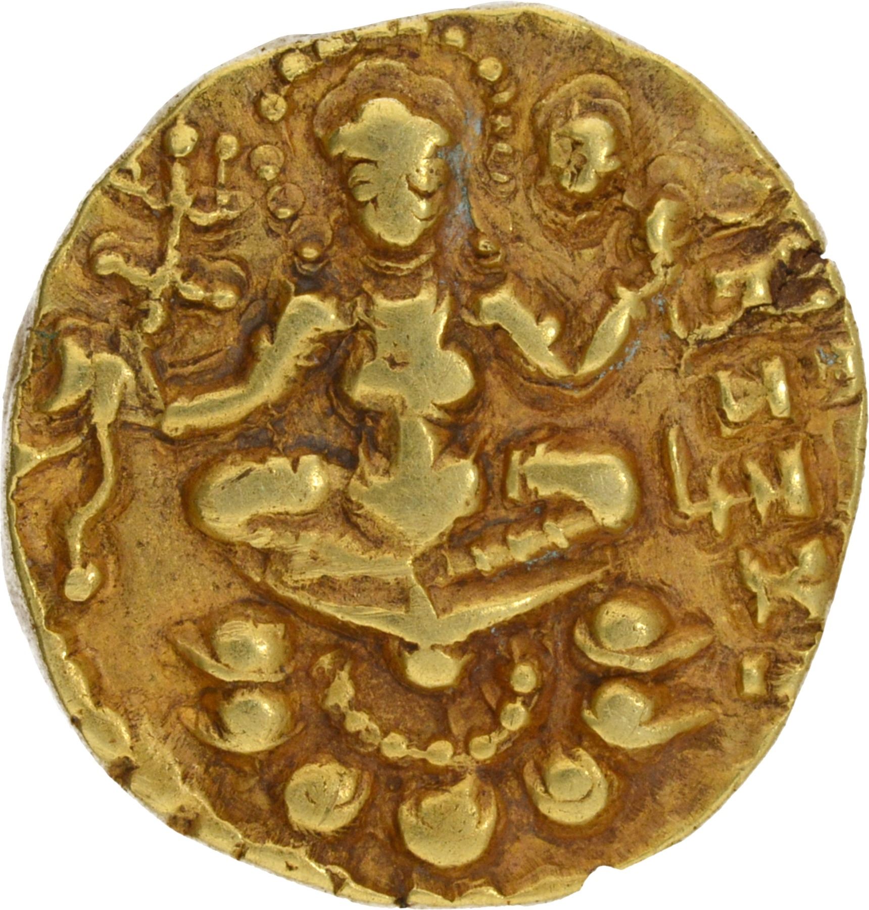 Note: This is an interesting specimen where the noose held by the Queen appears as Lord Ganesha in its stylized depiction. This gorgeous coin is fully struck with complete figures of the bow, arrow, standard, lotus, King, and Queen clearly visible on both sides.