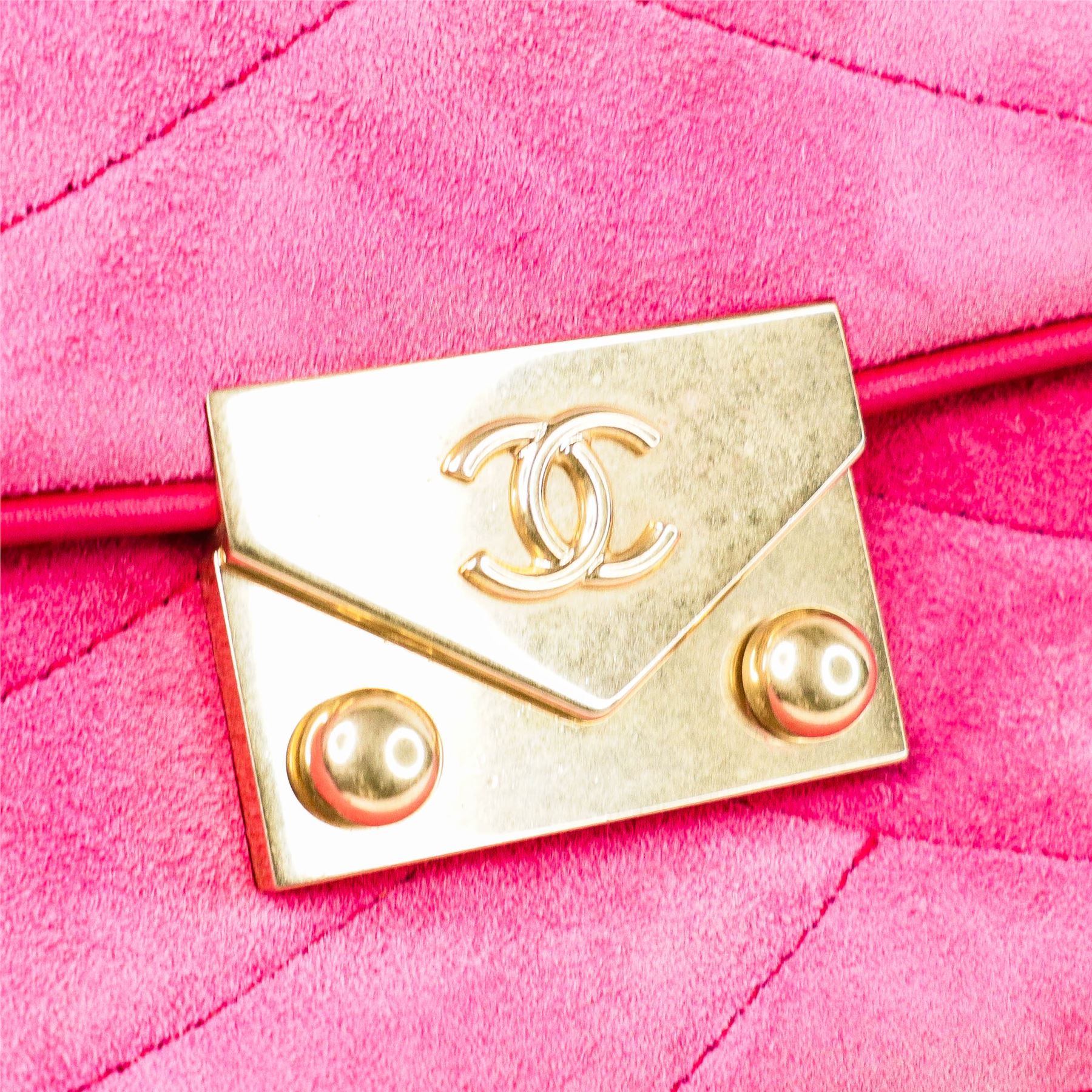 Crafted in pink suede with tonal leather trim, featuring wave-pattern quilting and a gold-tone pushlock CC closure