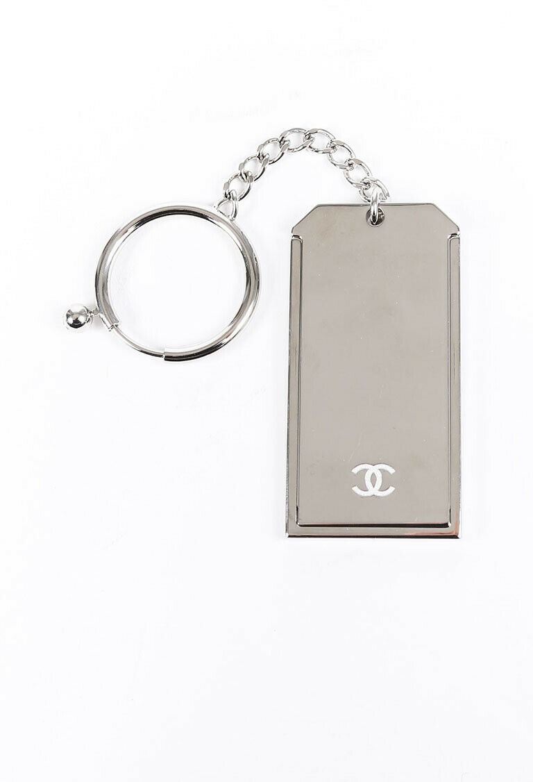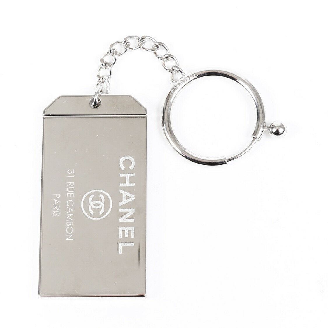 Chanel silver tone metal Rue Cambon CC bag charm features a clasp fastening.
