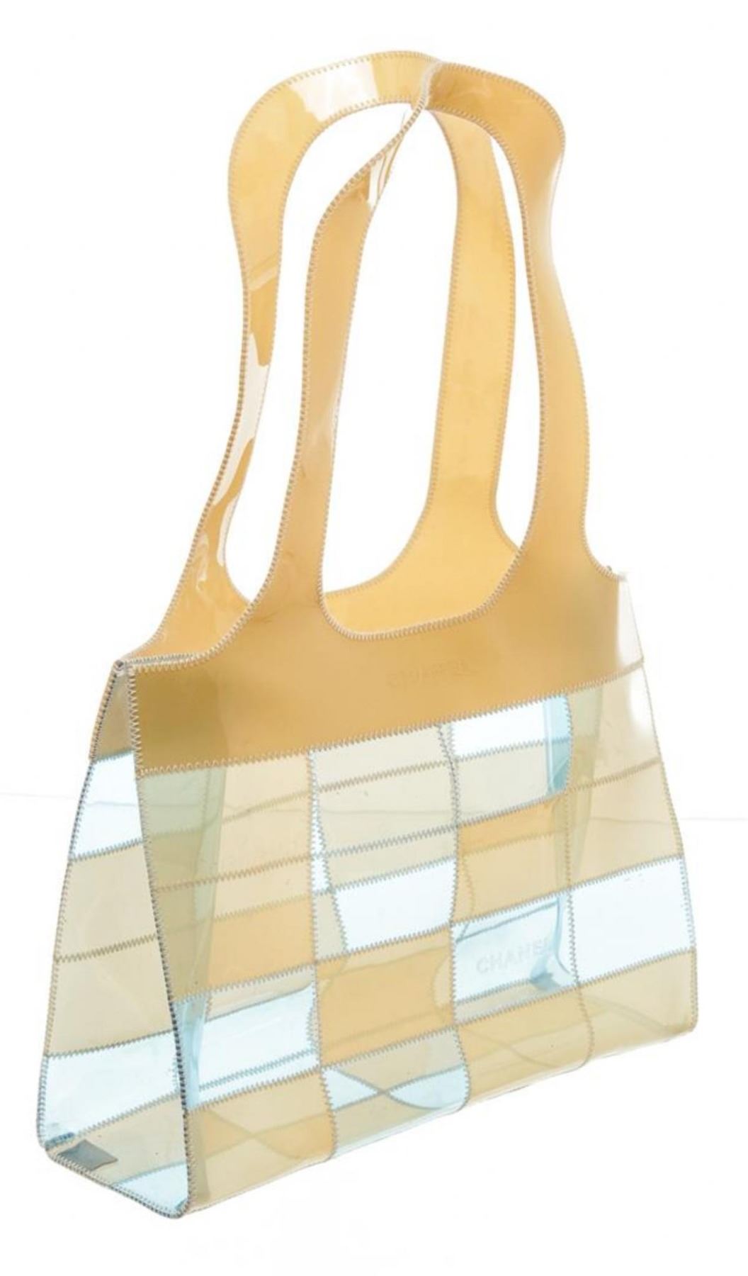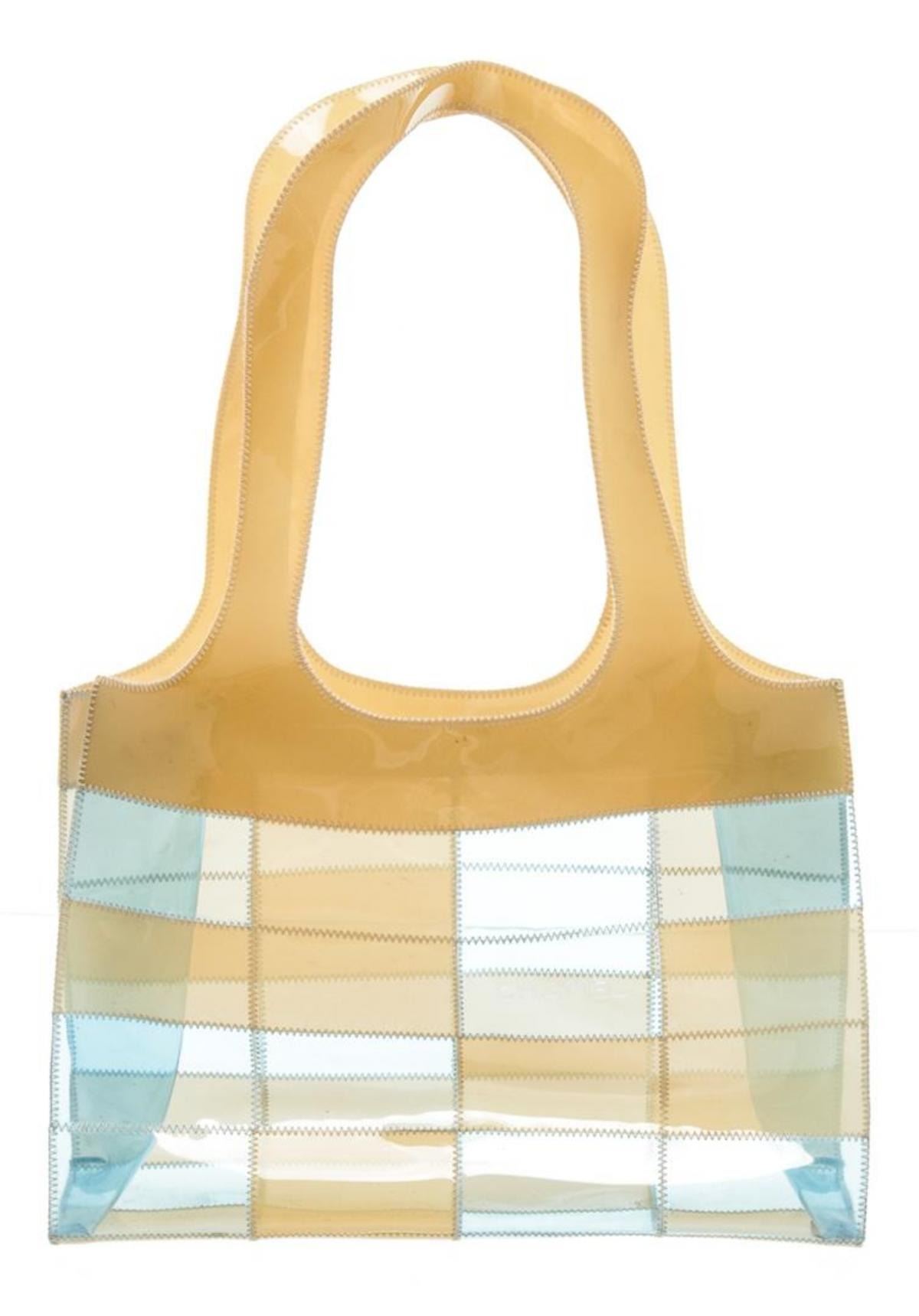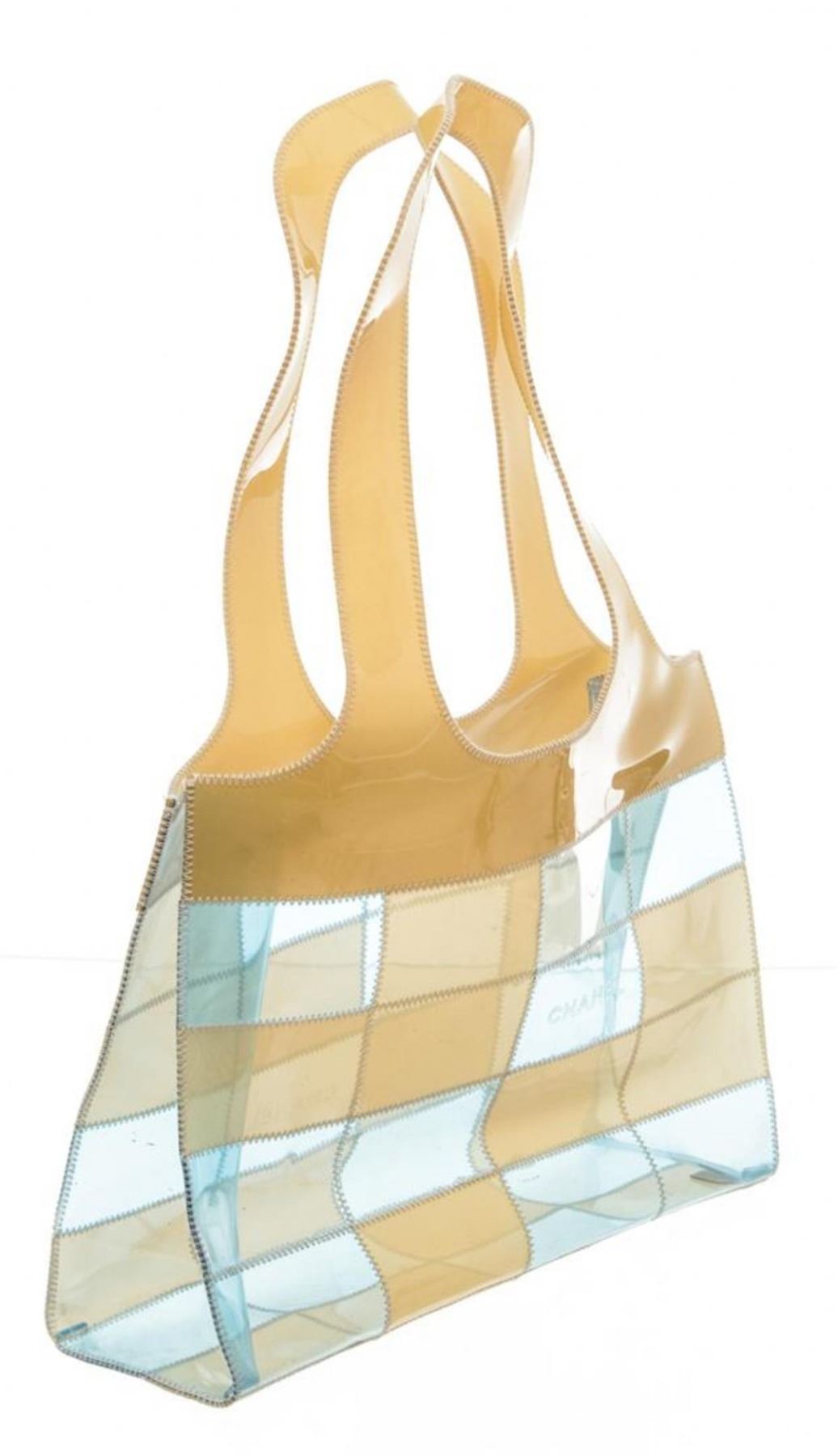 One Chanel Beige Blue Clear Vinyl Patchwork Shoulder Bag. Clear, beige and blue Chanel Vinyl Patchwork shoulder bag tote. CON
