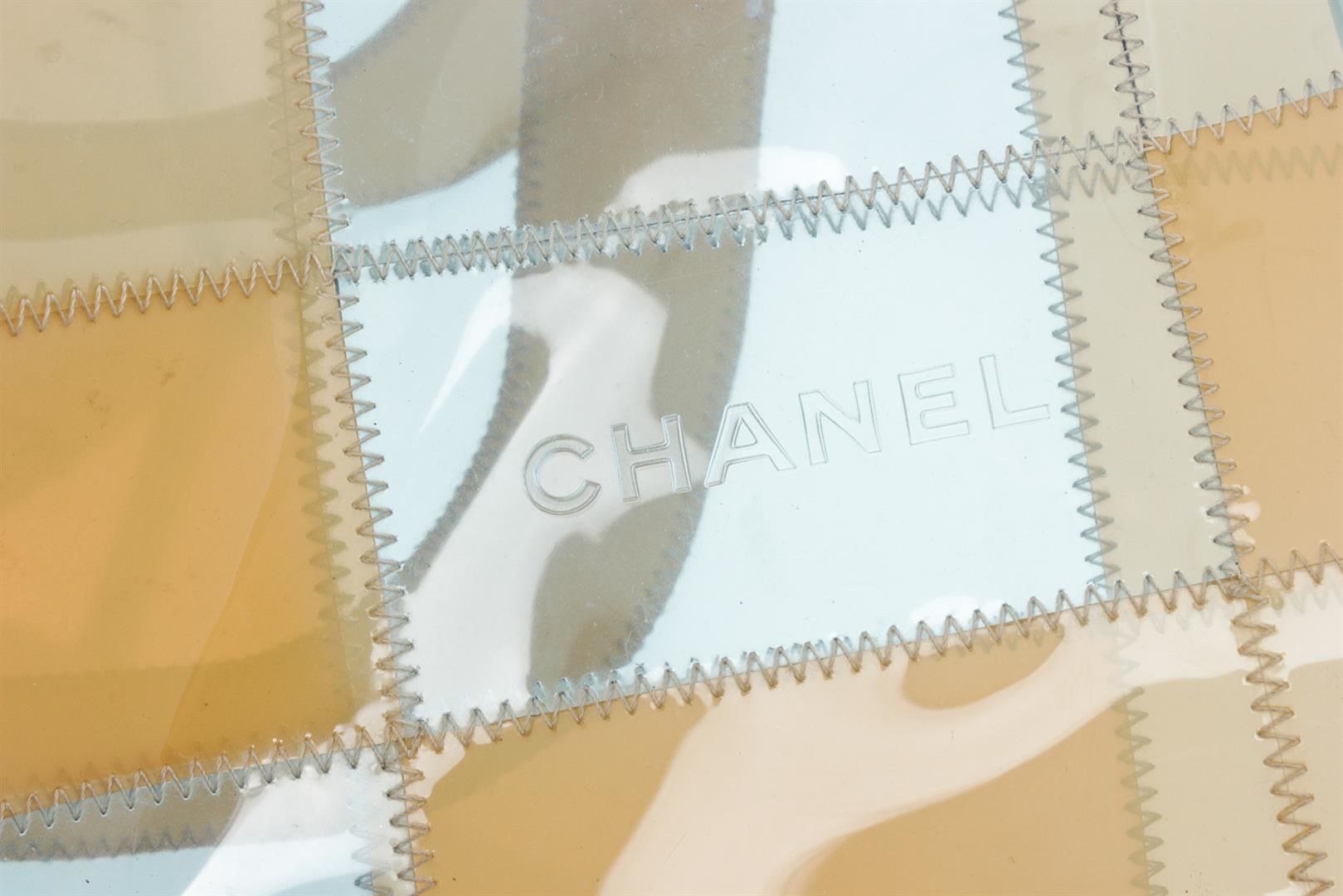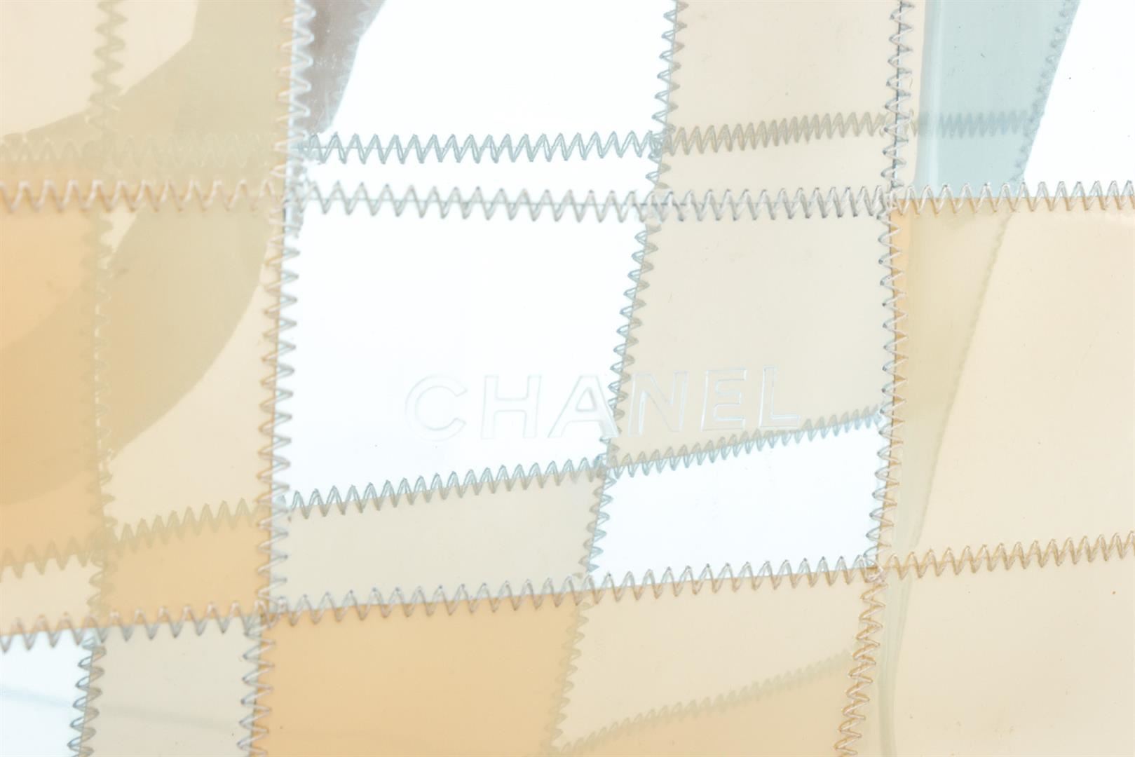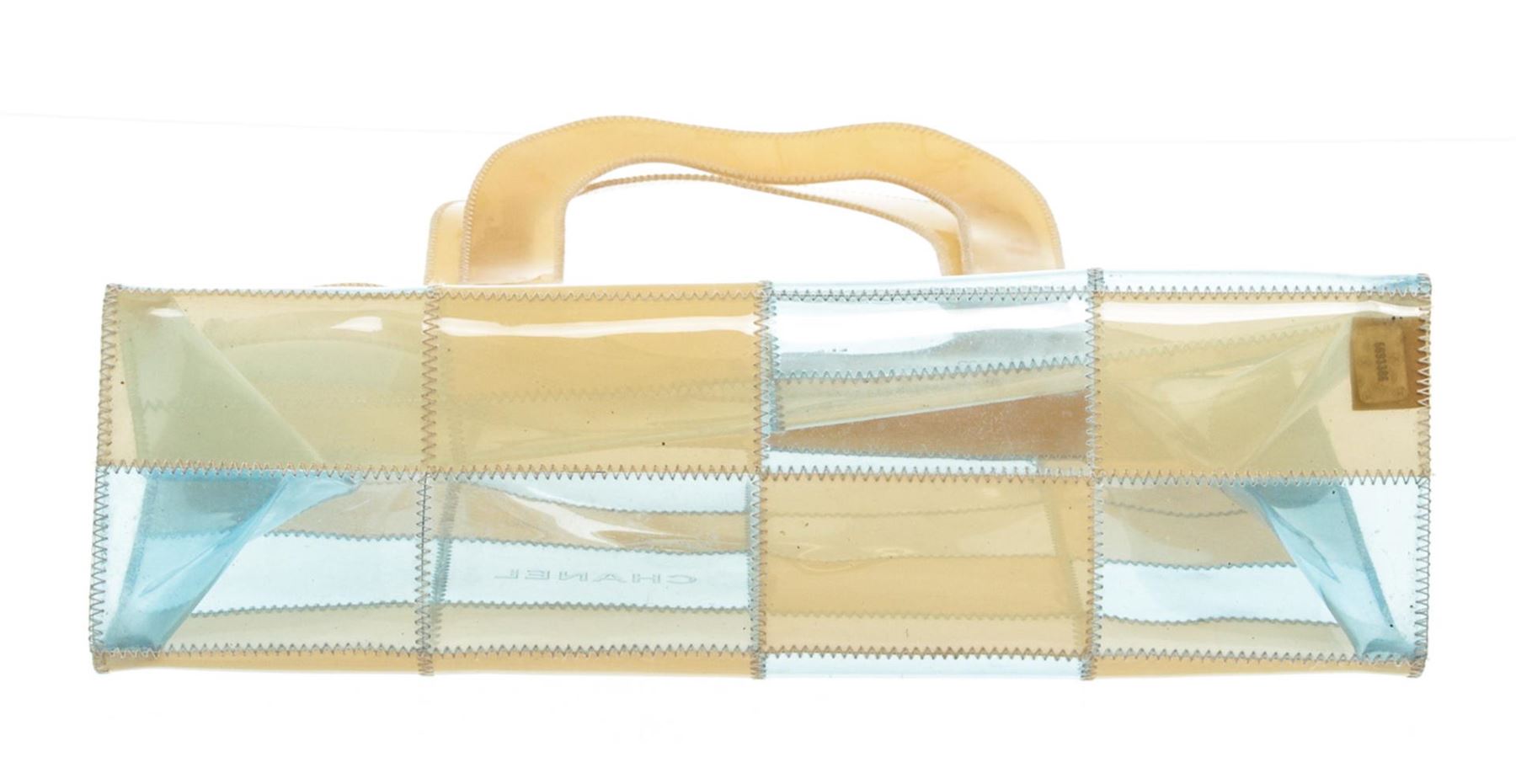 One Chanel Beige Blue Clear Vinyl Patchwork Shoulder Bag. Clear, beige and blue Chanel Vinyl Patchwork shoulder bag tote. CON