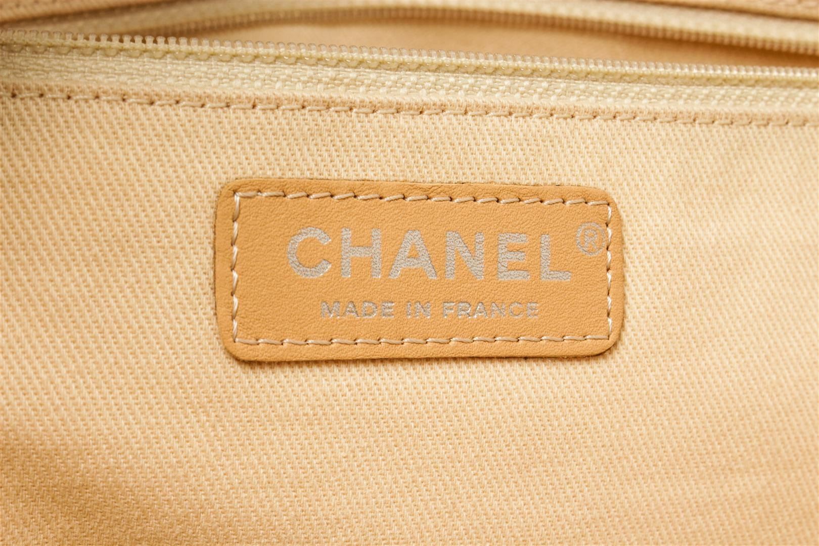 Chanel Beige Canvas CC Camelia Shoulder Bag. All available information is listed in the description and shown in the photos. Chanel beige canvas CC camelia shoulder bag with beige canvas exterior, beige leather straps, open top, silver-tone hardware, beige fabric lining, and two interior pockets: one zip, one slip. There are some stains on the exterior canvas as shown in pictures. Height: 11.81" Width: 20.47" Depth: 7.48", Shoulder Handle Drop: 15.35" / 30 x 52 x 19 Cm