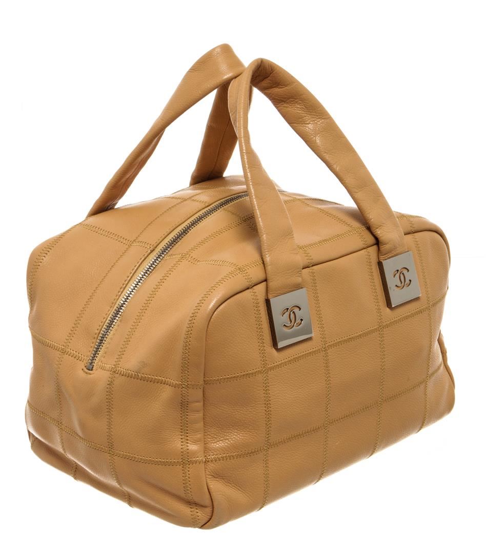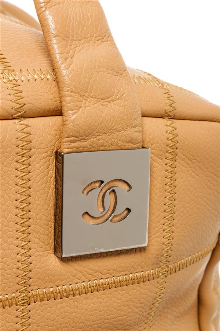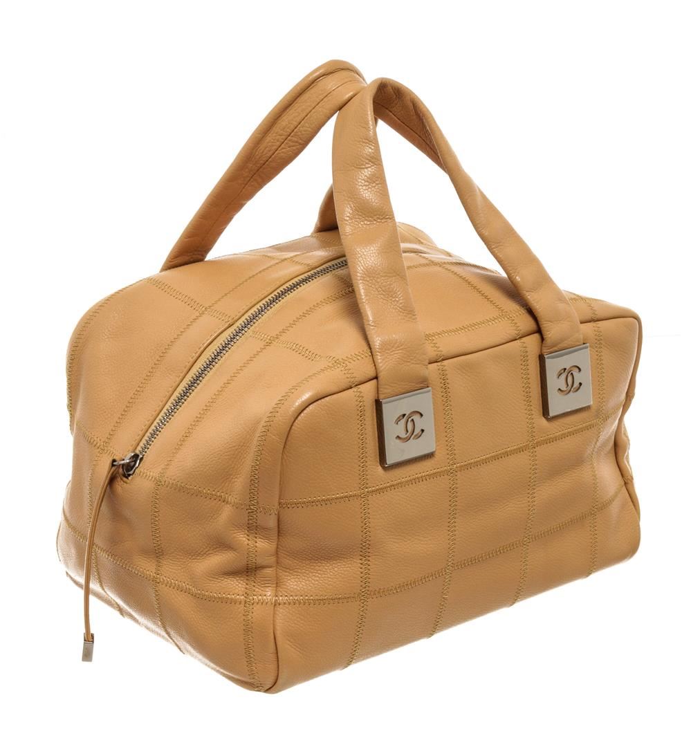 One Chanel Beige Caviar Chocolate Bar Boston Bag. Item is sold AS-IS. All available information is listed in the description and shown in the photo. Chanel Beige Caviar Chocolate Bar Boston Bag with silver-tone hardware, foot base, CC logo on a squared metal, wild stitch on the exterior, beige fabric lining with printed Chanel scripted logo, dual flat leather handles, and zip closure at the top. .