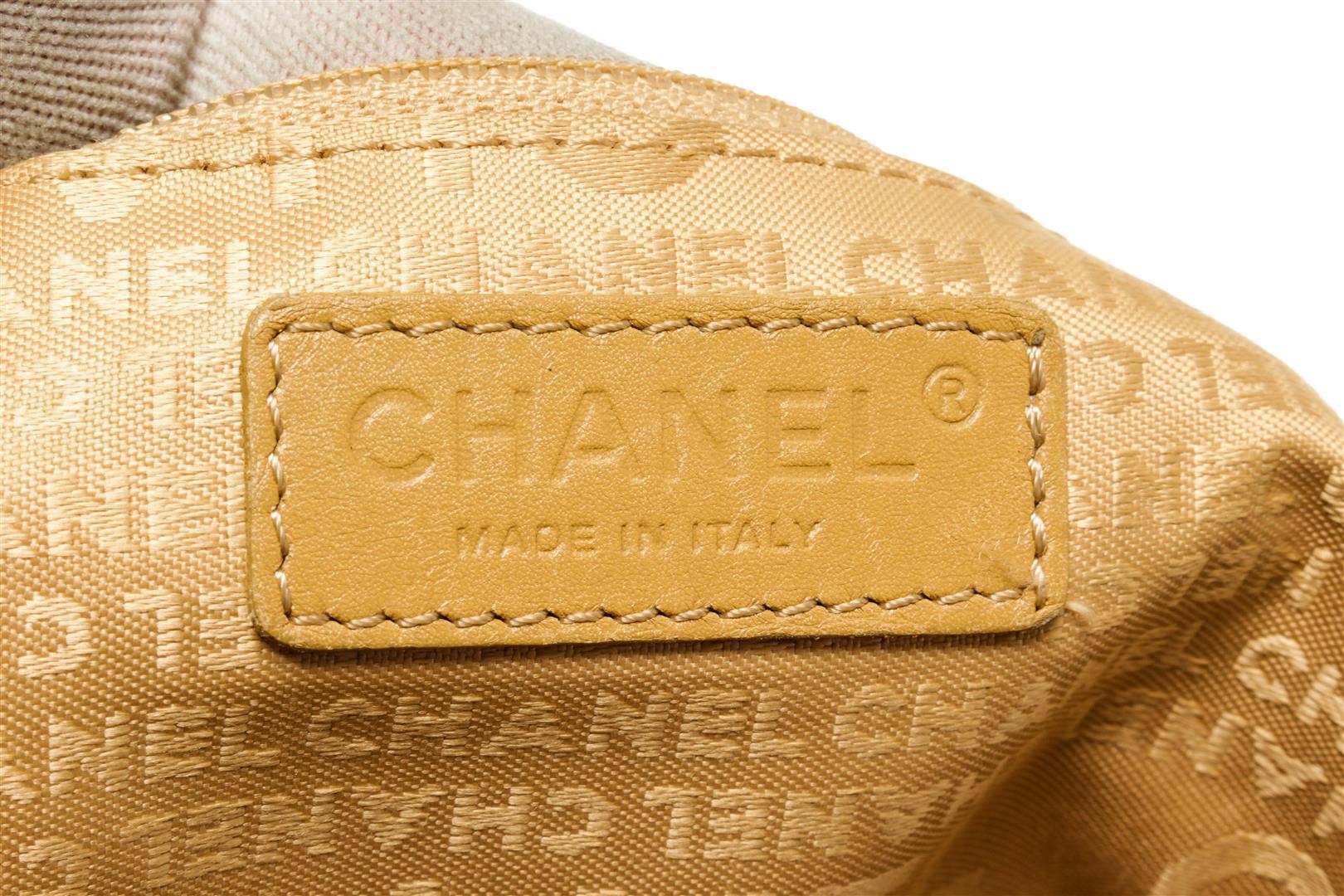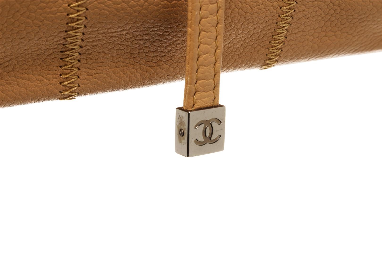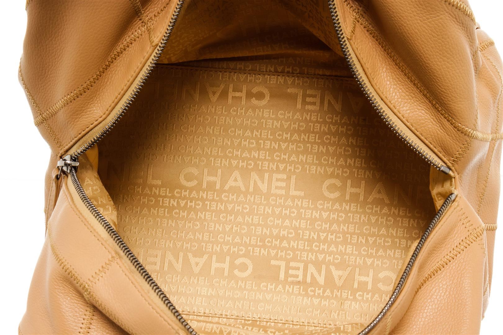 One Chanel Beige Caviar Chocolate Bar Boston Bag. Item is sold AS-IS. All available information is listed in the description and shown in the photo. Chanel Beige Caviar Chocolate Bar Boston Bag with silver-tone hardware, foot base, CC logo on a squared metal, wild stitch on the exterior, beige fabric lining with printed Chanel scripted logo, dual flat leather handles, and zip closure at the top. .