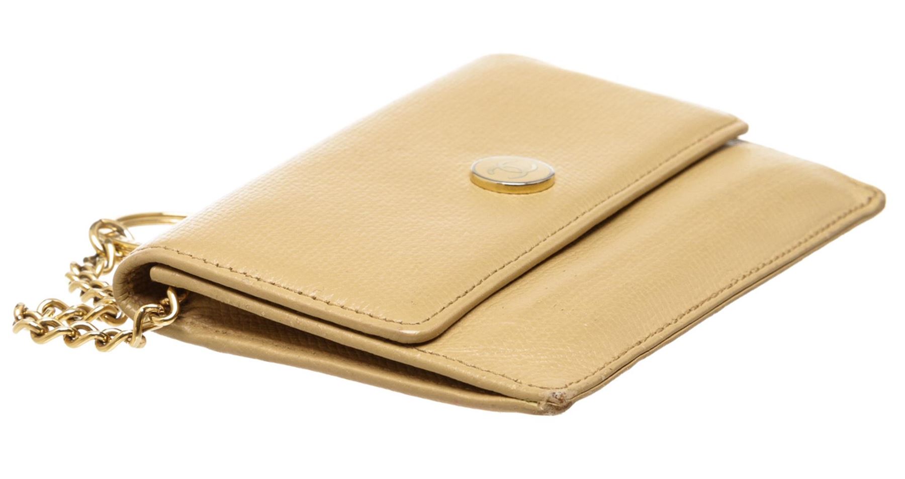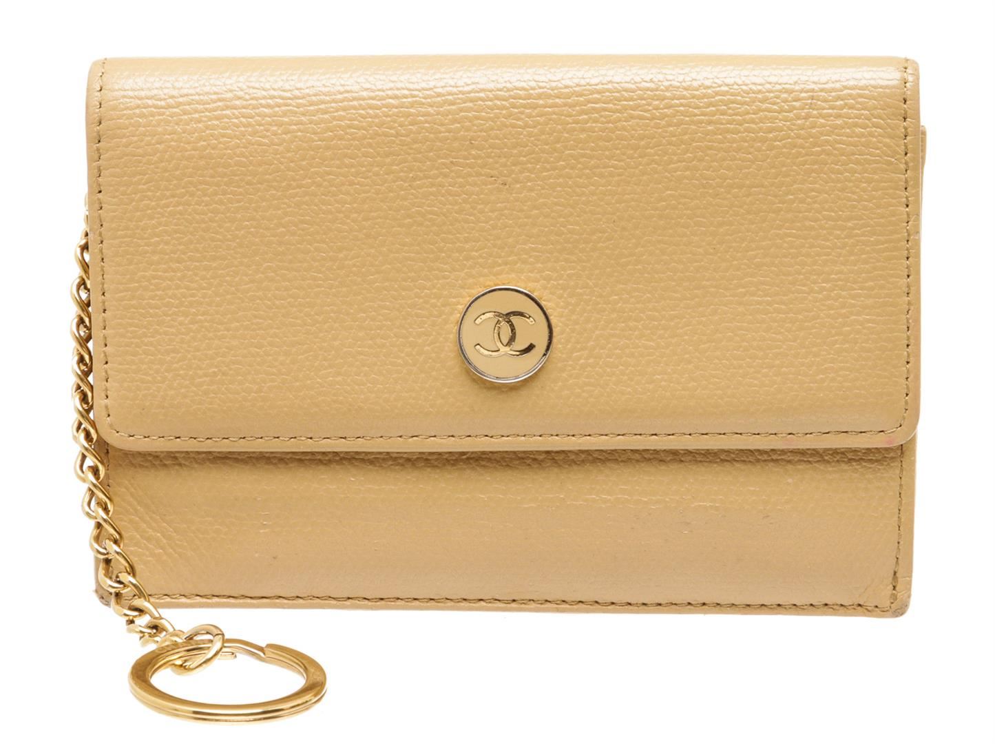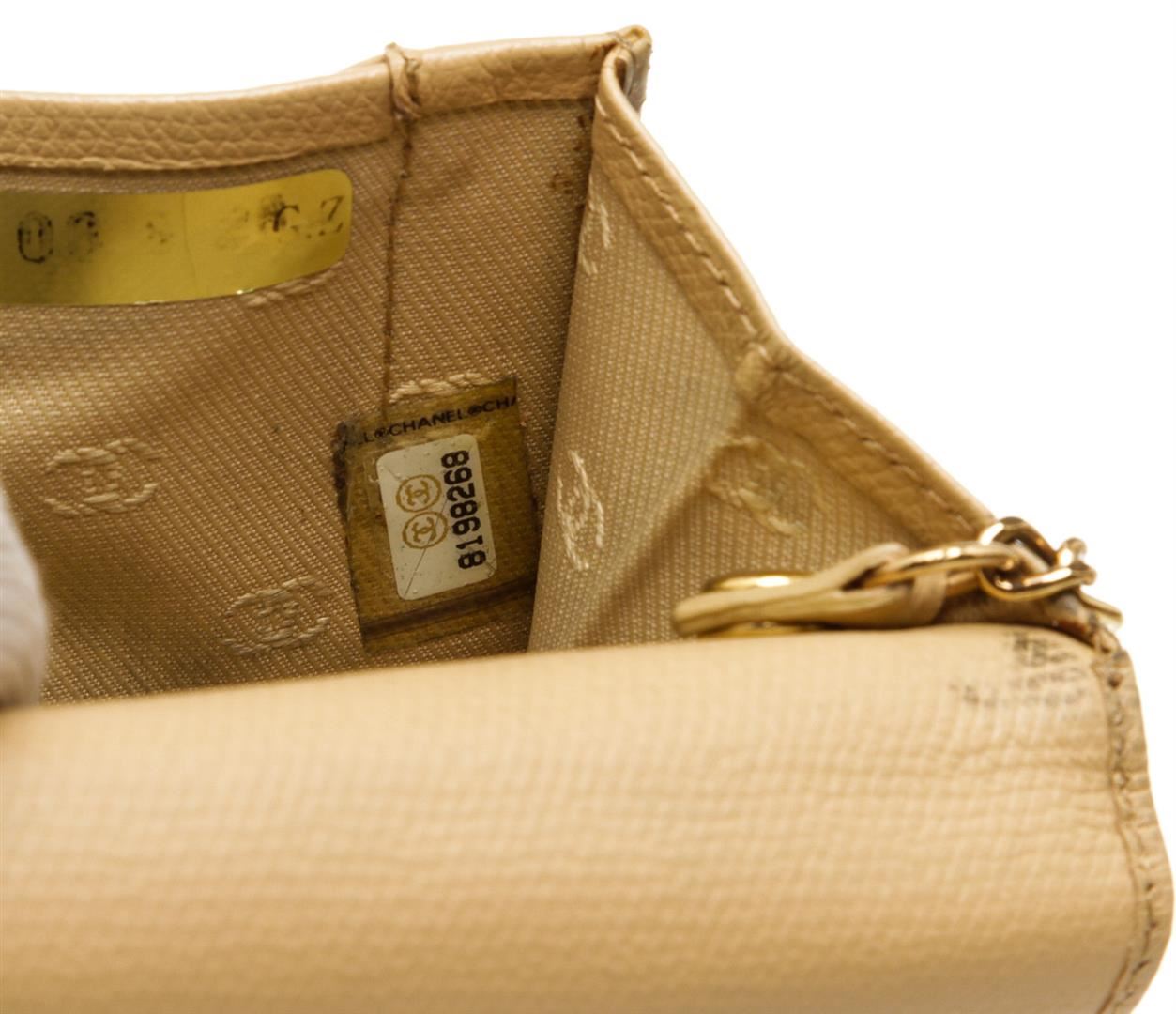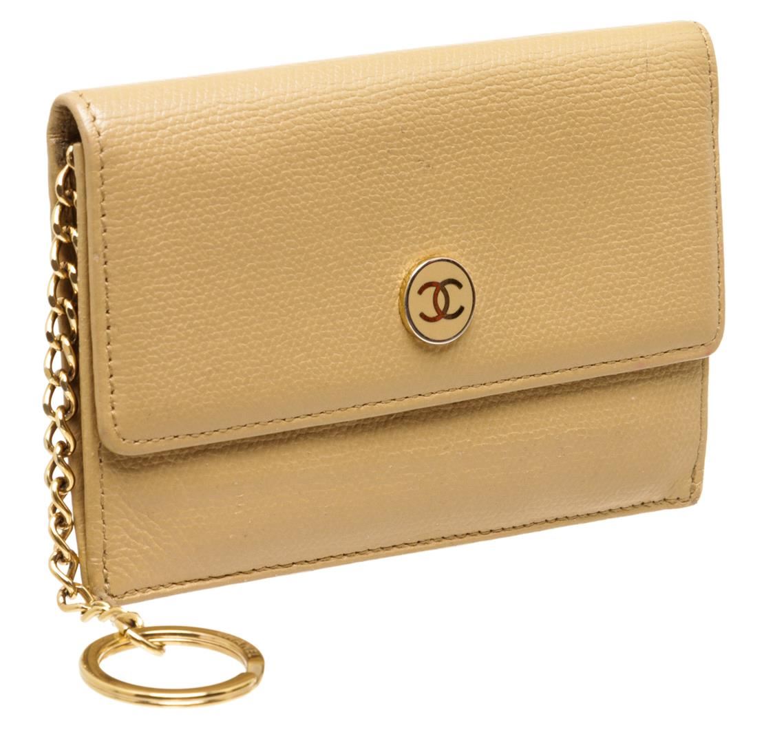 One Chanel Beige Leather Coin Purse Keychain. Chanel Beige Caviar Grained Leather Coin Purse with Key Chain features a pale gold-tone CC logo on the front snap closure, zippered back pocket and O-ring keychain.