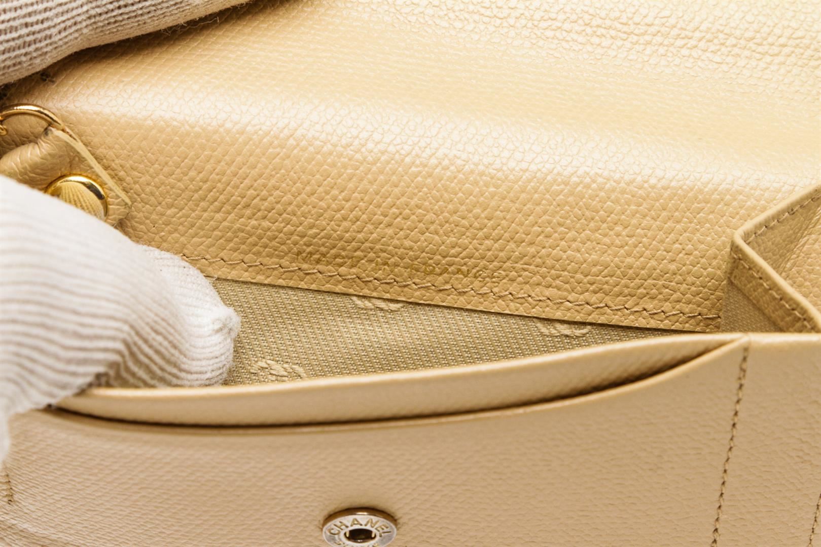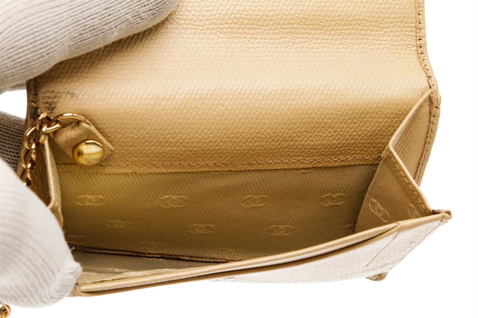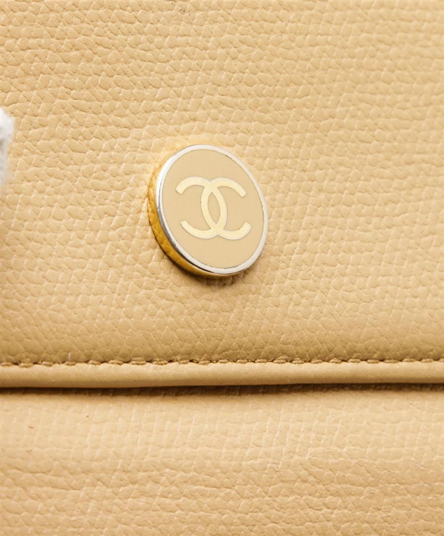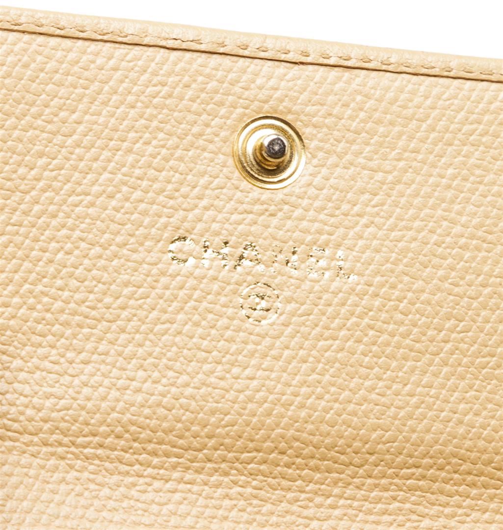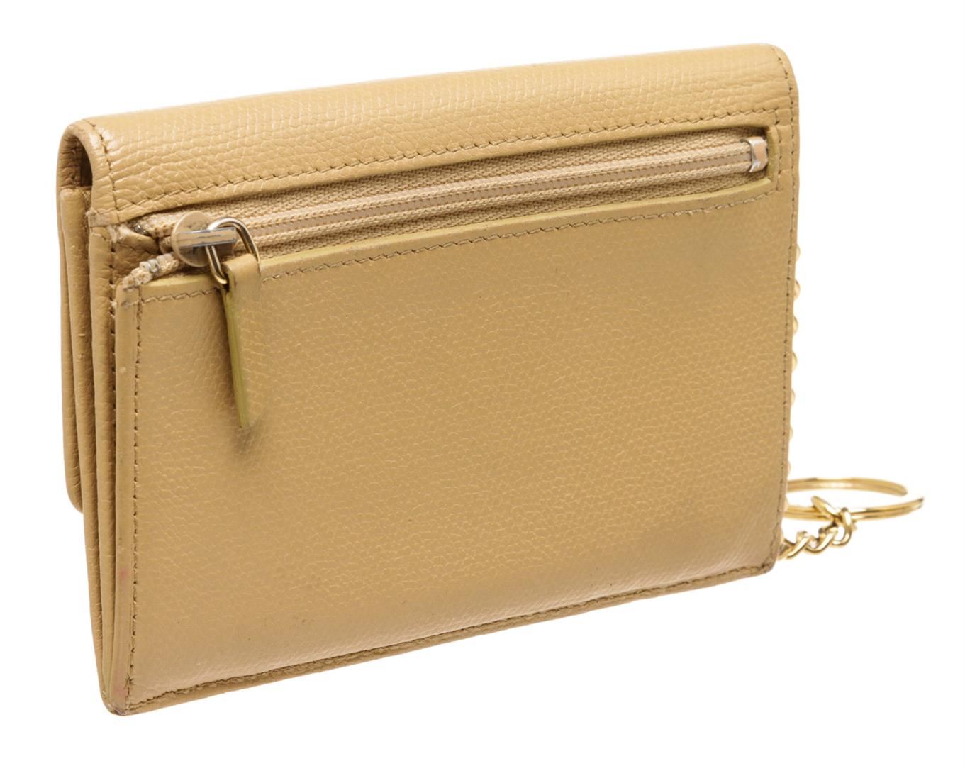 One Chanel Beige Leather Coin Purse Keychain. Chanel Beige Caviar Grained Leather Coin Purse with Key Chain features a pale gold-tone CC logo on the front snap closure, zippered back pocket and O-ring keychain.