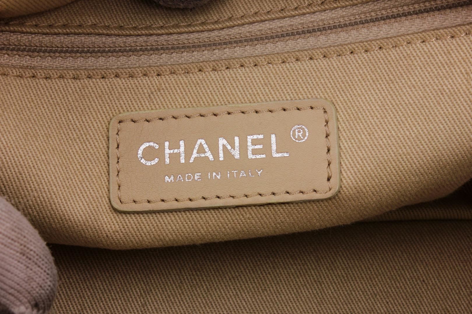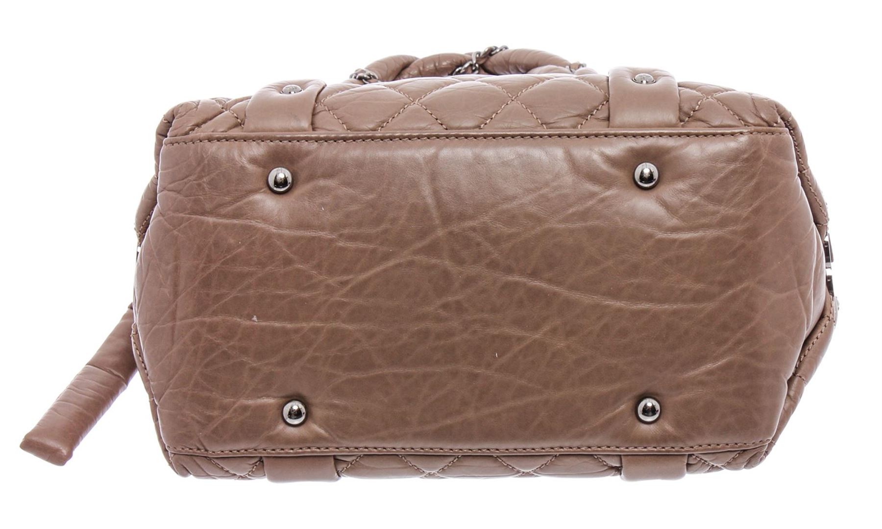 Beige quilted lambskin leather Chanel Small Lady Braid Bowler bag with ruthenium hardware, dual braided shoulder straps featuring chain-link accents, logo hardware at sides, protective feet at base, single zip pocket at interior wall and zip closure at top.