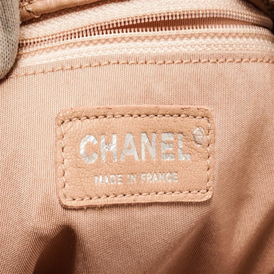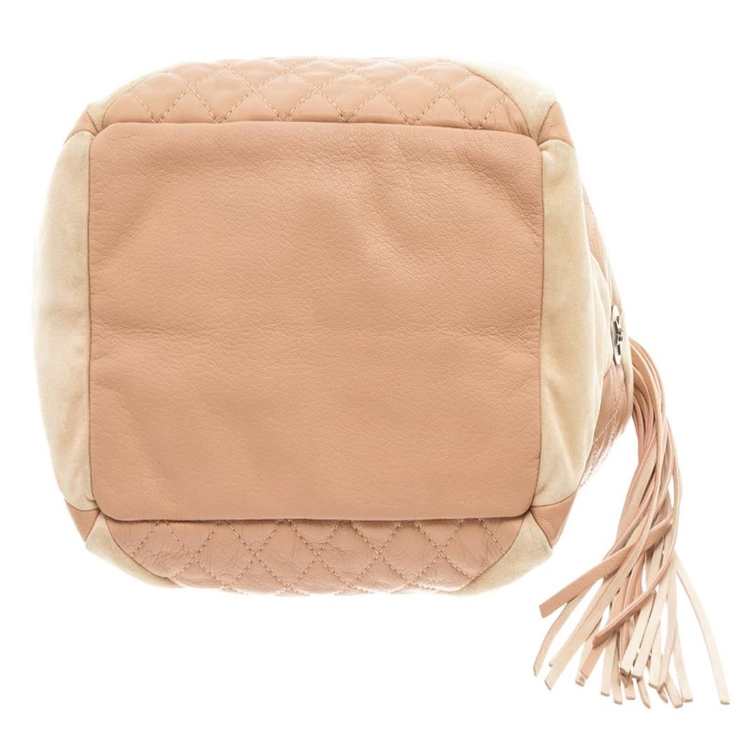 Chanel Beige Quilted Leather Tassel Drawstring Bag. All available information is listed in the description and shown in the photos. Chanel beige quilted leather tassel drawstring bag with two-toned leather exterior, pink fabric lining, tassel, an interlocking CC logo with stars, chain and leather strap with a leather shoulder pad, drawstring closure, silver-tone hardware, and one interior zip pocket.