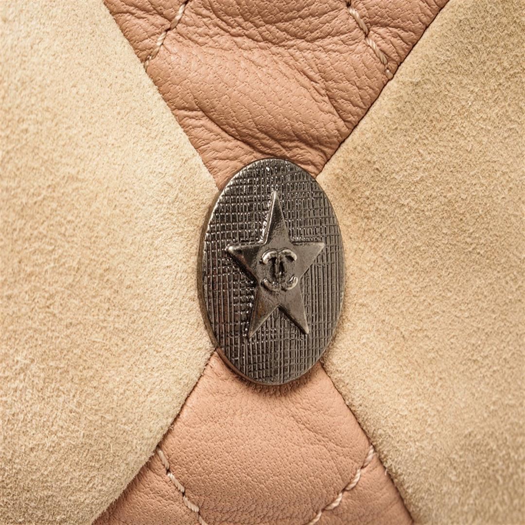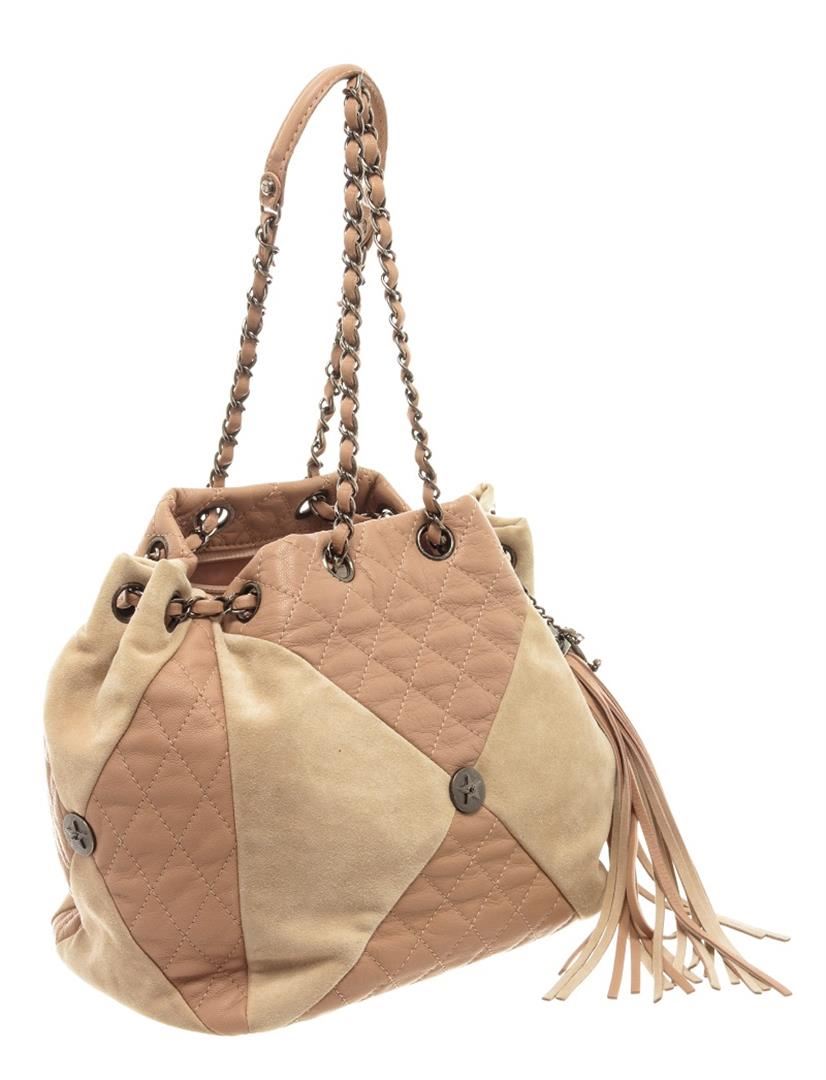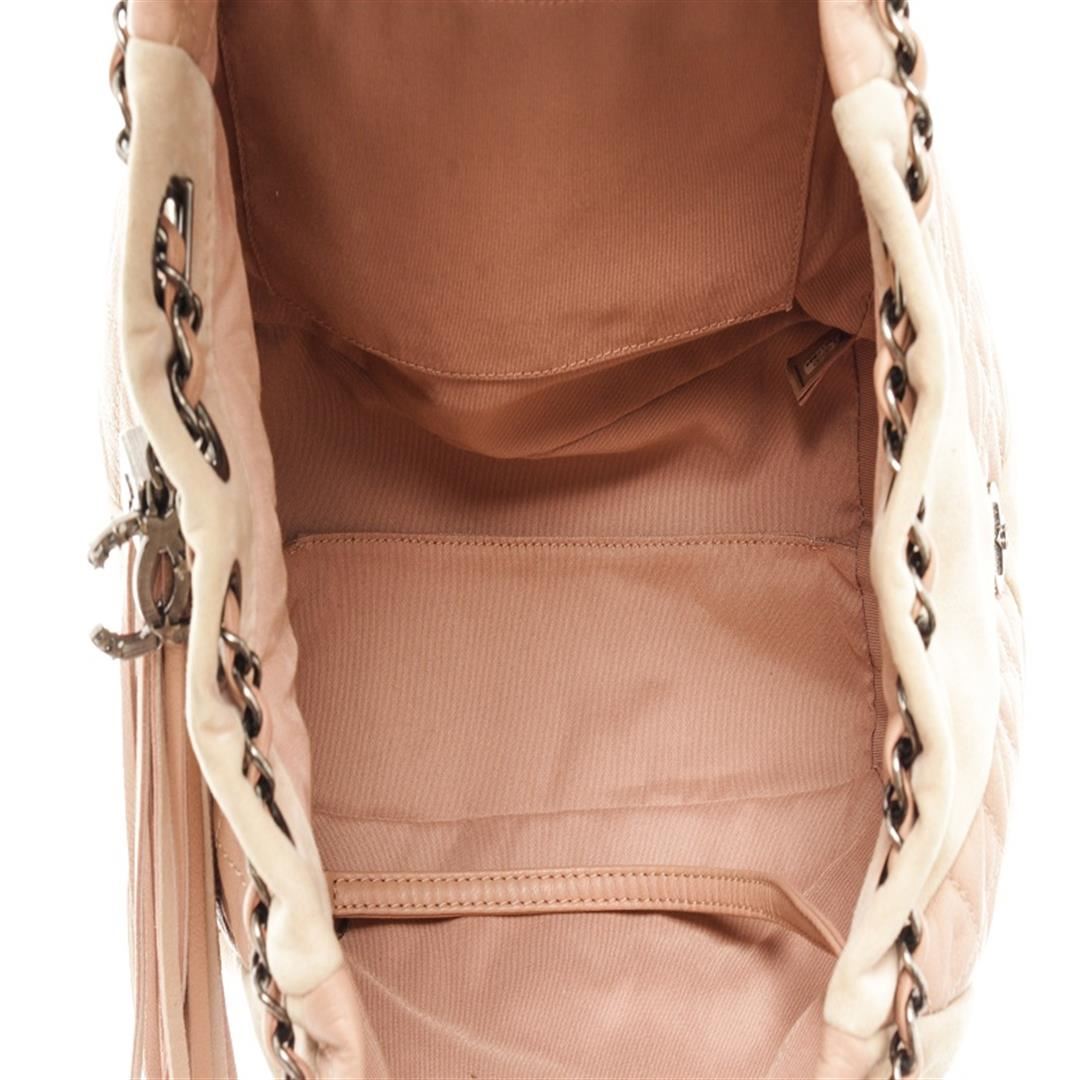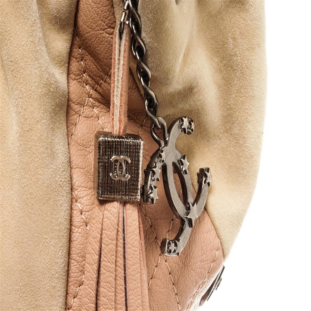 Chanel Beige Quilted Leather Tassel Drawstring Bag. All available information is listed in the description and shown in the photos. Chanel beige quilted leather tassel drawstring bag with two-toned leather exterior, pink fabric lining, tassel, an interlocking CC logo with stars, chain and leather strap with a leather shoulder pad, drawstring closure, silver-tone hardware, and one interior zip pocket.