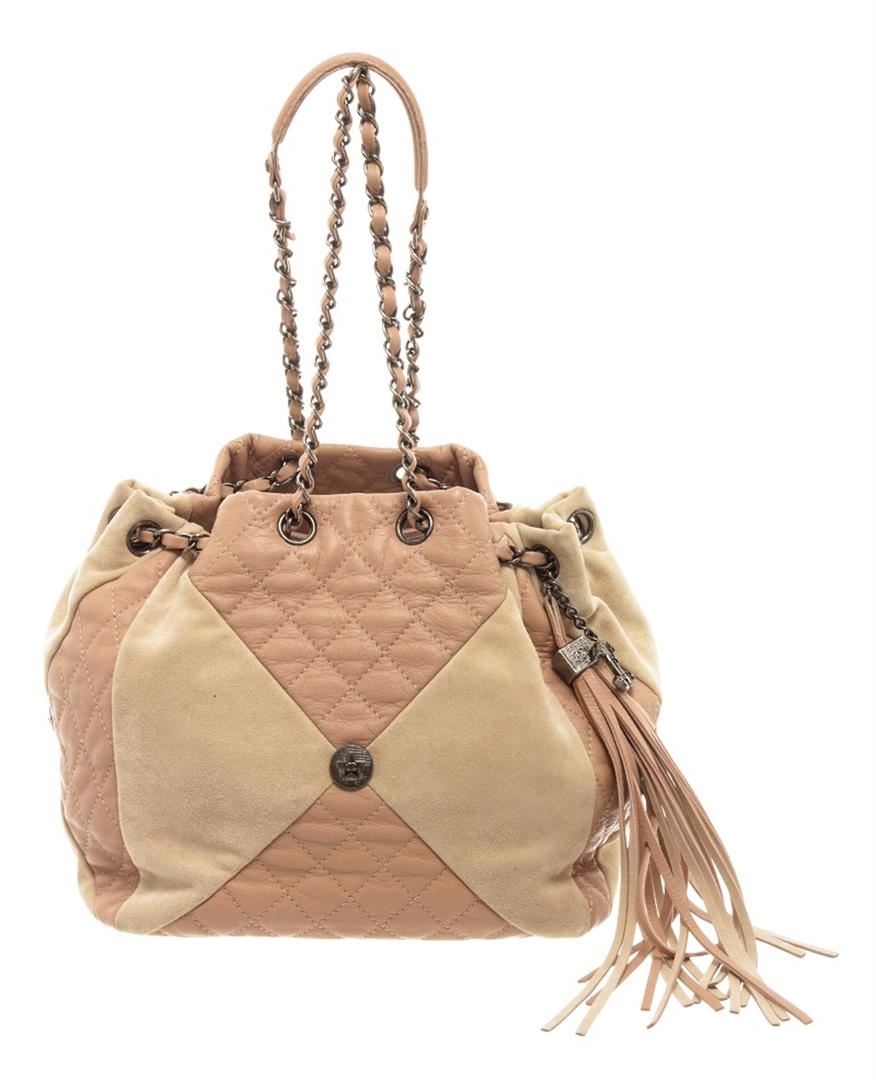 Chanel Beige Quilted Leather Tassel Drawstring Bag. All available information is listed in the description and shown in the photos. Chanel beige quilted leather tassel drawstring bag with two-toned leather exterior, pink fabric lining, tassel, an interlocking CC logo with stars, chain and leather strap with a leather shoulder pad, drawstring closure, silver-tone hardware, and one interior zip pocket.