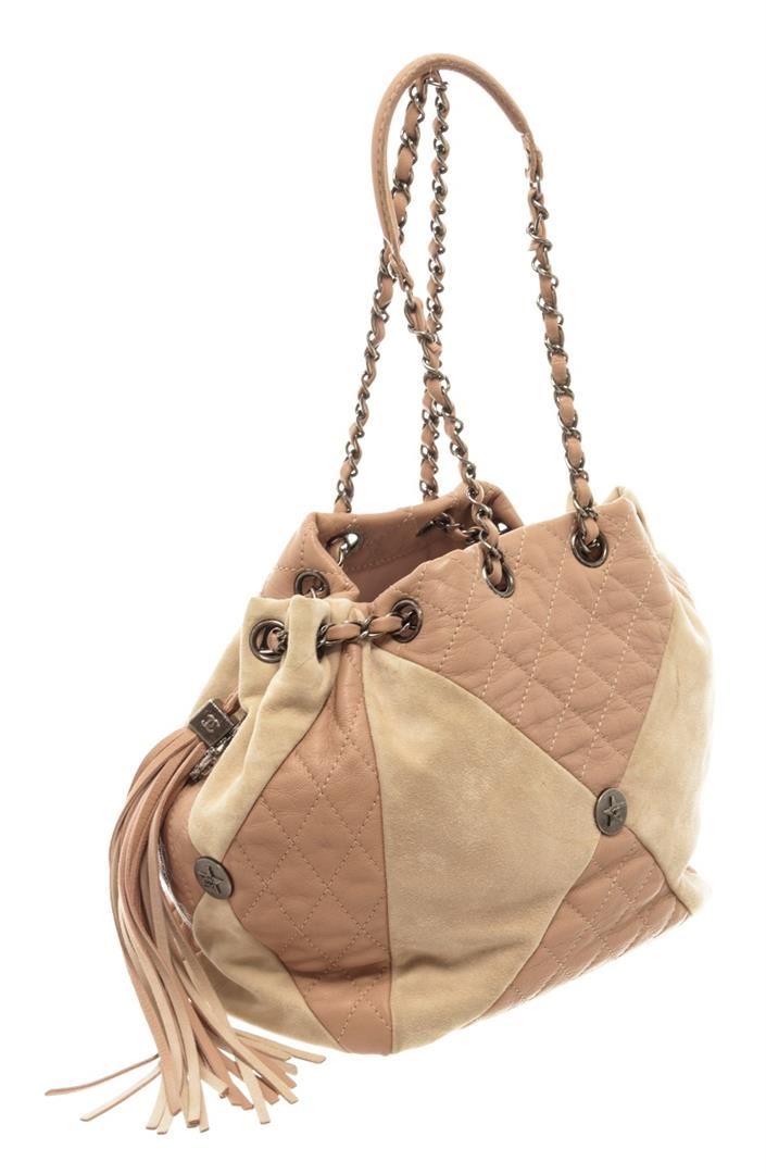 Chanel Beige Quilted Leather Tassel Drawstring Bag. All available information is listed in the description and shown in the photos. Chanel beige quilted leather tassel drawstring bag with two-toned leather exterior, pink fabric lining, tassel, an interlocking CC logo with stars, chain and leather strap with a leather shoulder pad, drawstring closure, silver-tone hardware, and one interior zip pocket.