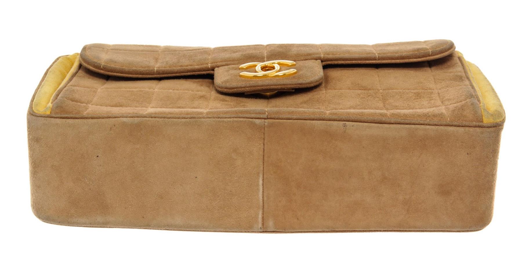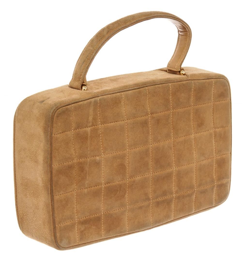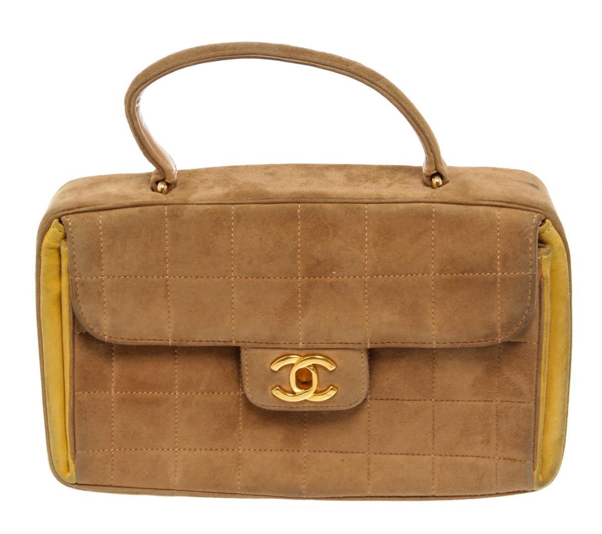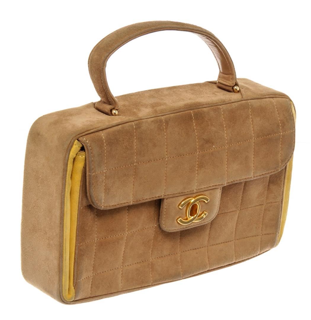 One Chanel Beige Quilted Suede Chocolate Bar CC Top Handle Bag (CC Snap Replaced). Item is sold AS-IS. All available information is listed in the description and shown in the photo. Chanel Chocolate Bar CC Top Handle Bag (CC Snap Replaced) is finely crafted of smooth suede leather in light beige with bright yellow accents. The bag features beige squared stitching and a polished interlocking CC gold-tone turn lock. This opens to a matching beige leather interior with a zipper pocket. Height: 5.75 in Width: 2.25 in Drop: 3 in Base Length: 9.25 in