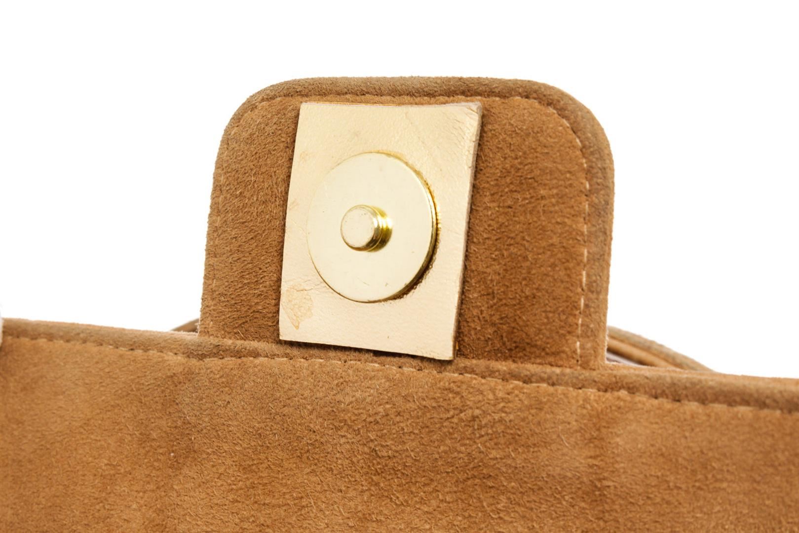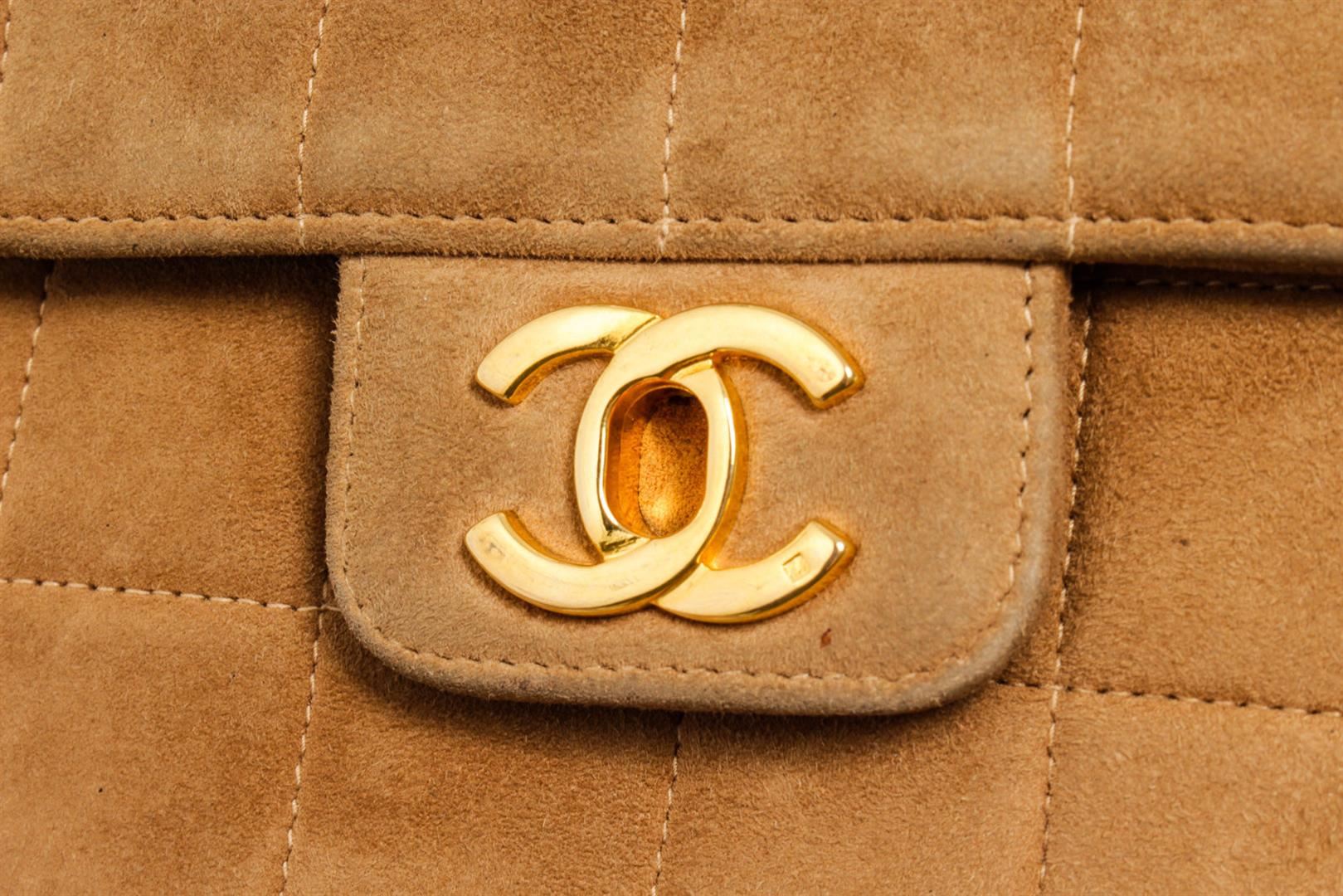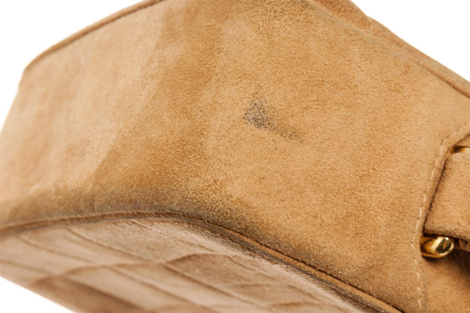 One Chanel Beige Quilted Suede Chocolate Bar CC Top Handle Bag (CC Snap Replaced). Item is sold AS-IS. All available information is listed in the description and shown in the photo. Chanel Chocolate Bar CC Top Handle Bag (CC Snap Replaced) is finely crafted of smooth suede leather in light beige with bright yellow accents. The bag features beige squared stitching and a polished interlocking CC gold-tone turn lock. This opens to a matching beige leather interior with a zipper pocket. Height: 5.75 in Width: 2.25 in Drop: 3 in Base Length: 9.25 in