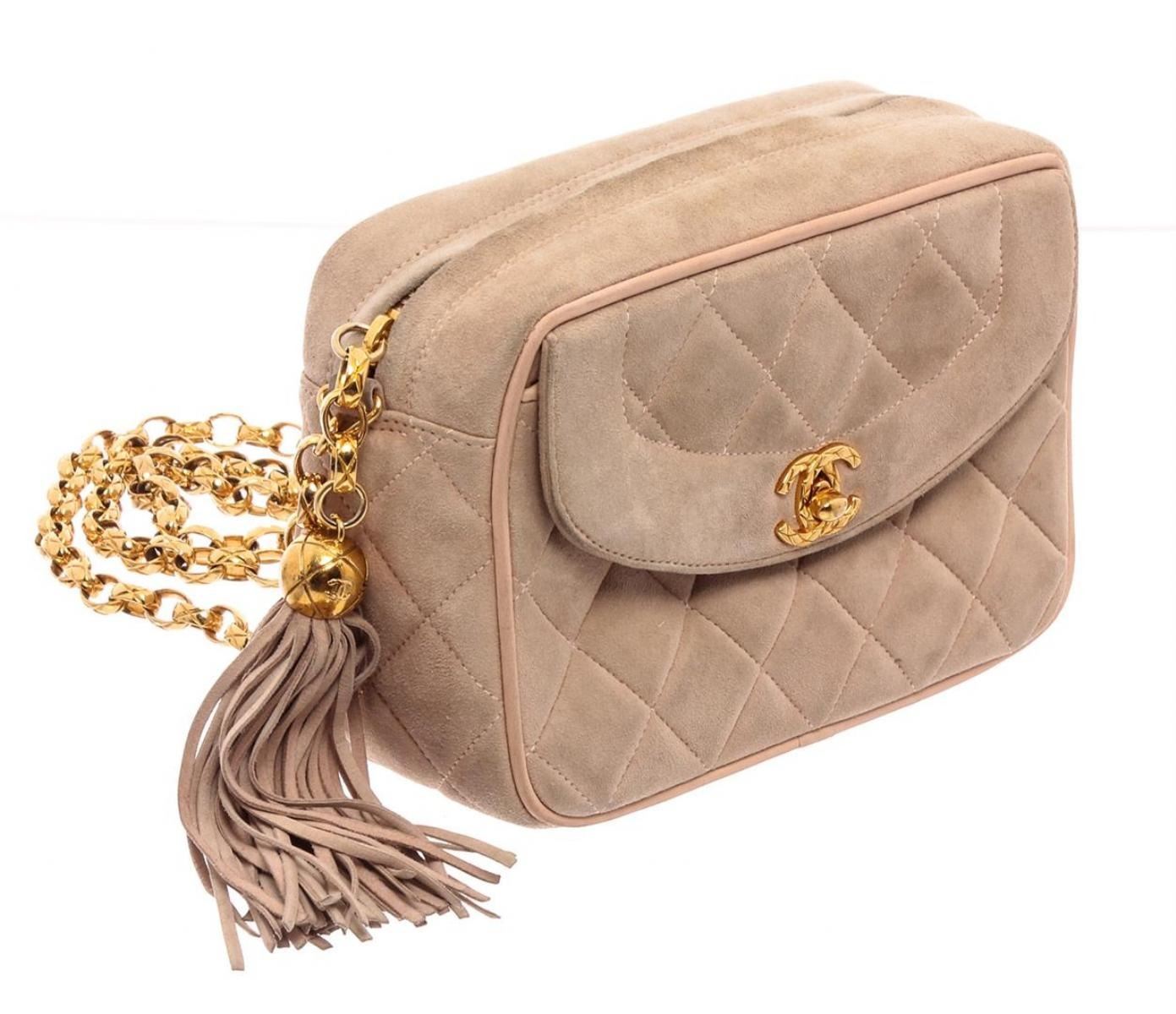 Beige quilted suede vintage Chanel camera bag with gold-tone hardware, single chain-link shoulder strap, flap pocket at front with CC logo turn-lock closure, beige leather interior, one zippered pocket and one slip pocket at interior wall, and zip closure with tassel embellishment at top.