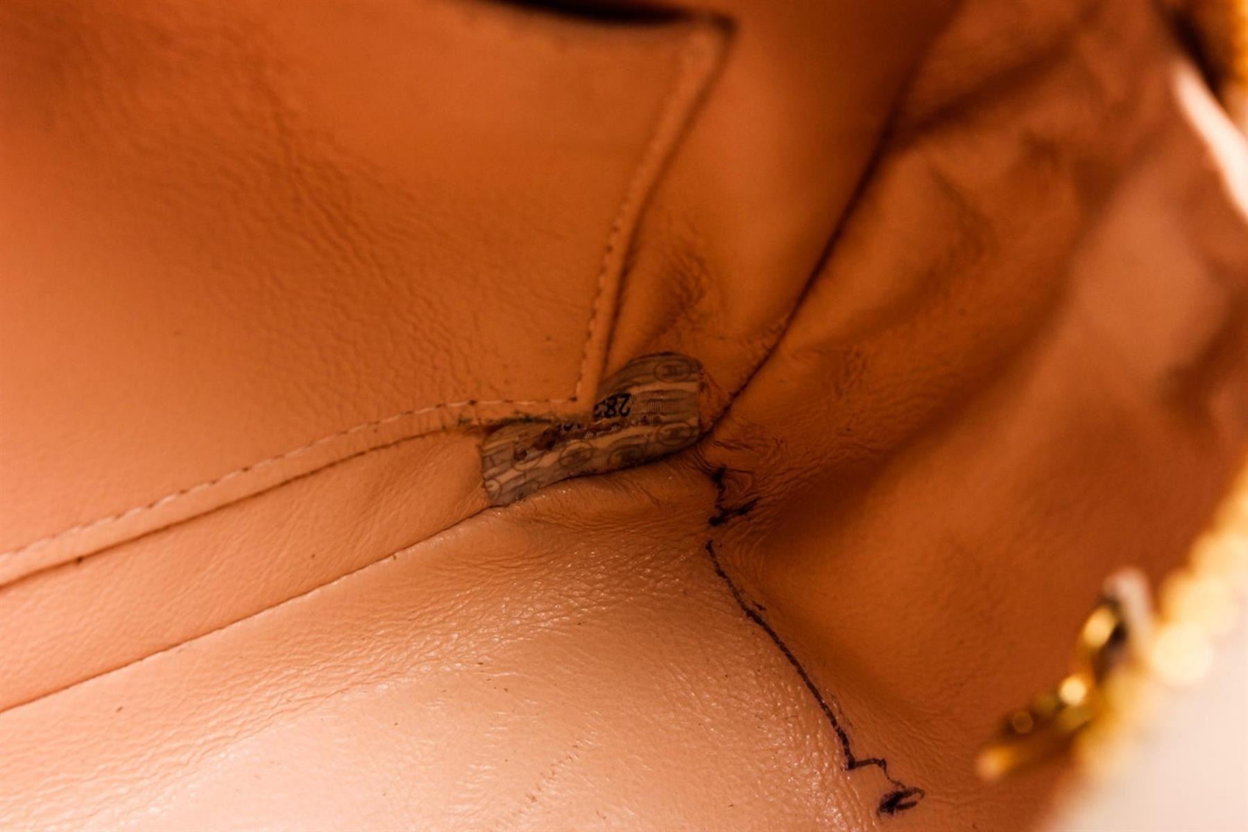 Beige quilted suede vintage Chanel camera bag with gold-tone hardware, single chain-link shoulder strap, flap pocket at front with CC logo turn-lock closure, beige leather interior, one zippered pocket and one slip pocket at interior wall, and zip closure with tassel embellishment at top.