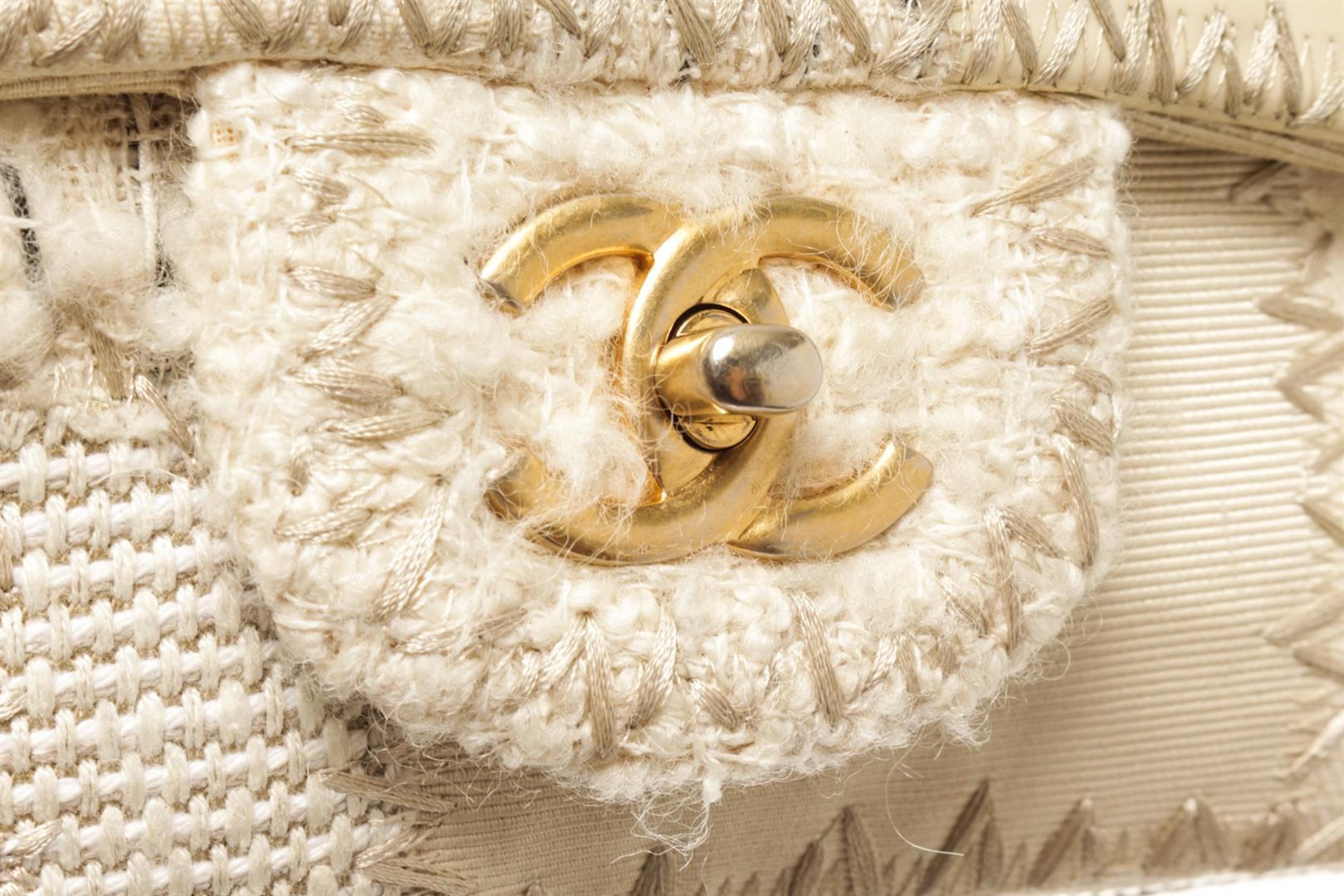 Chanel Beige White Canvas Tweed Medium Patchwork Jumbo Flap Shoulder Bag. All available information is listed in the description and shown in the photos. chanel beige white canvas tweedmedium patchwork jumbo flap shoulder bag 12"L x 3.25"W x 8"H / 30.48 x 8.25 x 20.32 CM
