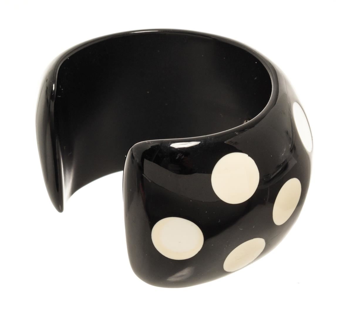 Chanel Black CC Polkadot Cuff Bracelet. All available information is listed in the description and shown in the photos. Chanel black CC polkadot cuff bracelet with black acrylic cream polka dots and silver-tone CC logo, with an authenticating logo on the interior. Measures 2 1/16 inches across interior opening, 1 5/8 inches wide.