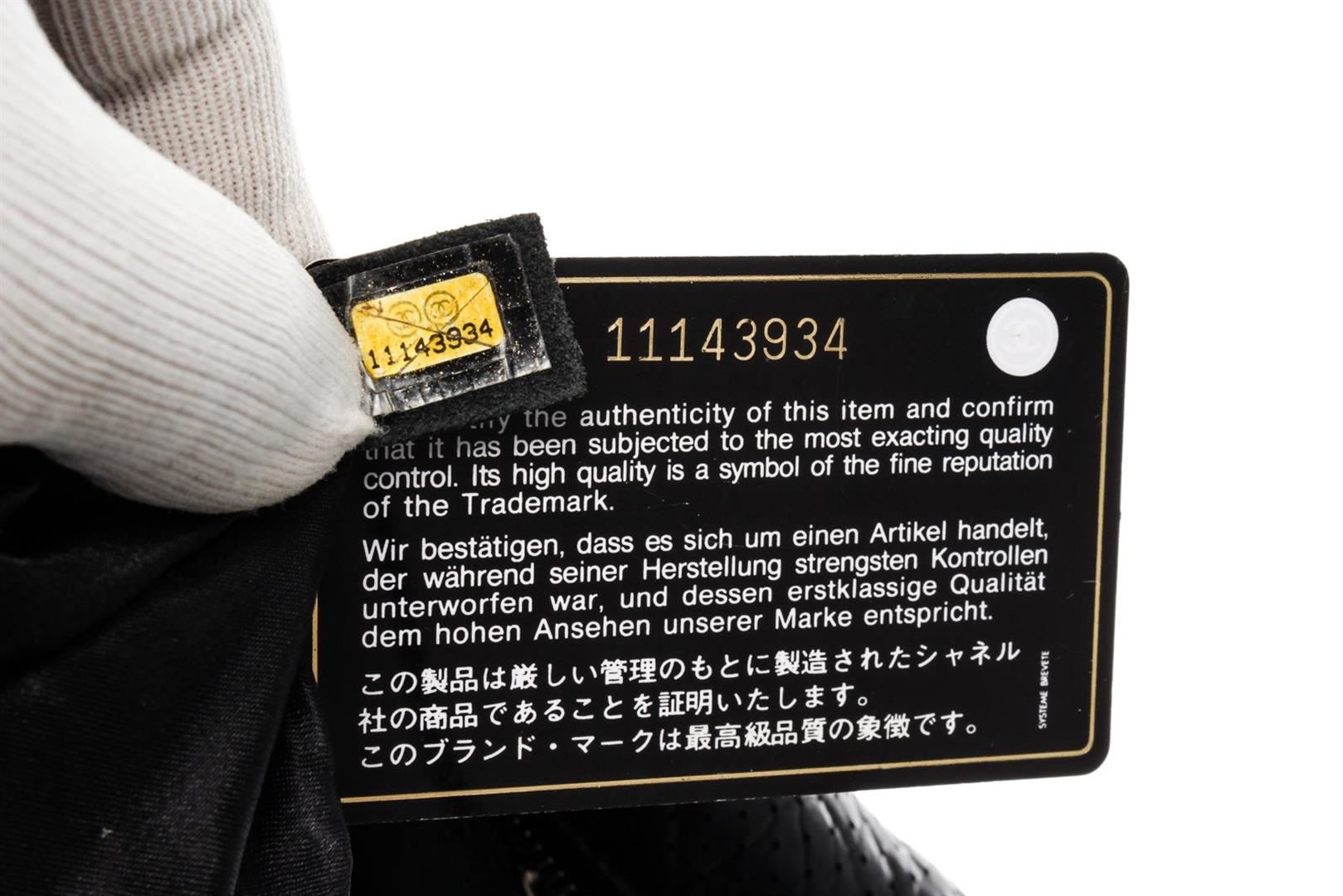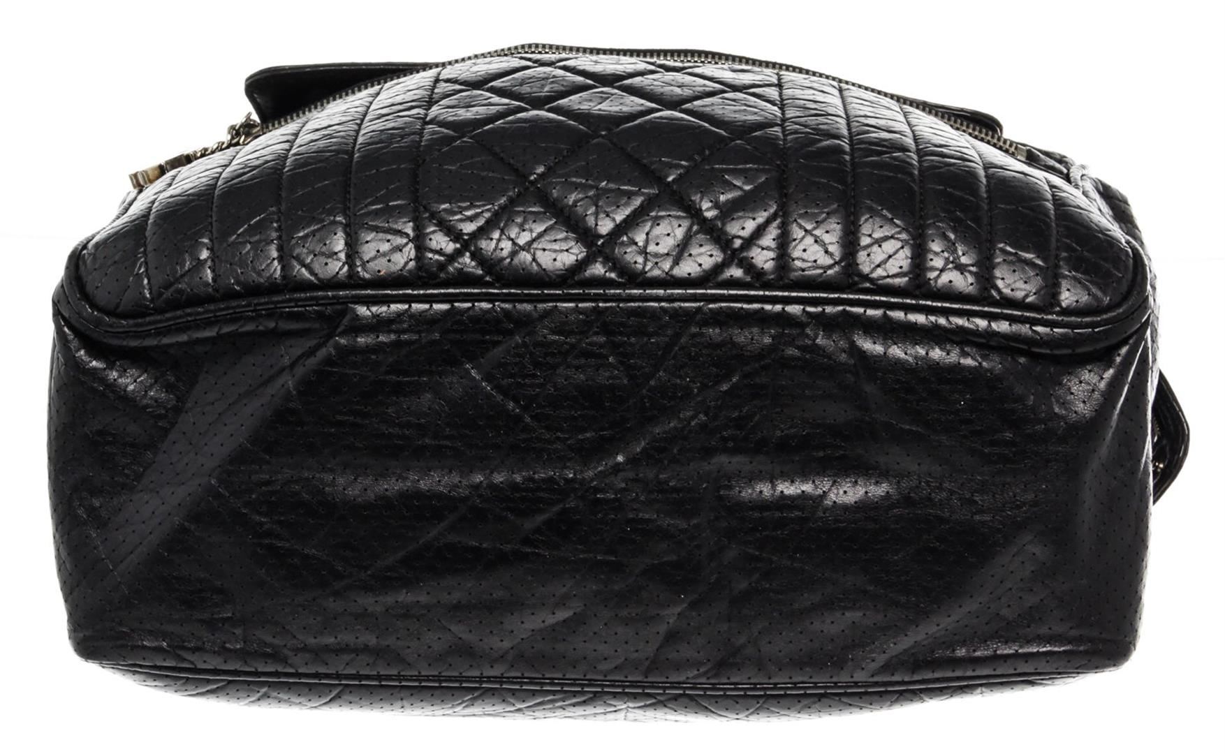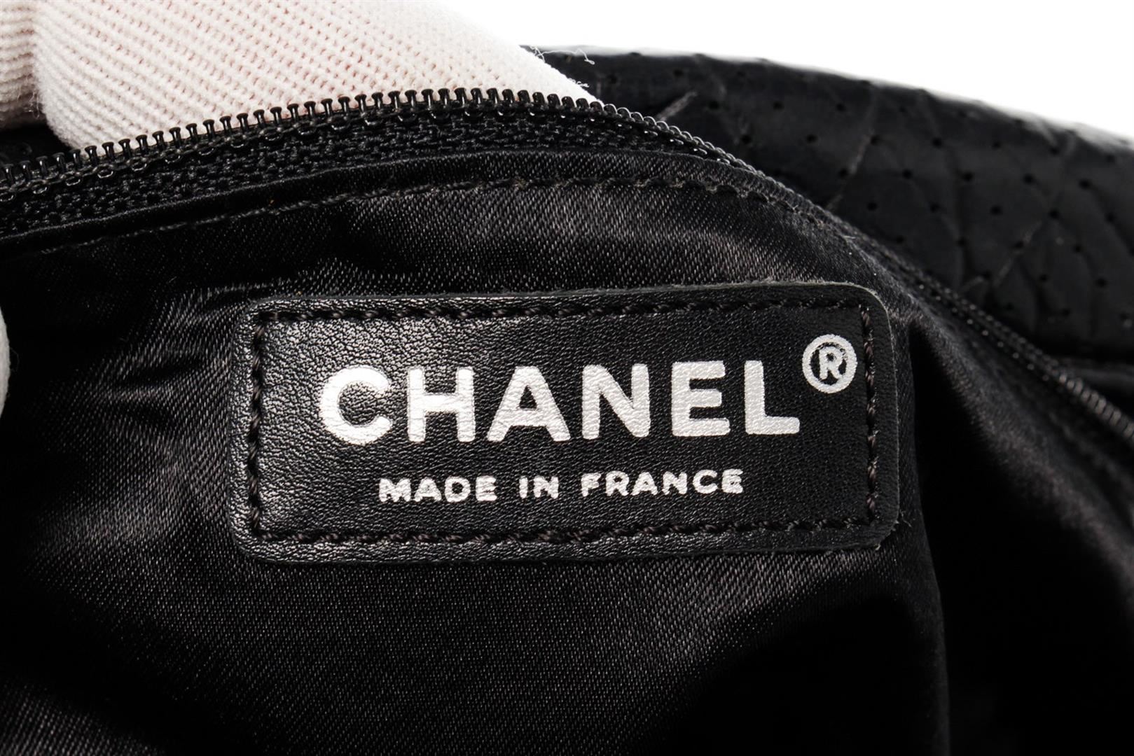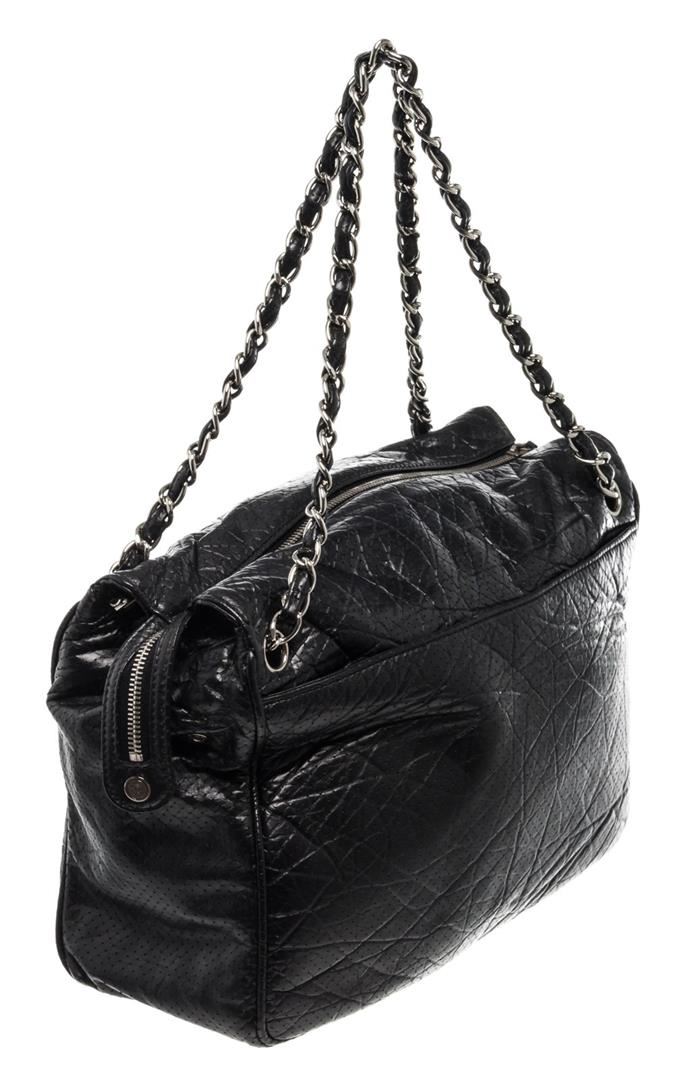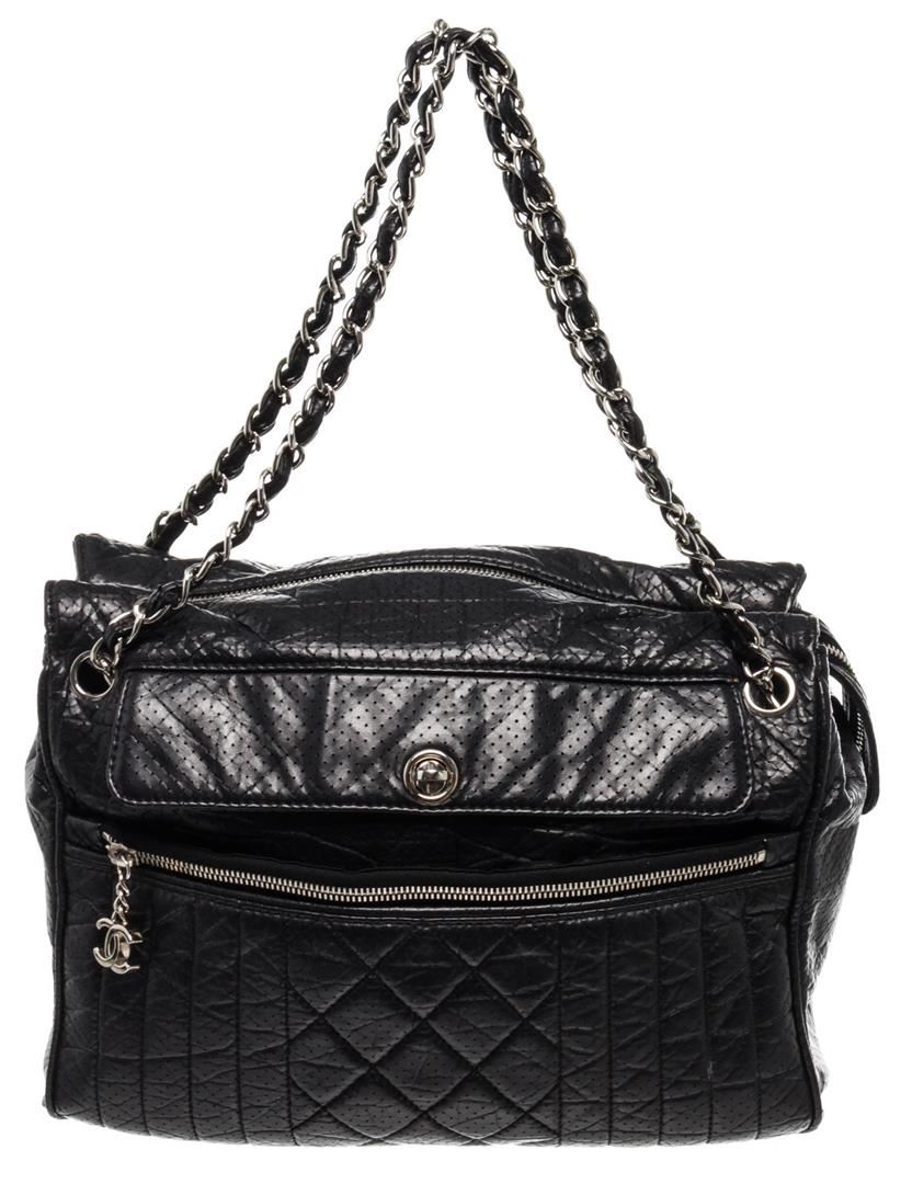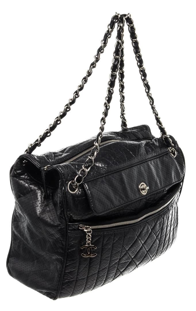 Chanel Black Caviar Leather 50's Large Tote Bag with gold-tone hardware, dual flat shoulder straps with chain-link accents, single exterior pocket with CC turn-lock closure at flap, tonal leather lining, three interior compartments; one with zip closure, dual interior zip pockets and open top.
