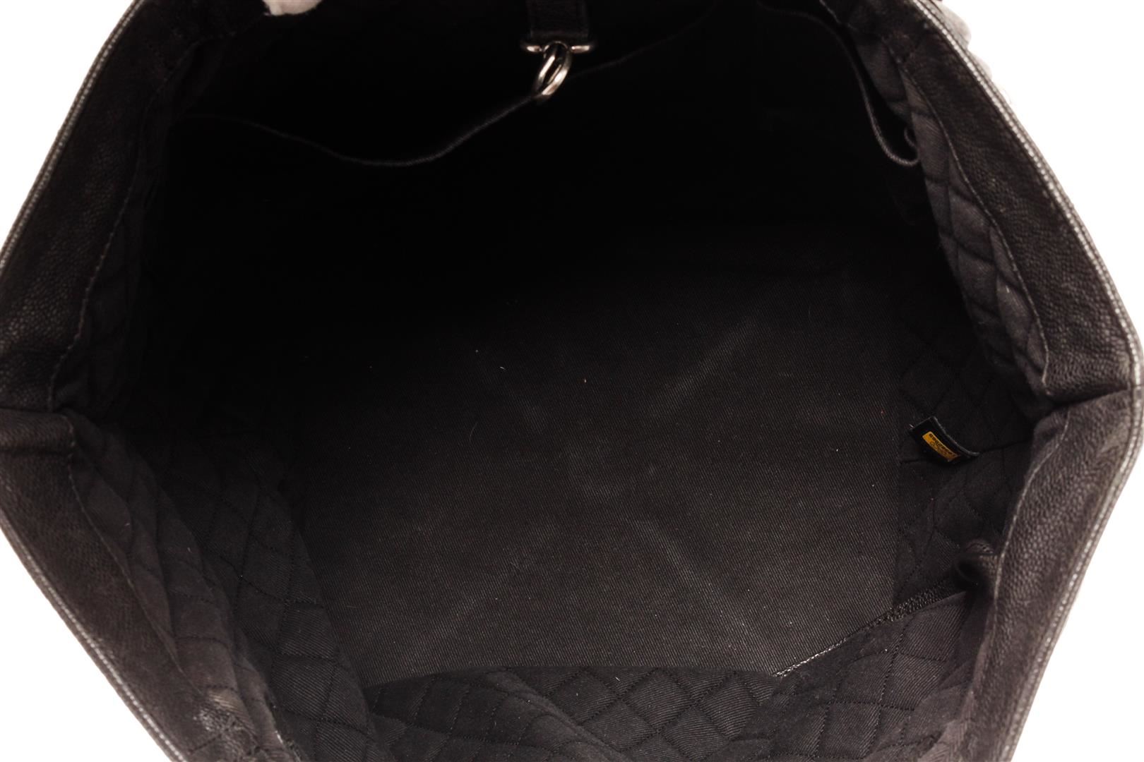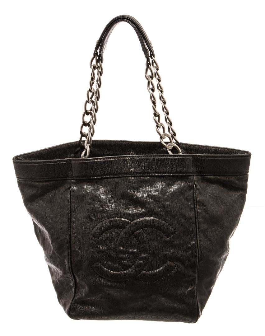 Chanel Black Caviar Leather CC Chain Tote Bag. All available information is listed in the description and shown in the photos. Chanel Black Caviar Leather CC Chain Tote Bag with gold-tone harware, caviar leather body, chain straps with leather guard, open top with hook closure, and interior zip pocket.