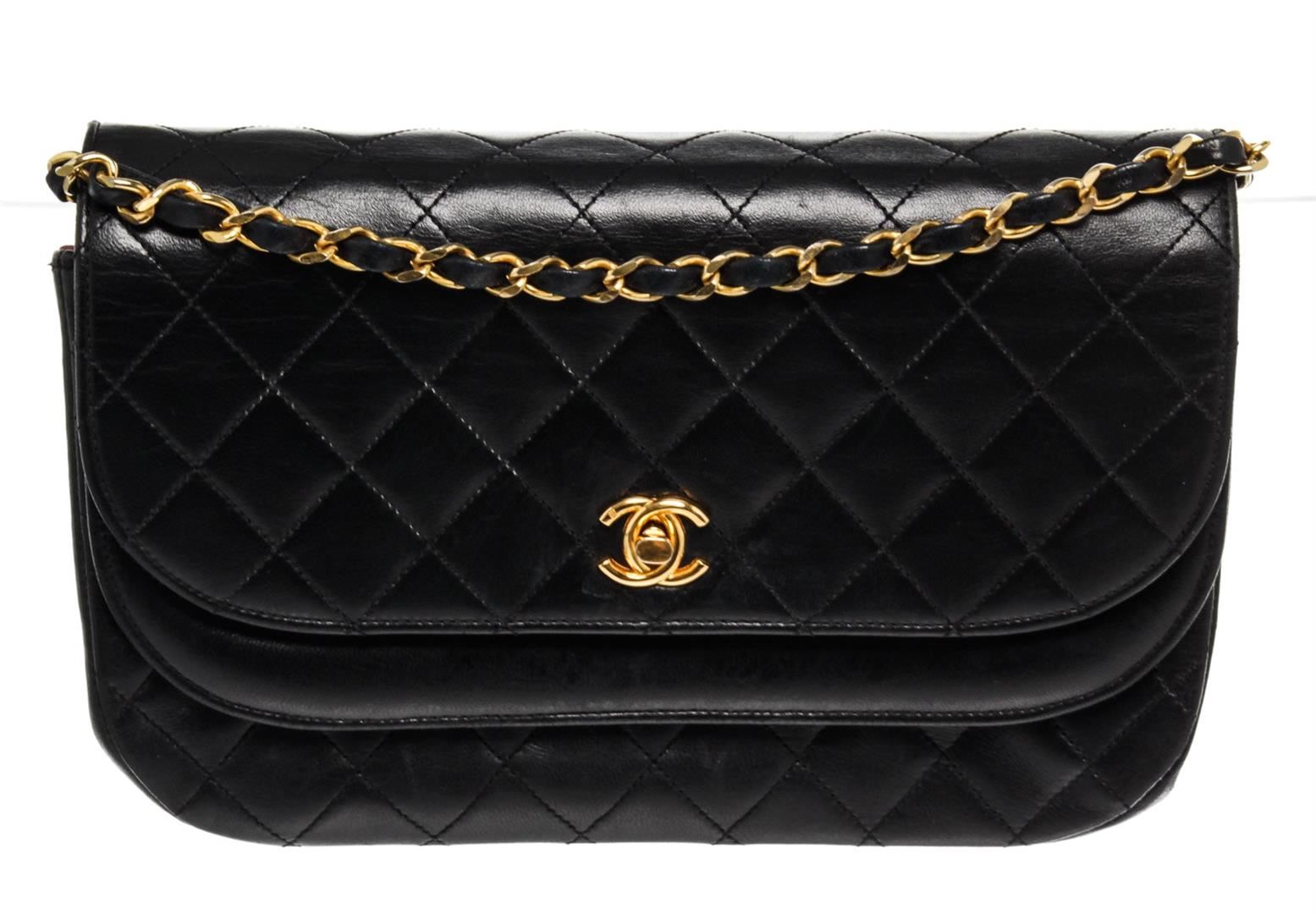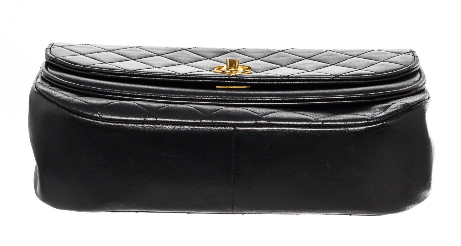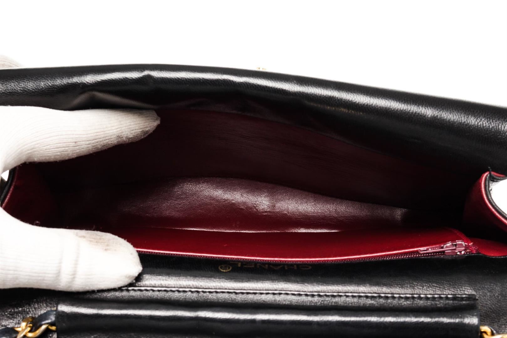 Chanel Black Caviar Leather Single Flap Shoulder Bag with caviar leather, gold-tone hardware, convertible chain-link and leather shoulder strap, single exterior patch pocket at back, single zip pocket, black leather interior, three interior compartments; one with snap closure, dual interior slit pockets and CC turn-lock closure at front flap.