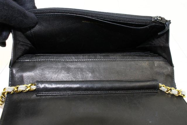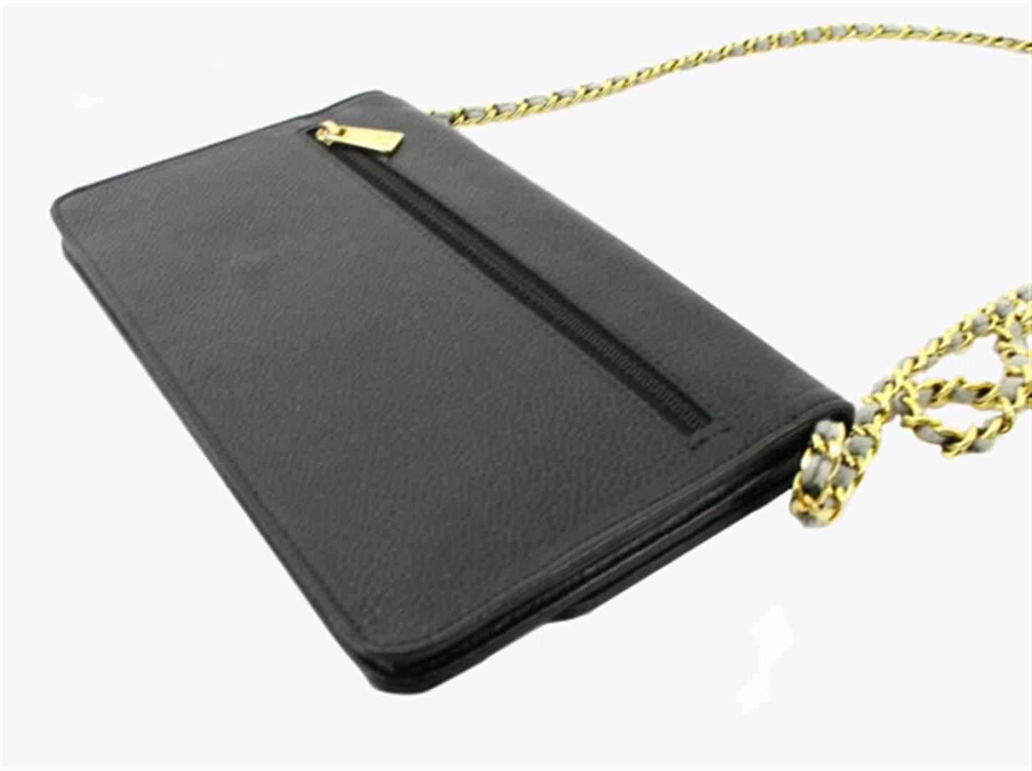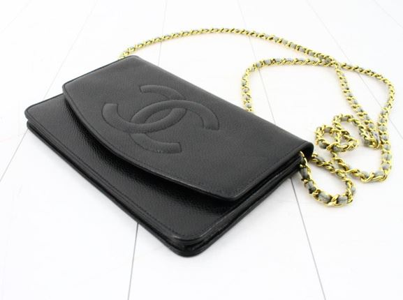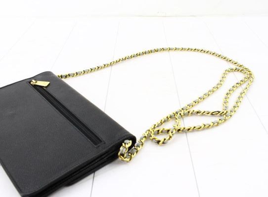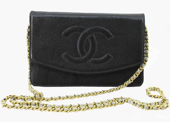 A classic Chanel Timeless CC Wallet-On-Chain bag. Made with Caviar leather in black with gold-tone hardware. Featuring an extra long chain for easy crossbody use and zip pocket at the back. Front flap has a large CC design, a button closure which opens to