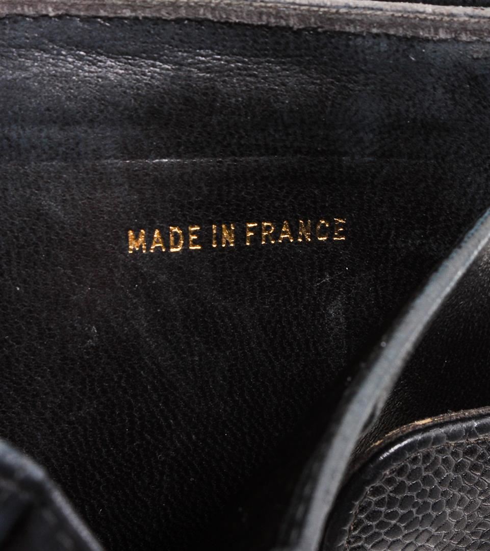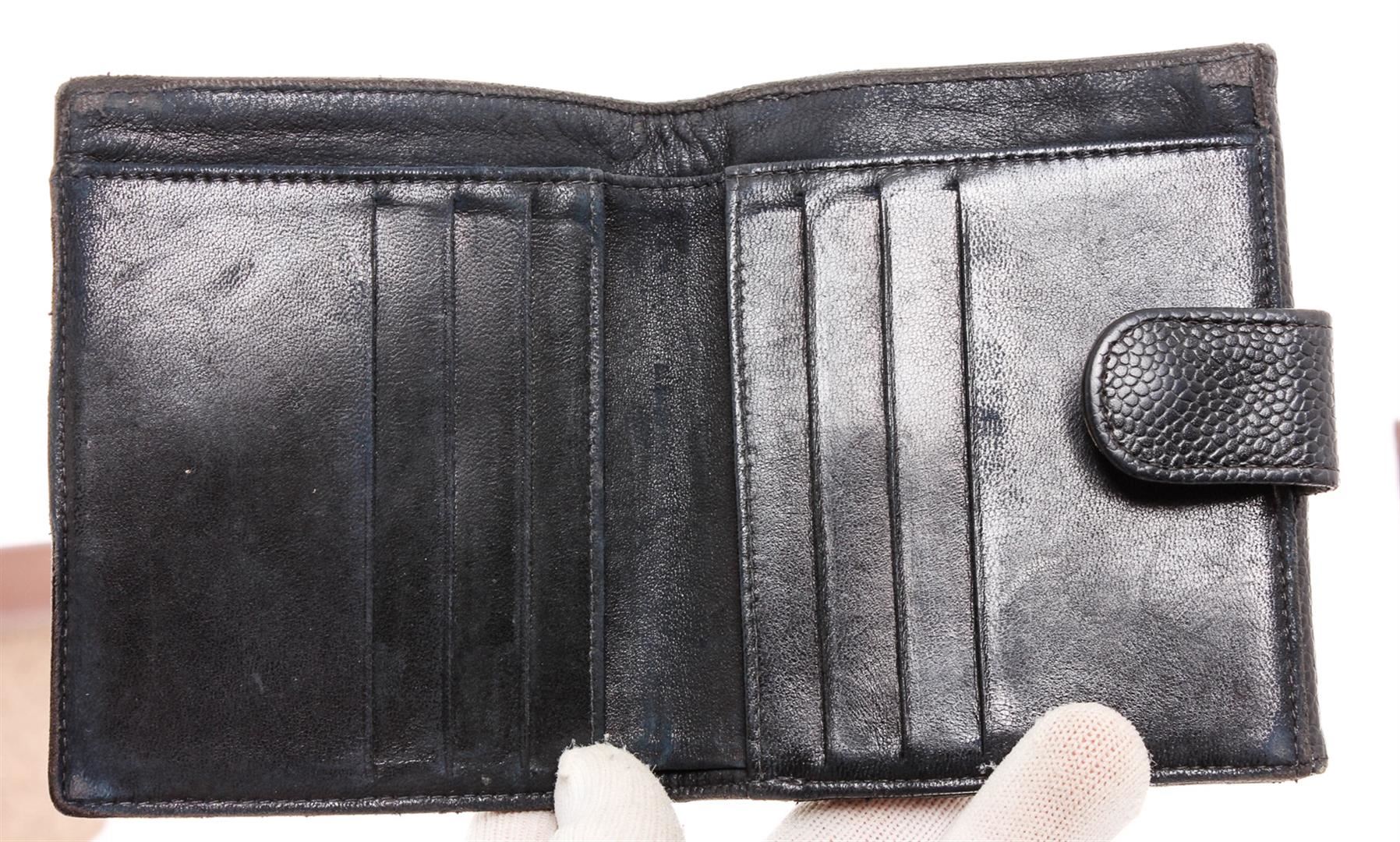 One Chanel Black Caviar Leather Timeless Compact Wallet. Black Caviar leather Chanel Timeless compact wallet with gold-tone hardware, CC logo at front, flap compartment at front face, tonal leather interior lining, single bill compartment, six card slots, dual slit compartments and snap closure at back.