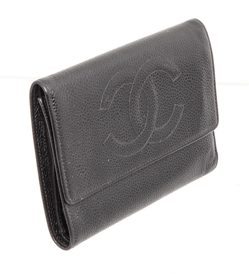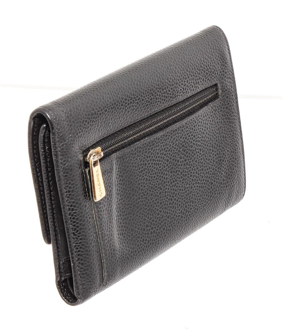 Black leather Chanel Timeless compact wallet with snap pouch featuring embroidered interlocking CC accent at front, zip pocket at exterior back, single bill slot, nine card slots, four side slip pockets, tonal stitching and snap closure at side.