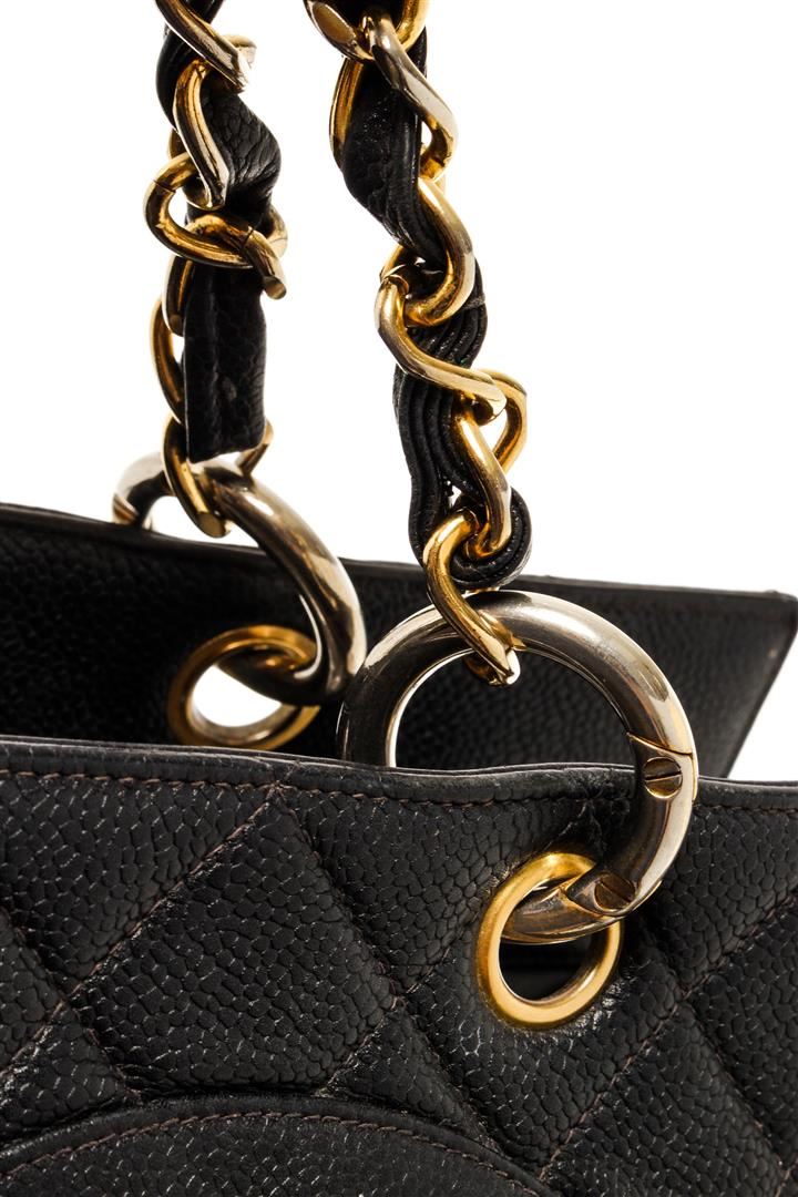 Chanel Black Caviar Quilted Leather Vintage GST. All available information is listed in the description and shown in the photos. Chanel Black Caviar Quilted Leather Vintage GST with chain/leather shoulder strap, two slip pockets, leather lining, gold hardware.