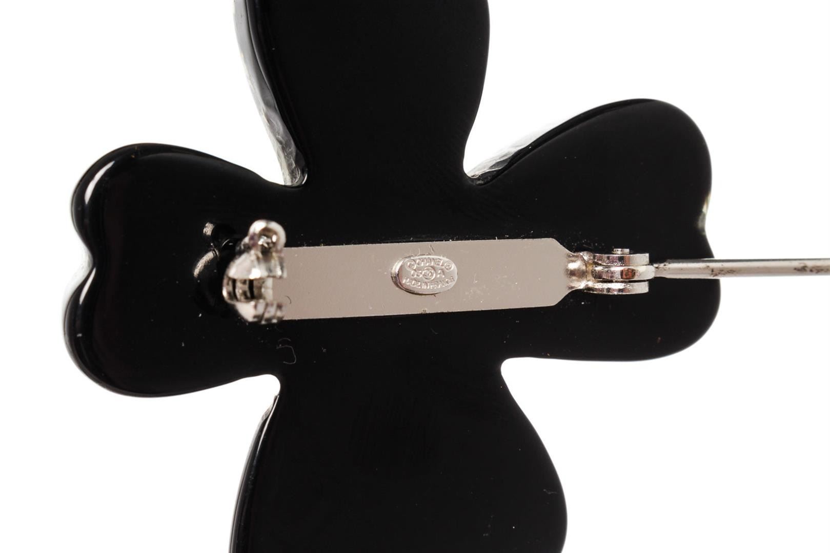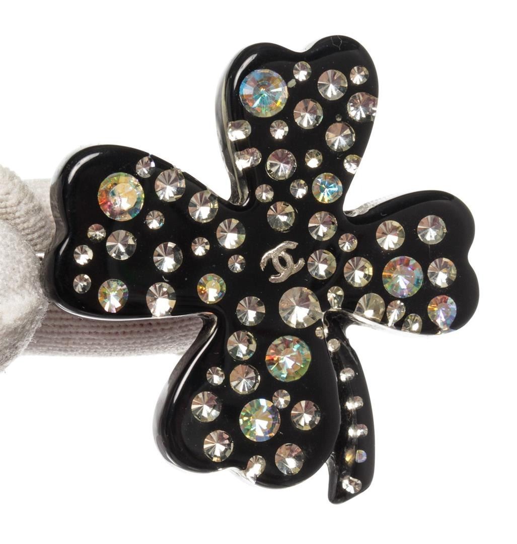 One Chanel Black Clover Rhinestone Brooch. Item is sold AS-IS. All available information is listed in the description and shown in the photo. Chanel Black clover rhinestone brooch with CC logo at the center and silver-tone hardware.