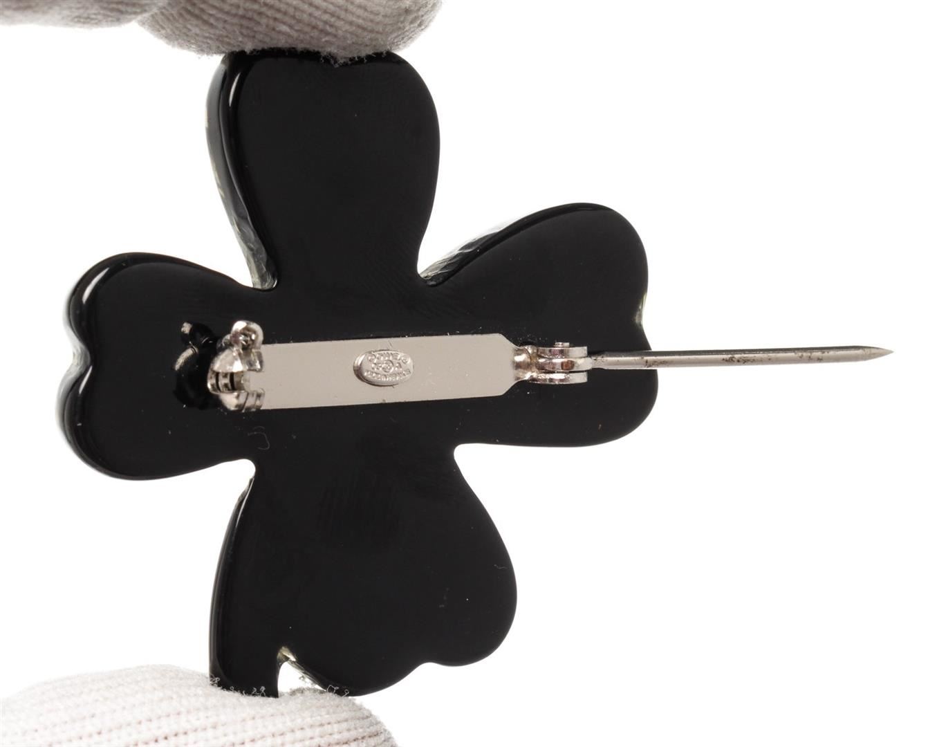 One Chanel Black Clover Rhinestone Brooch. Item is sold AS-IS. All available information is listed in the description and shown in the photo. Chanel Black clover rhinestone brooch with CC logo at the center and silver-tone hardware.
