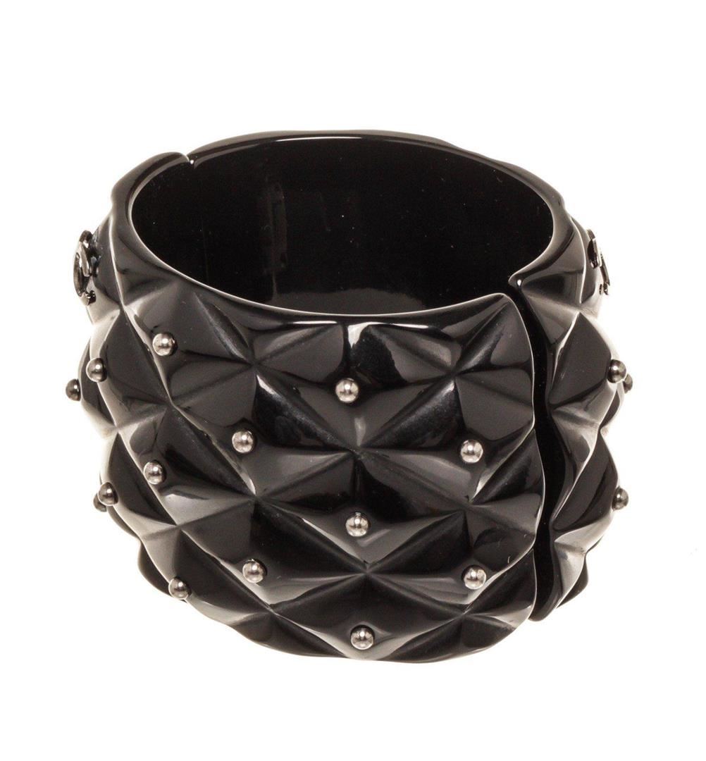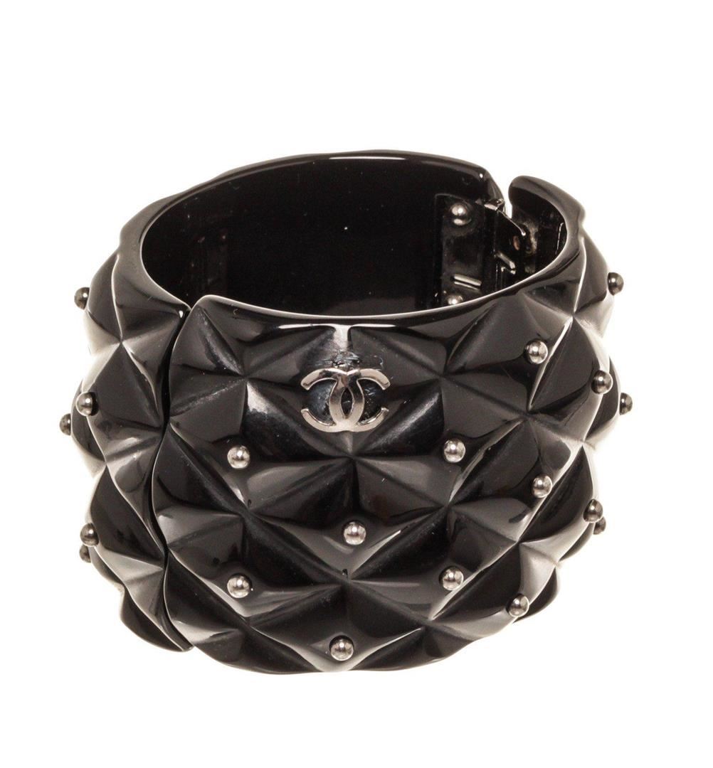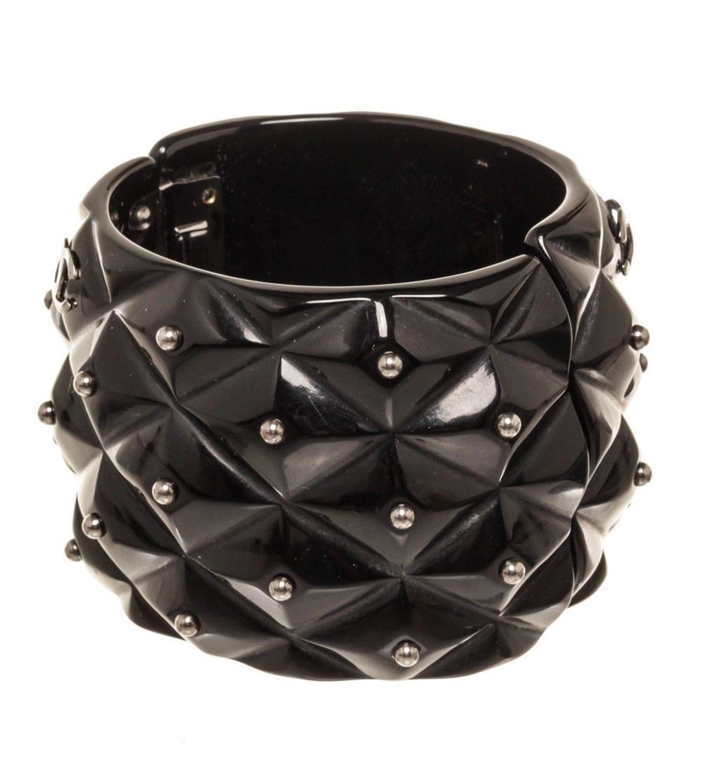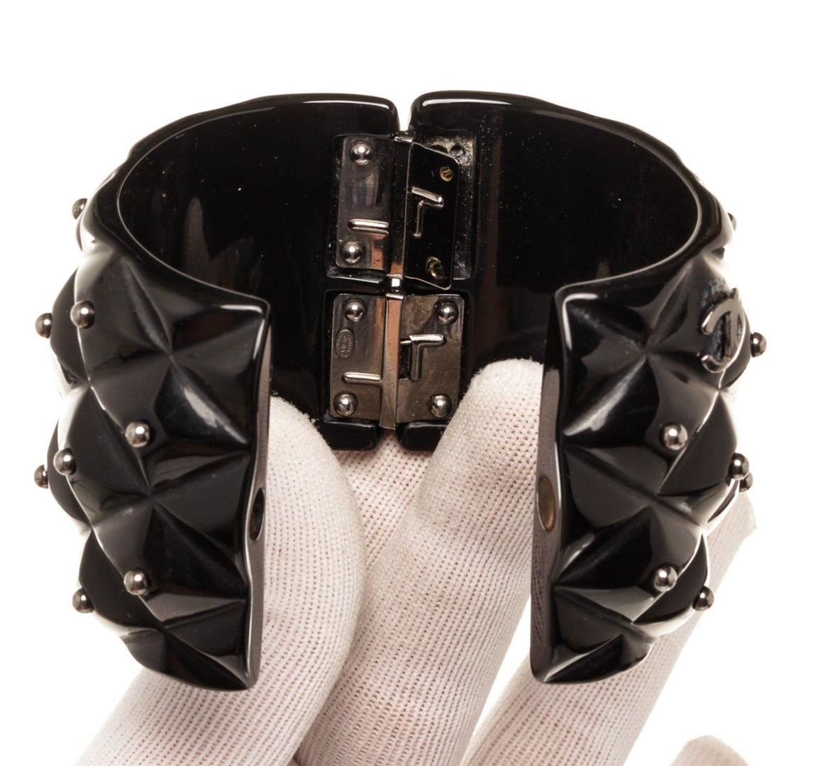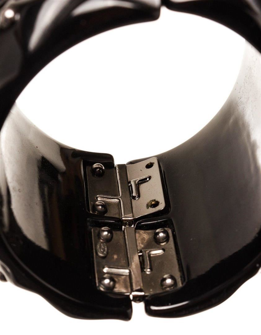 Chanel Black Enamel Stud Cuff Bracelet with four studs to match on either side of the head. The feline is holding a loop in its teeth for a fierce look. Adjustable strap.