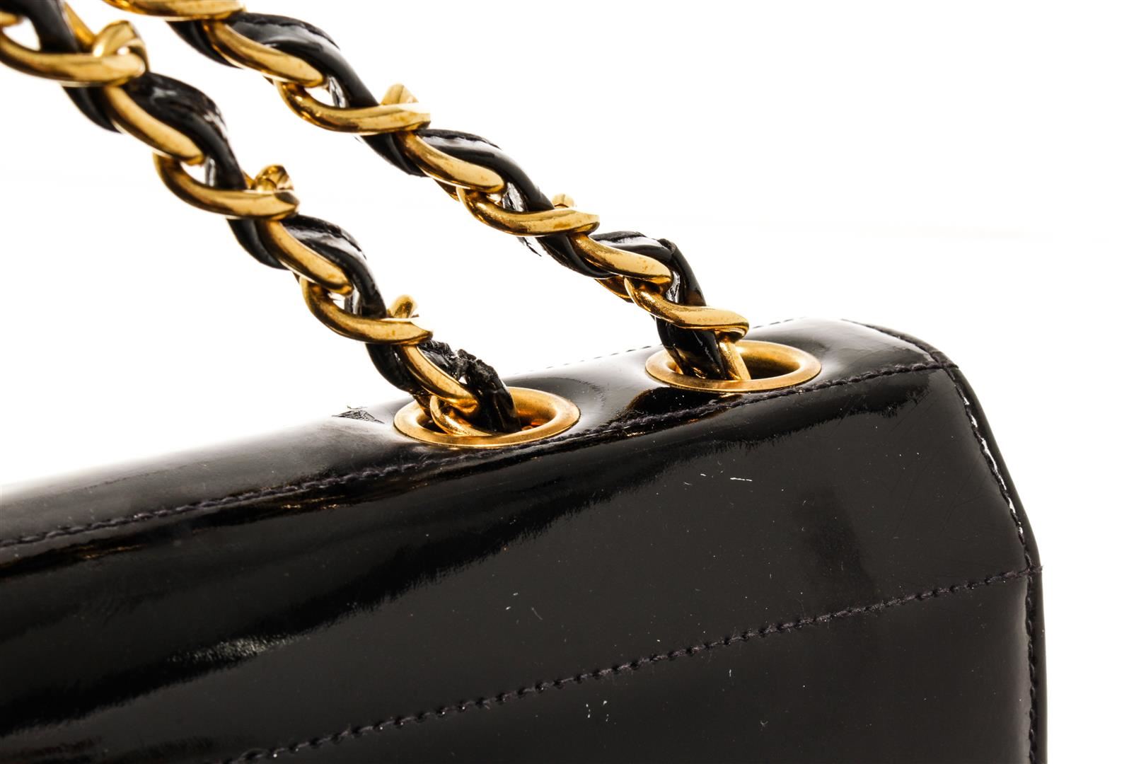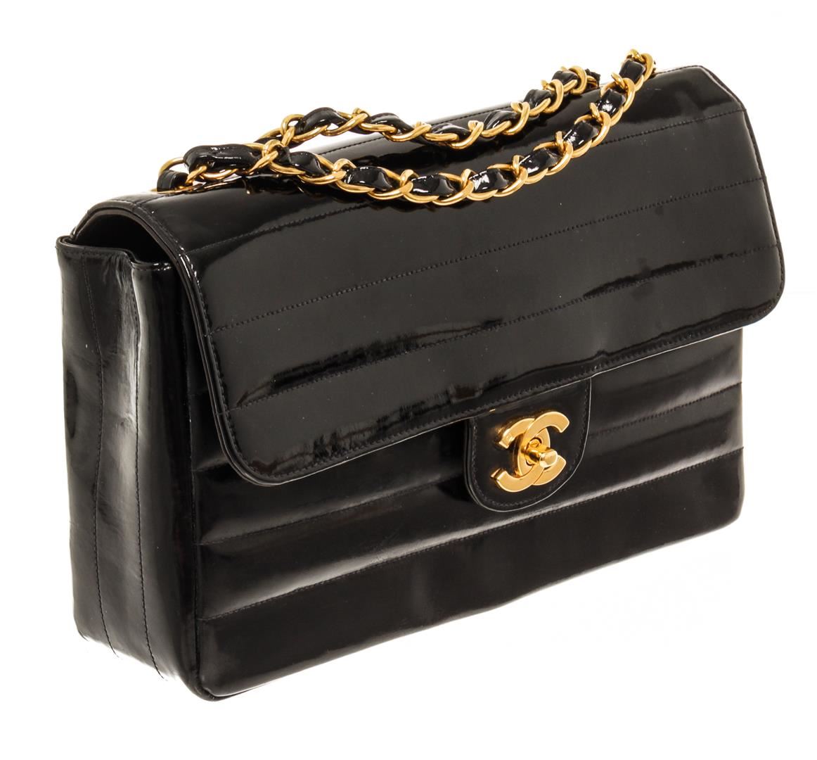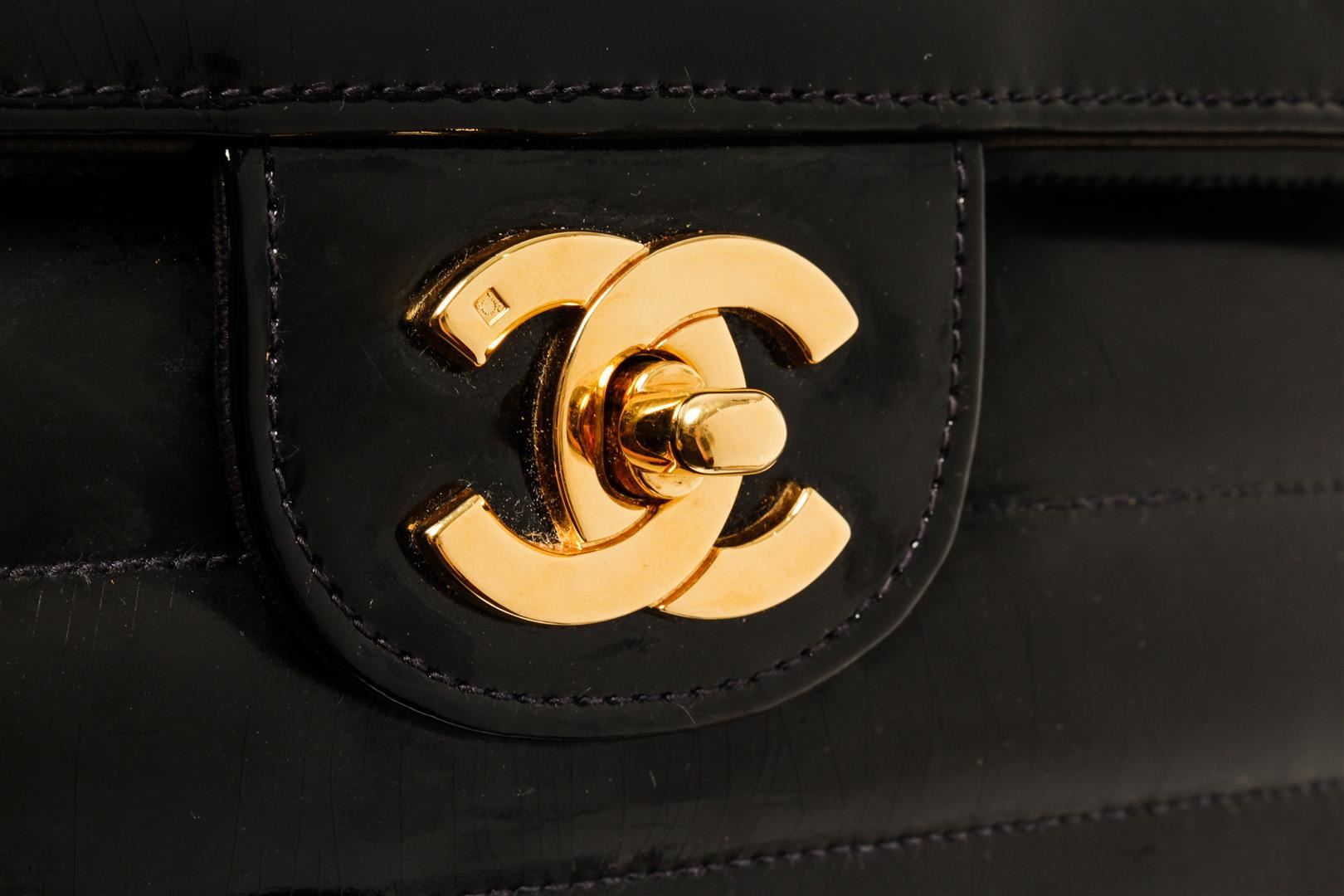 Chanel Black Horizontal Patent Leather Flap Bag. All available information is listed in the description and shown in the photos. Chanel Black Horizontal Patent Leather Flap Bag with gold-tone hardware, exterior slip pocket at the back, black leather lining, interior zip pocket, chain leather shoulder strap, and flap closure with CC turn lock. .