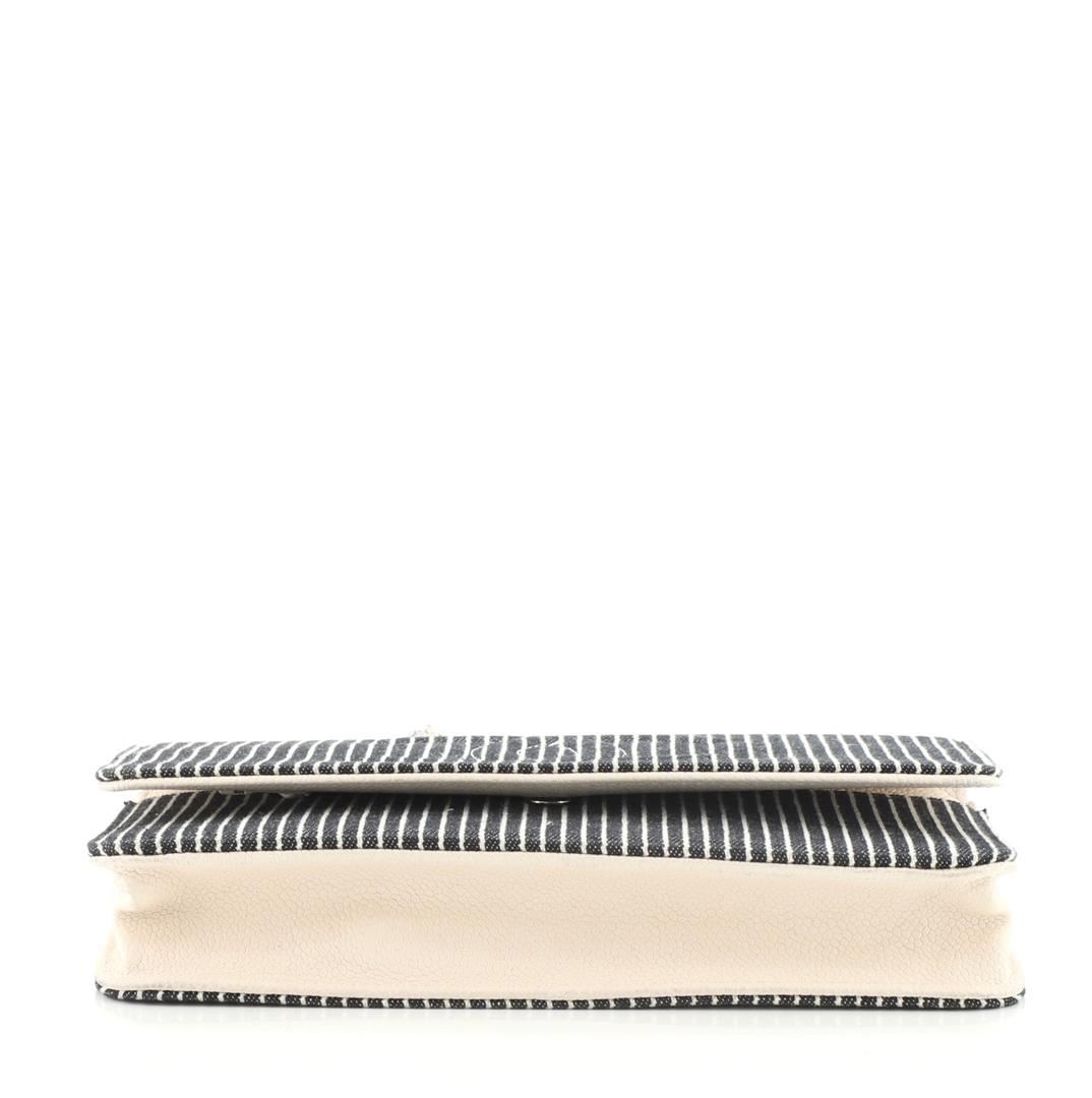 Chanel Black Ivory Striped Denim Timeless Wallet on Chain. All available information is listed in the description and shown in the photos. Chanel Wallet on Chain features black and ivory denim body, CC logo on the front, silver-tone hardware, a long interwoven strap that can be used on the shoulder, one main compartment and several slots for card storage for the interior made from ivory leather.