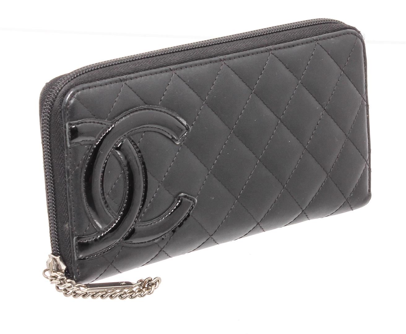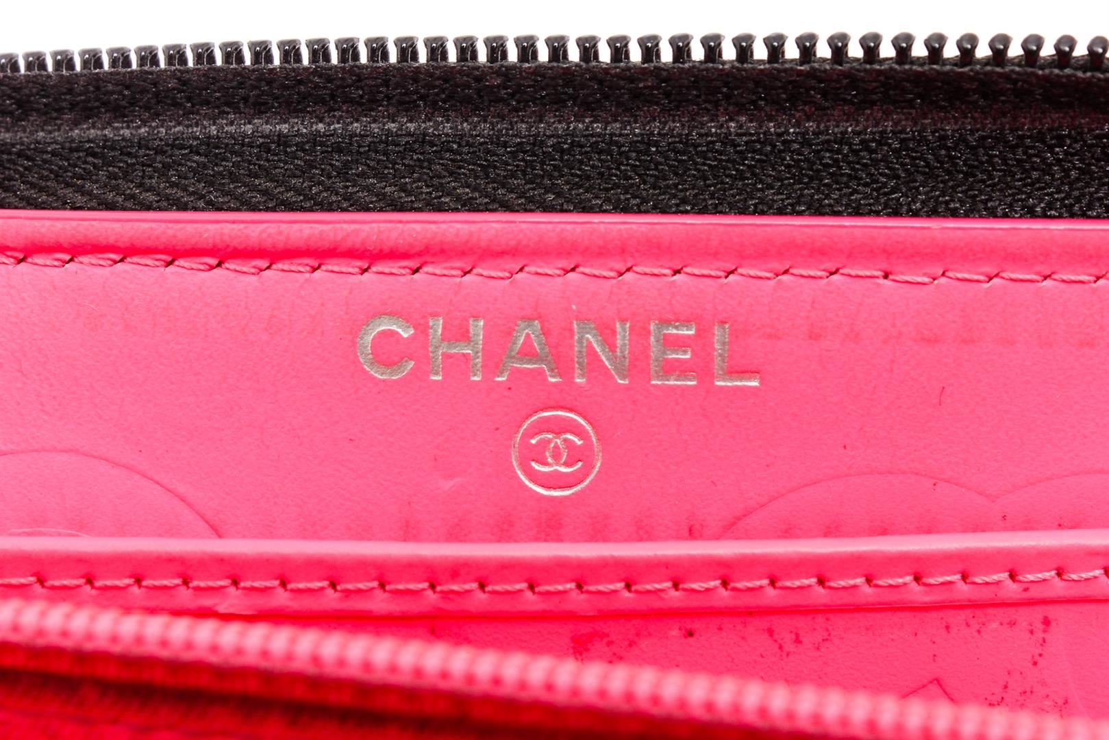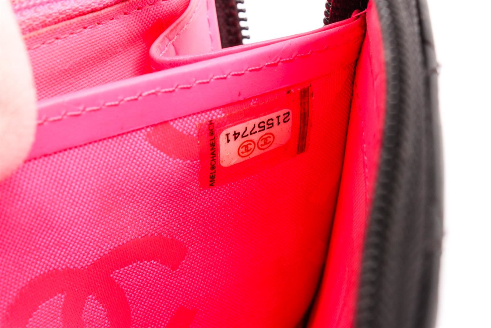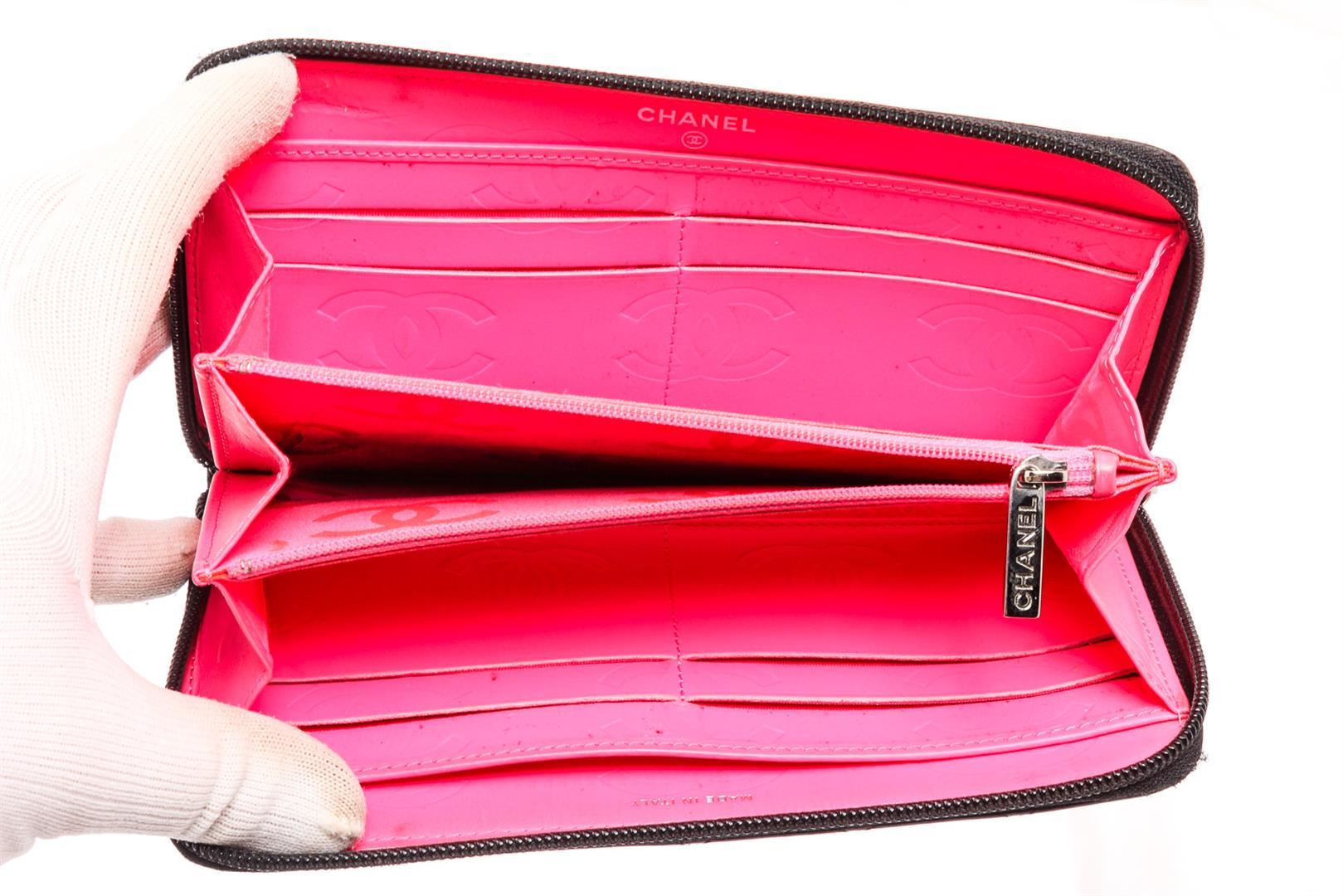 Chanel black quilted lambskin leather Cambon wallet with silver-tone hardware, black patent leather CC, hot pink lining, dual bill pockets, 8 card slots, interior zipper pocket, and zip around closure.