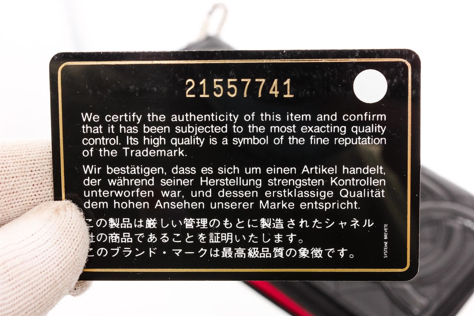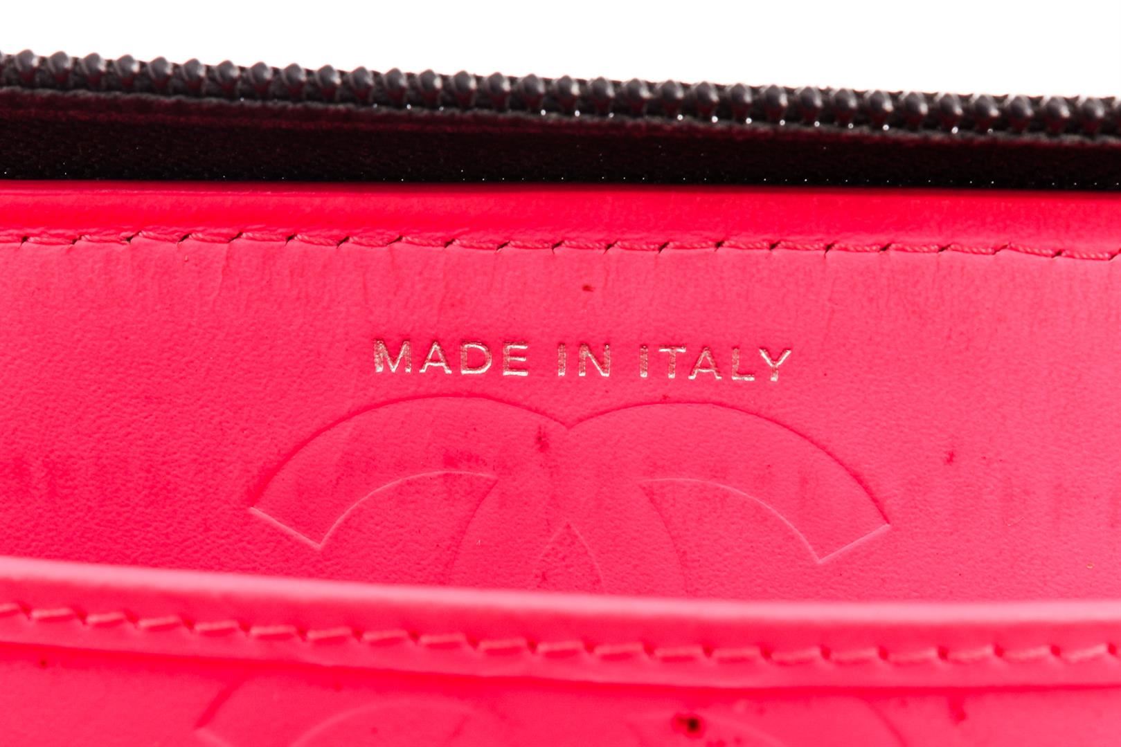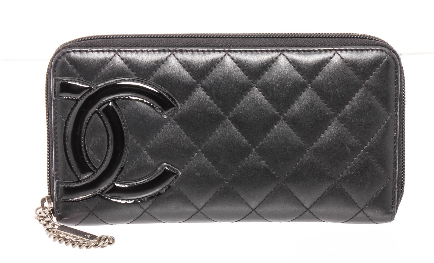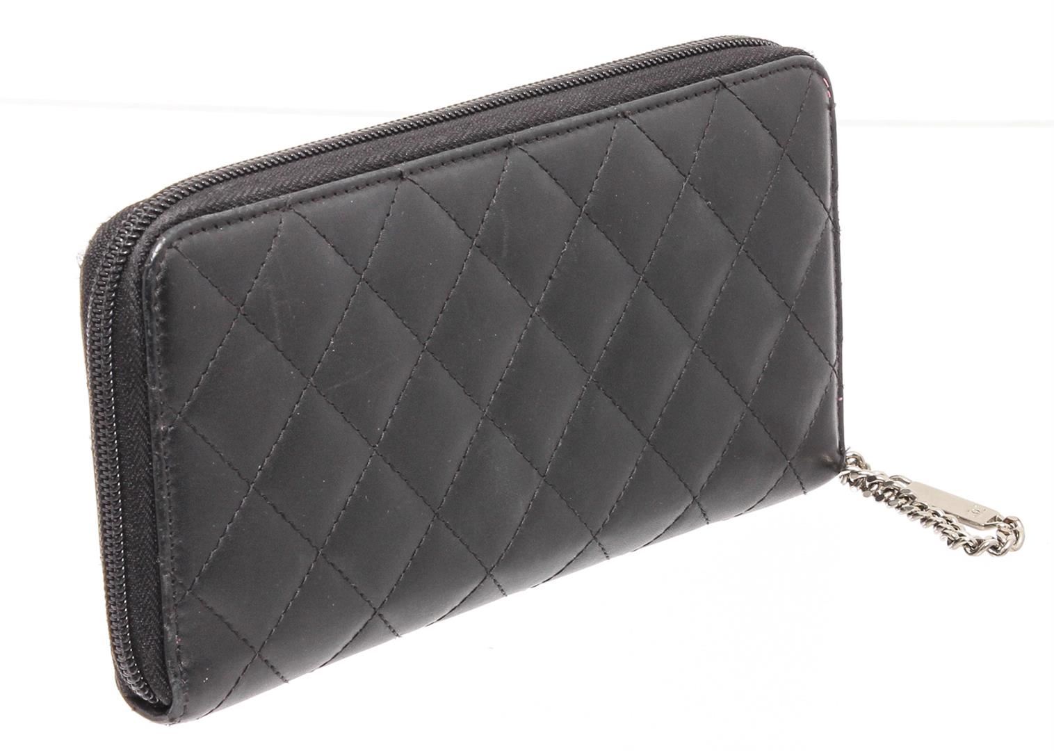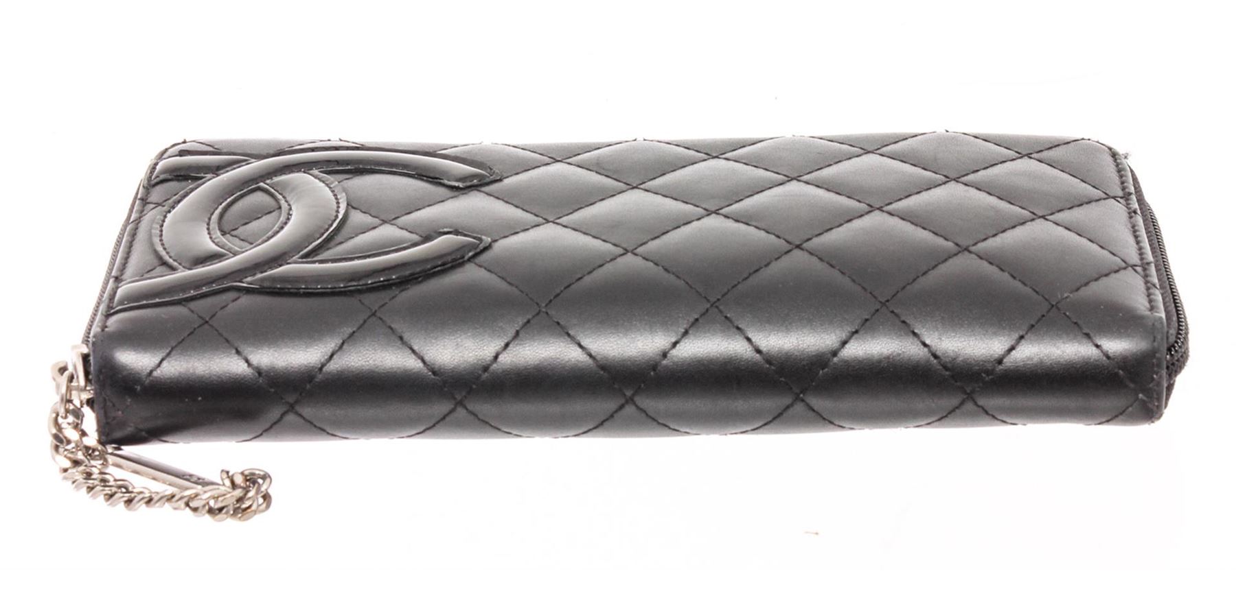 Chanel black quilted lambskin leather Cambon wallet with silver-tone hardware, black patent leather CC, hot pink lining, dual bill pockets, 8 card slots, interior zipper pocket, and zip around closure.