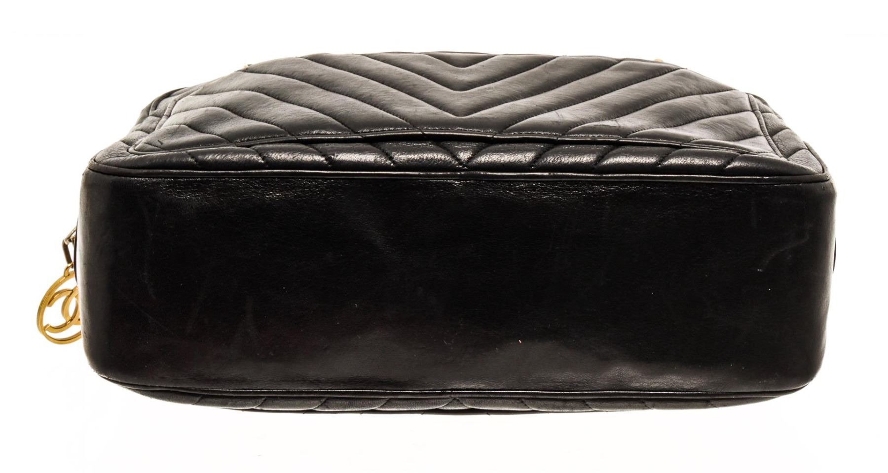 One Chanel Black Lambskin Chevron Camera Bag. Item is sold AS-IS. All available information is listed in the description and shown in the photo. Chanel black lambskin chevron camera back with red leather lining, gold-tone hardware, zip closure, one interior zip pocket, one front slip pocket, two long chains with leather shoulder paddings, and an interlocking CC logo as zipper tab. There is a stain and scratches on the lining. Please refer to photos. Height: 8" Width: 3.5" Length: 11" , Handle Drop: / 20.32 x 8.89 x 27.94 Cm