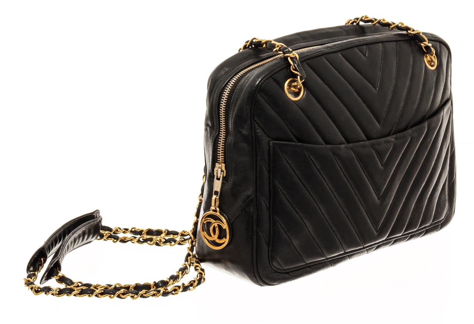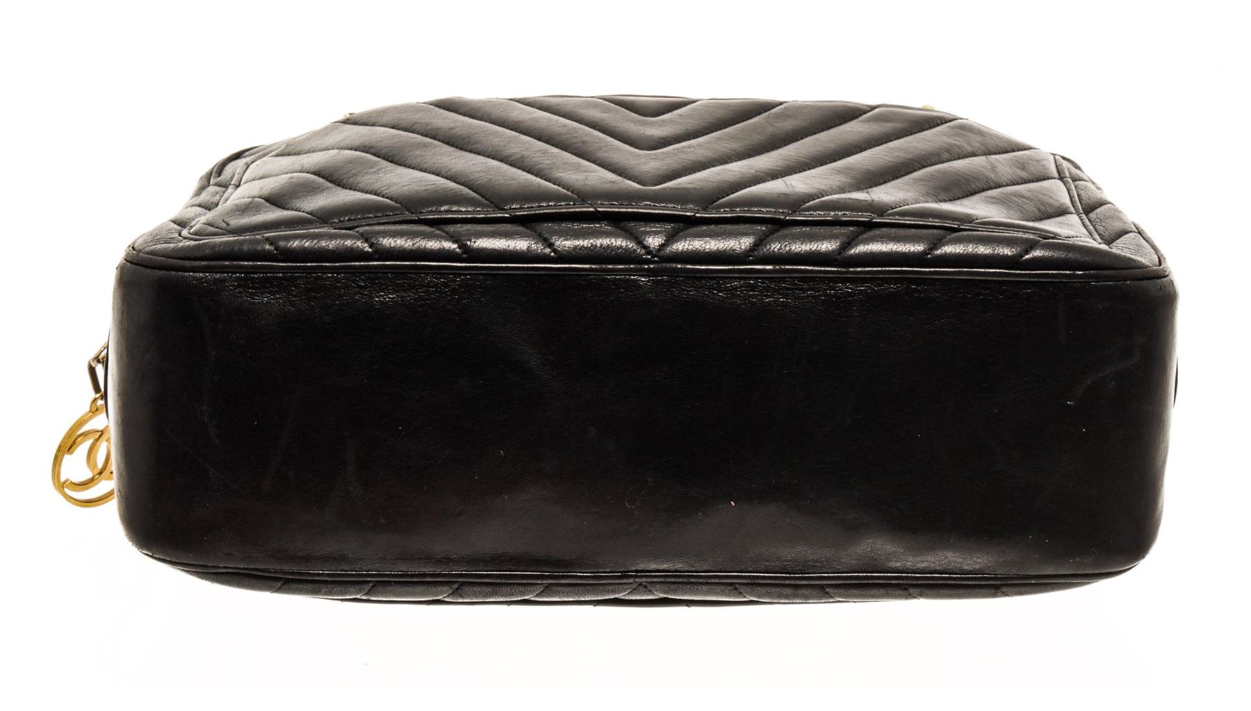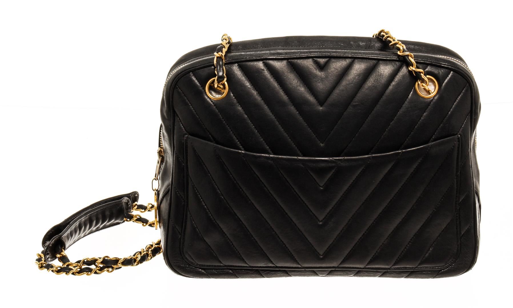 One Chanel Black Lambskin Chevron Camera Bag. Item is sold AS-IS. All available information is listed in the description and shown in the photo. Chanel black lambskin chevron camera back with red leather lining, gold-tone hardware, zip closure, one interior zip pocket, one front slip pocket, two long chains with leather shoulder paddings, and an interlocking CC logo as zipper tab. There is a stain and scratches on the lining. Please refer to photos. Height: 8" Width: 3.5" Length: 11", Handle Drop: / 20.32 x 8.89 x 27.94 Cm