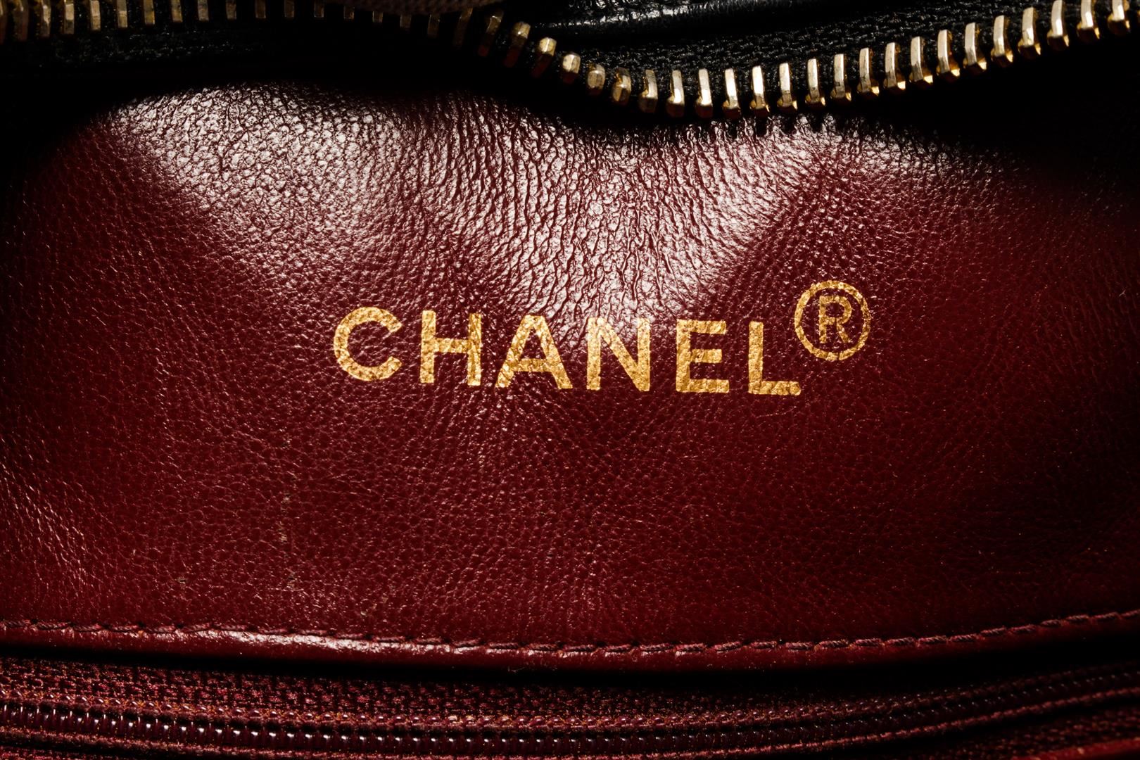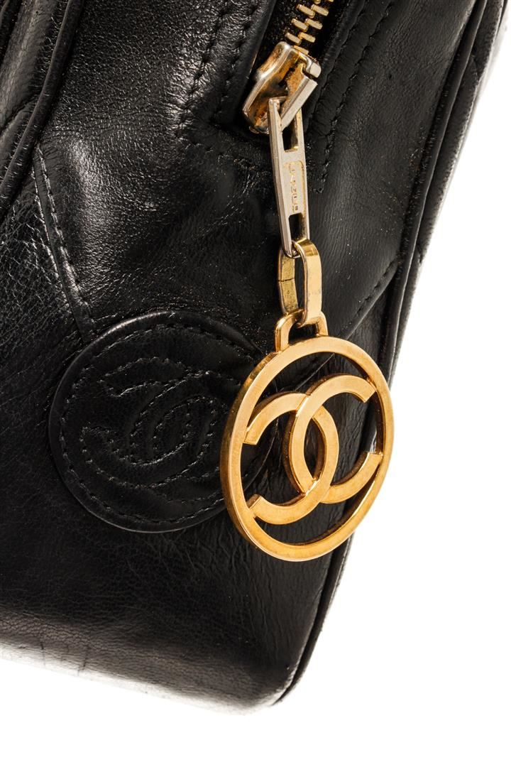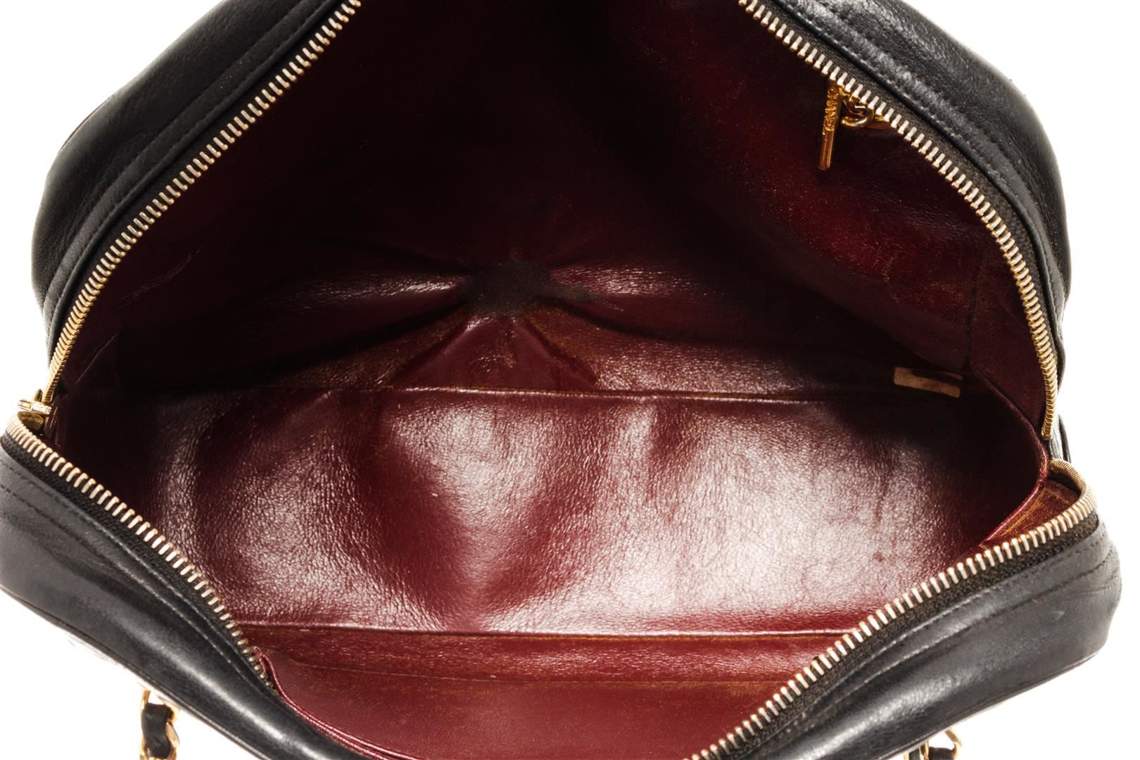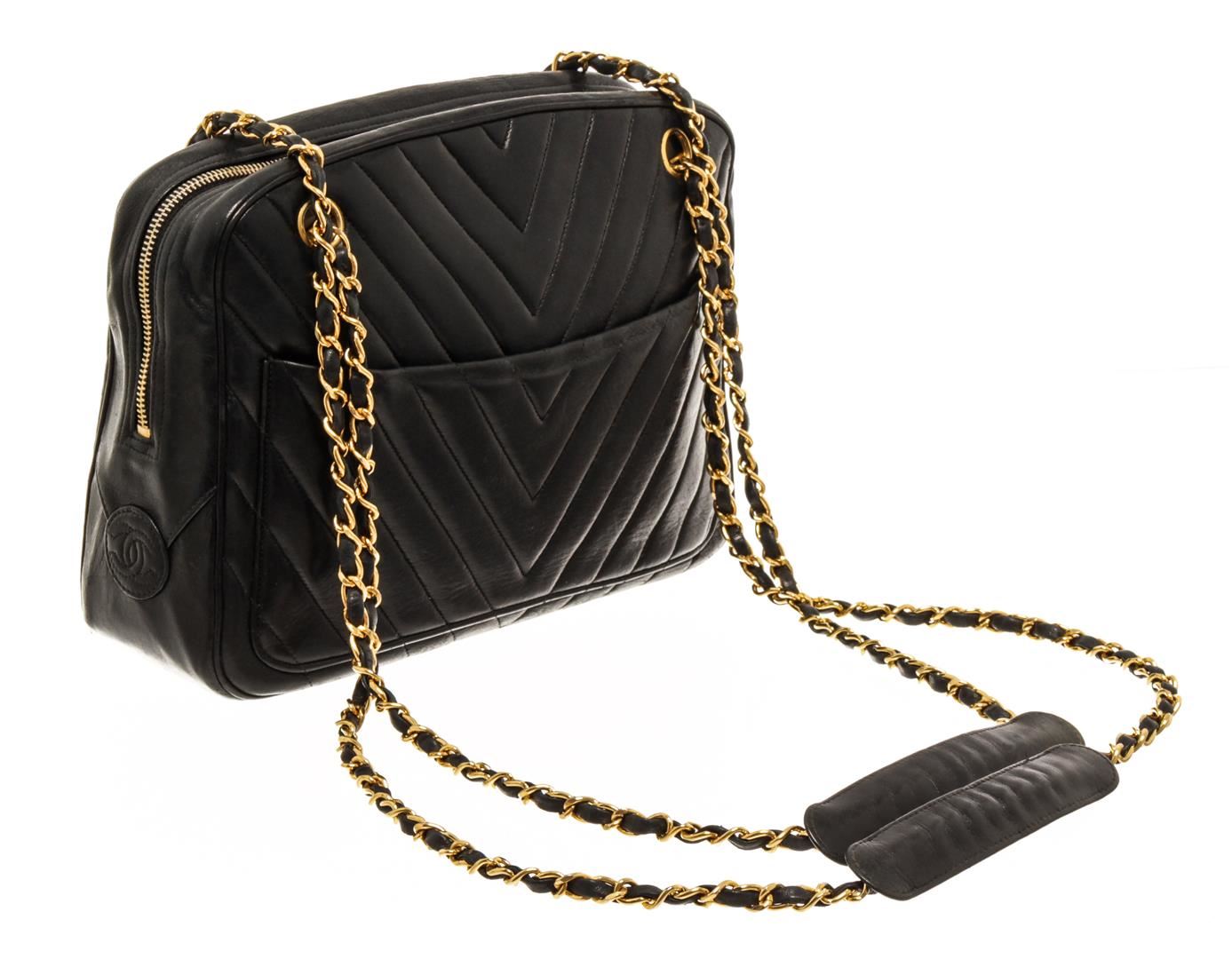 One Chanel Black Lambskin Chevron Camera Bag. Item is sold AS-IS. All available information is listed in the description and shown in the photo. Chanel black lambskin chevron camera back with red leather lining, gold-tone hardware, zip closure, one interior zip pocket, one front slip pocket, two long chains with leather shoulder paddings, and an interlocking CC logo as zipper tab. There is a stain and scratches on the lining. Please refer to photos. Height: 8" Width: 3.5" Length: 11", Handle Drop: / 20.32 x 8.89 x 27.94 Cm