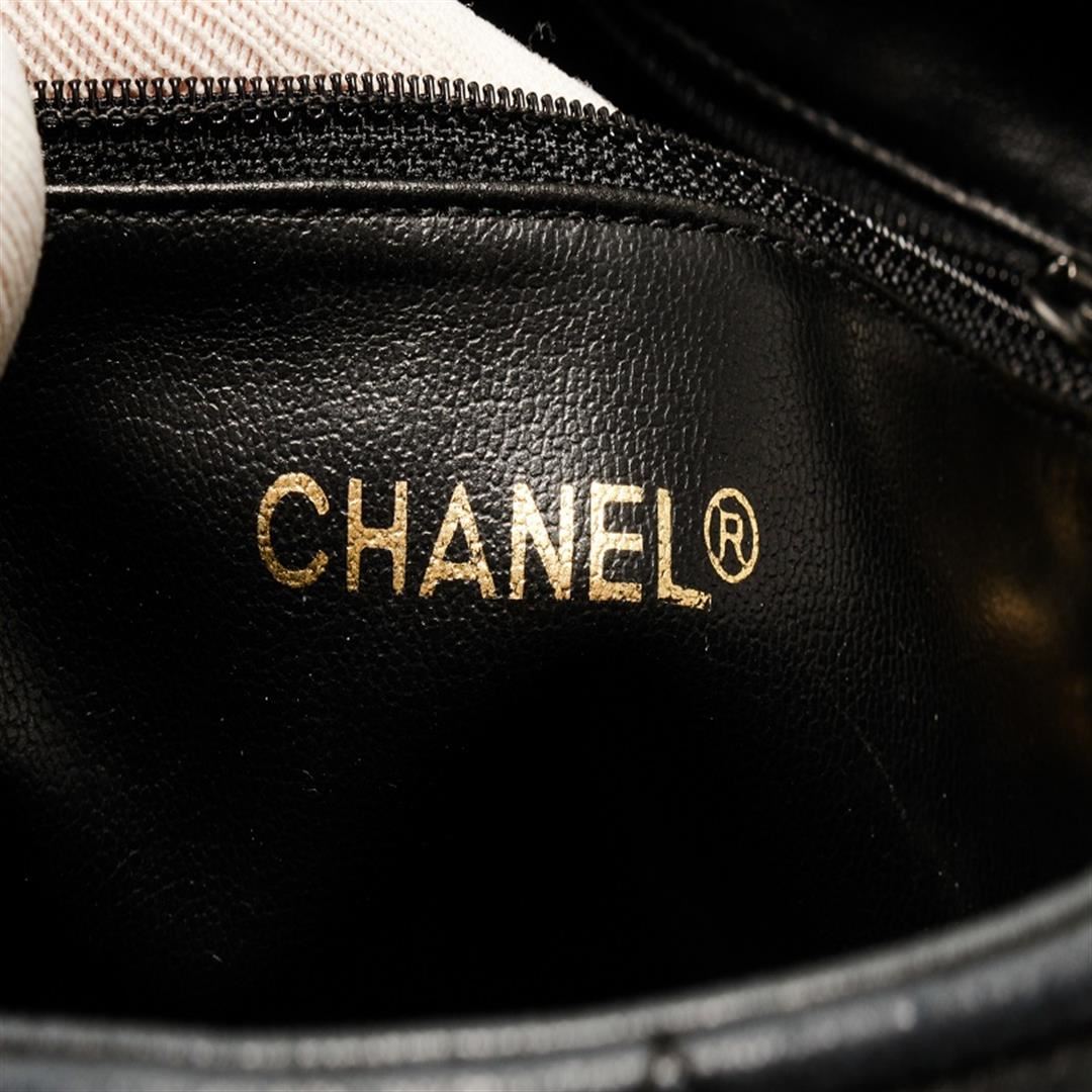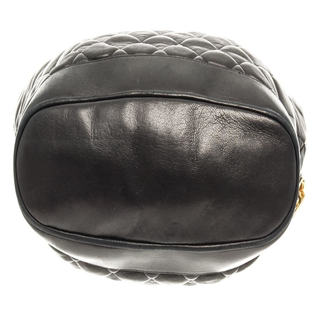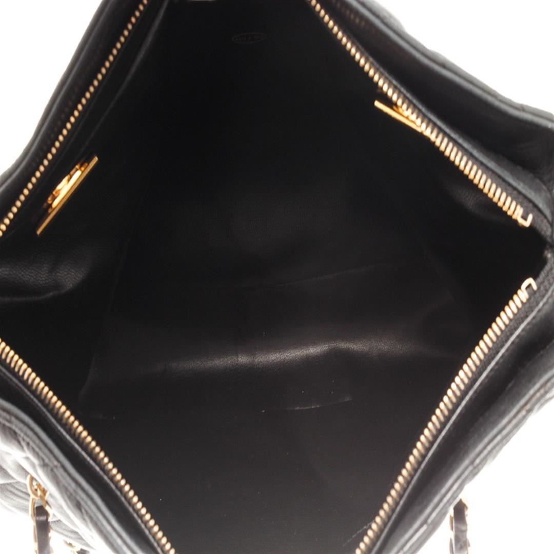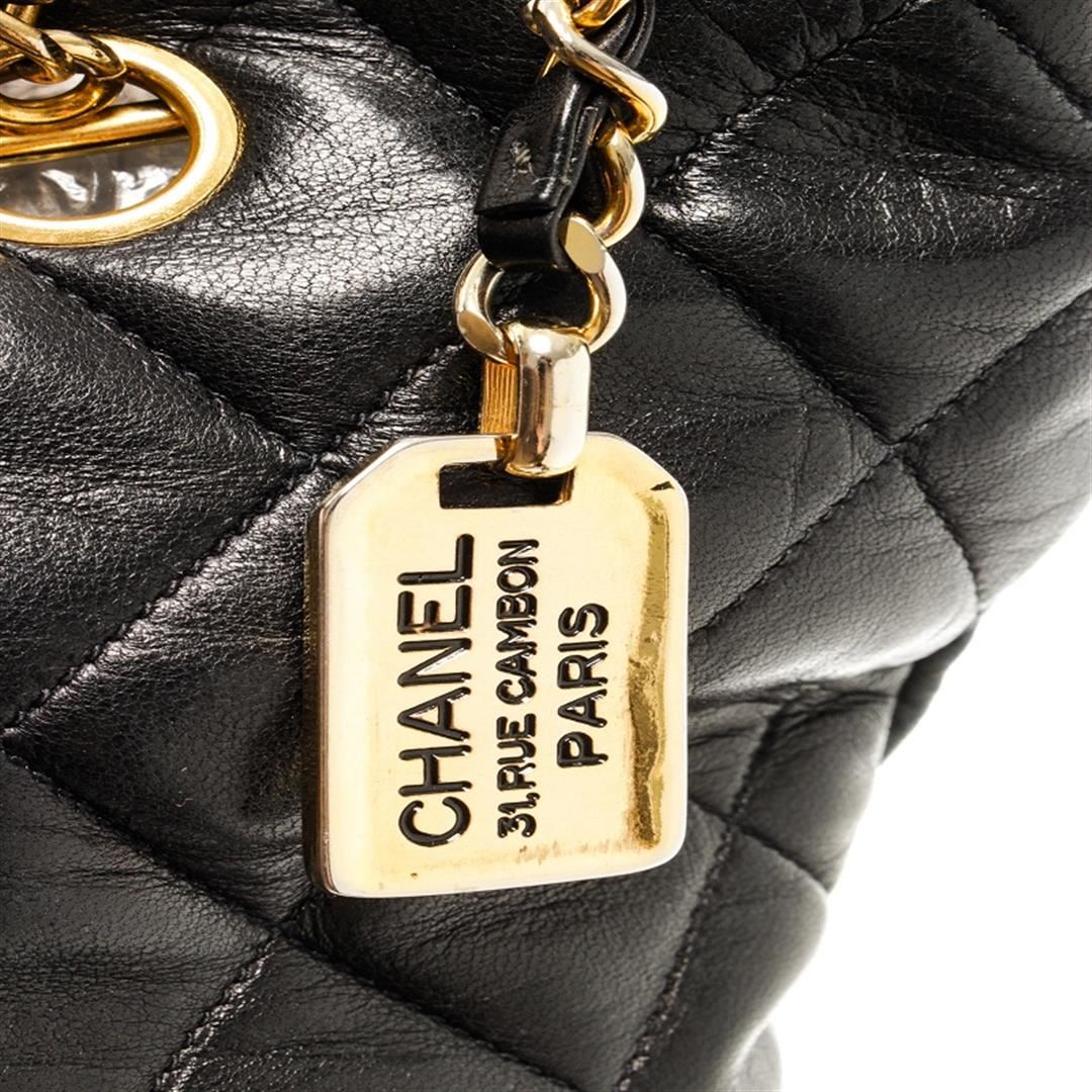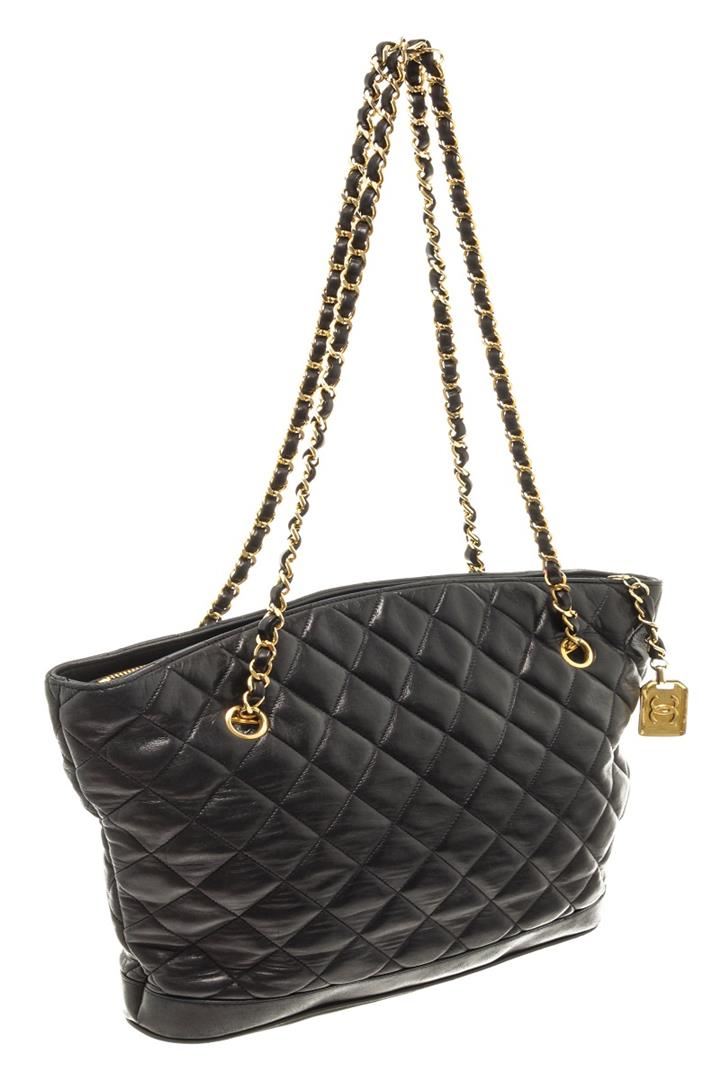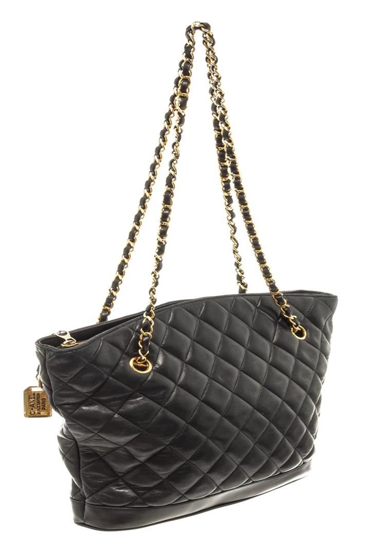 One Chanel Black Lambskin Leather GHW Chain Tote Bag. Item is sold AS-IS. All available information is listed in the description and shown in the photo. Chanel black lambskin leather GHW chain tote bag with interlocking cc logo, quilted pattern leather exterior, single interior pocket, gold-tone hardware, zip closure, chain-link shoulder straps, black leather lining, and single interior zip pocket Height: 10" Width: 10" Depth: 2.5", Shoulder Handle Drop: 12" / 25.4 x 25.4 x 6.35 Cm
