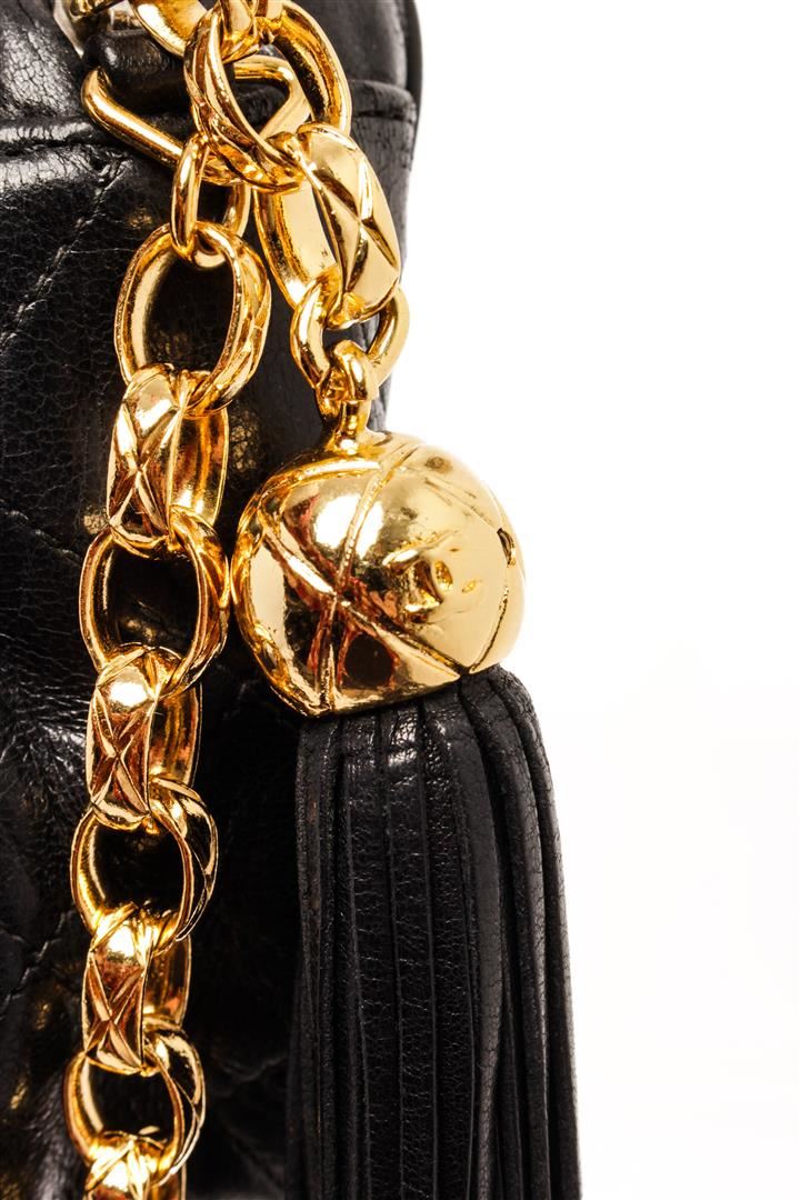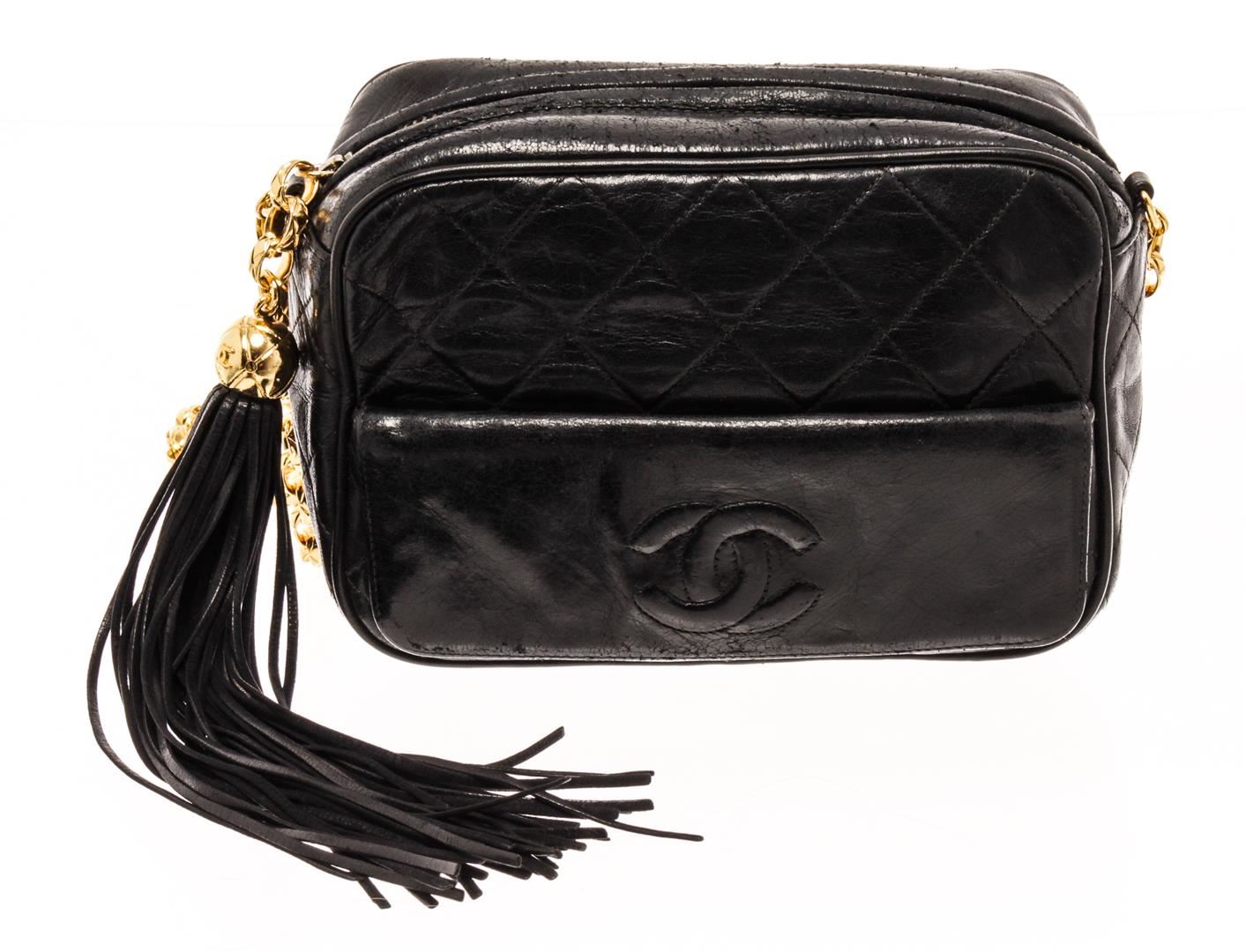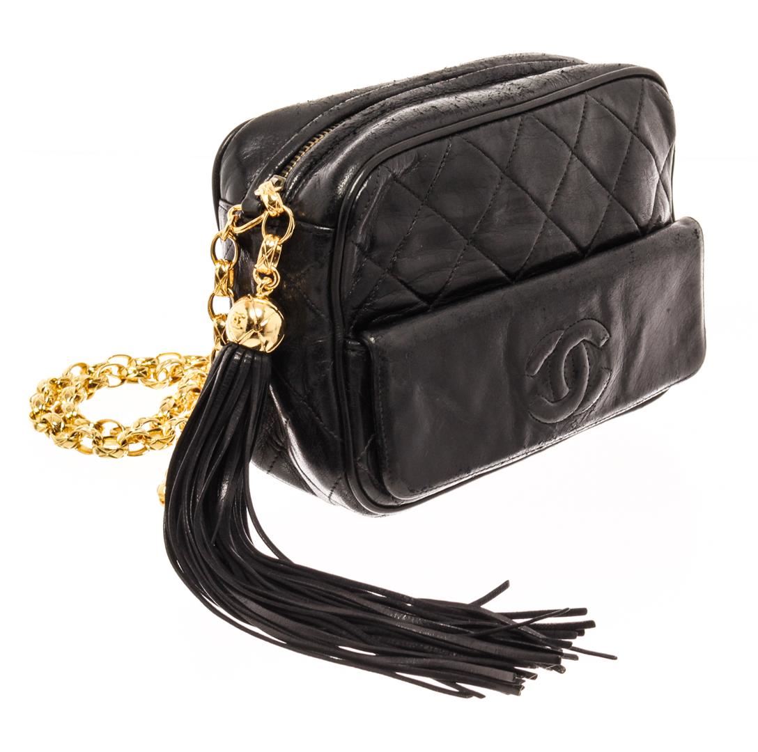 Chanel Black Lambskin Mini Tassel Camera Crossbody Bag. All available information is listed in the description and shown in the photos. chanel black lambskin mini tassel camera crossbody bag with exterior slip pocket with snap lock closure is accented by a hand-stitched "cc" logo located to front side of bag and one zipped pocket with serial logo to interior, interior pocket, full zip closure. 7" L x 5" H x 3" D / 9.98 x 12.7 x 7.62 CM