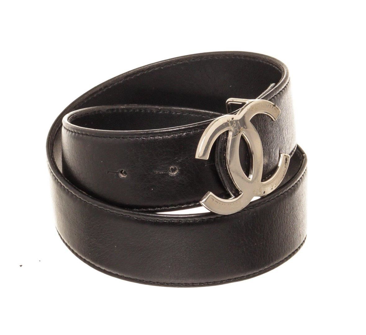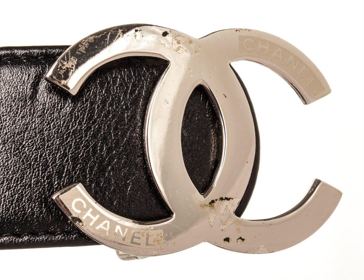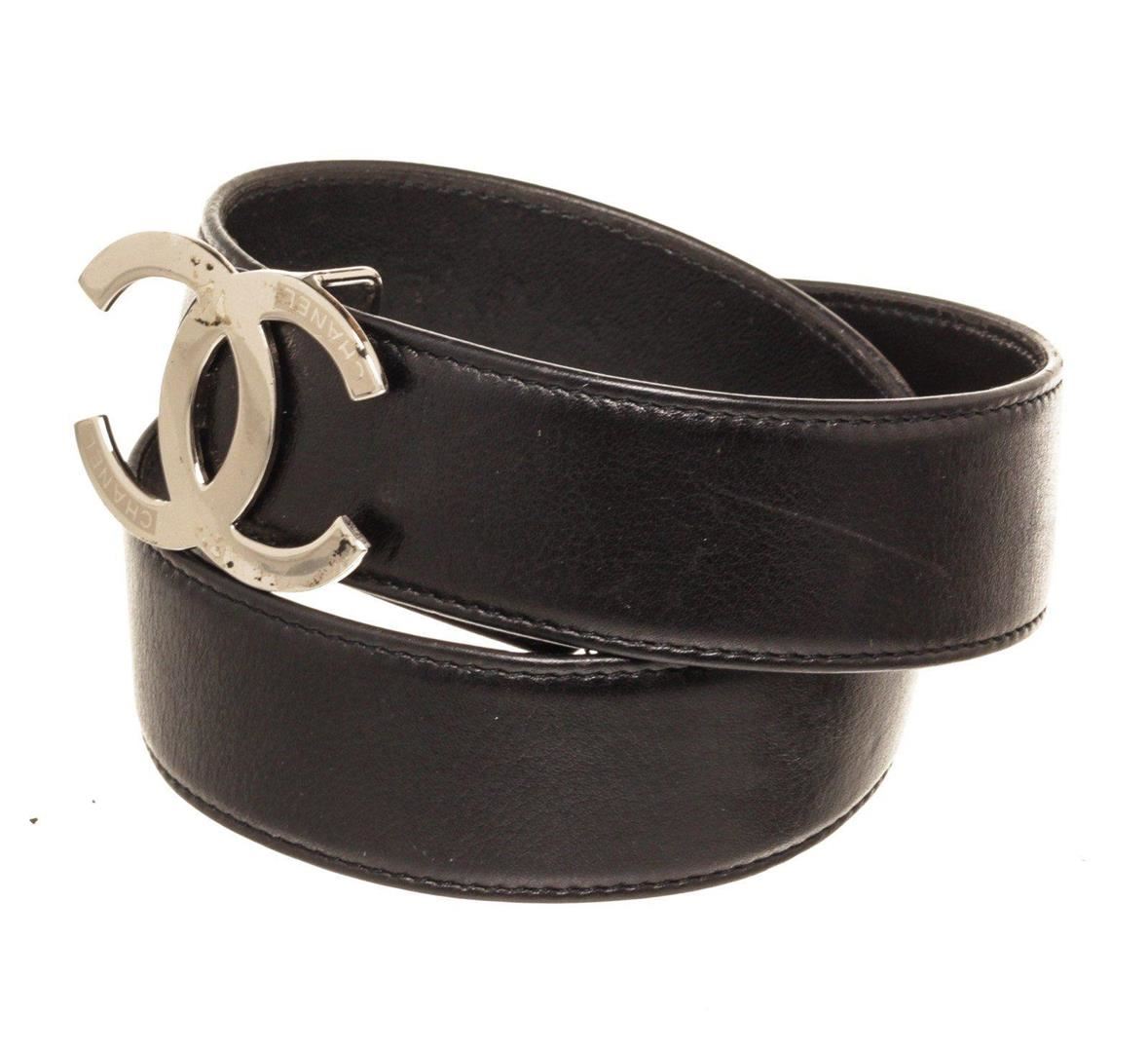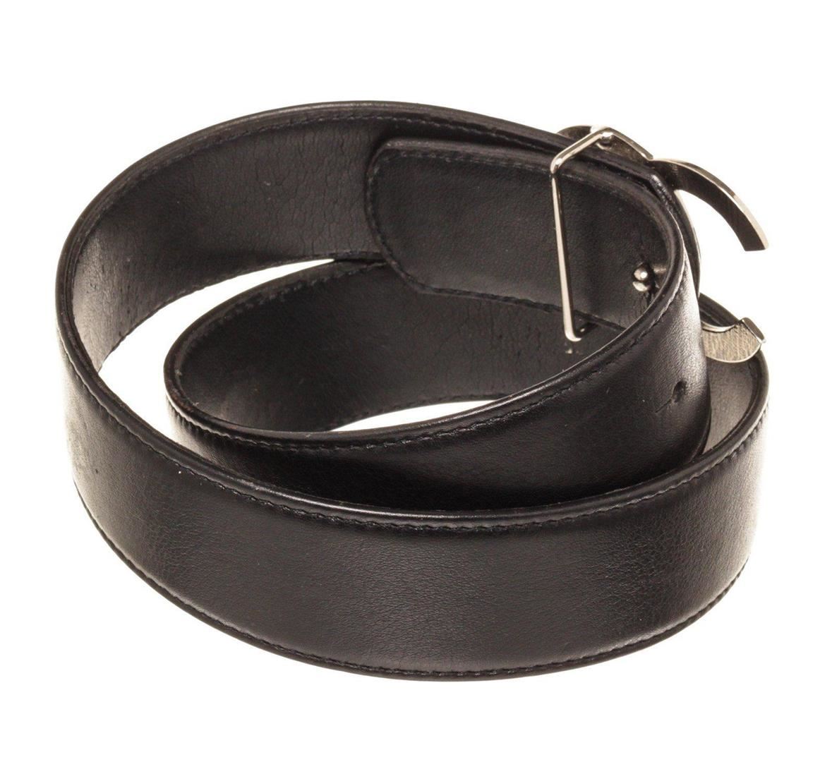 Chanel Black Leather CC Belt with silver-tone interlocking CC accent featuring peg-in hole clsoure.