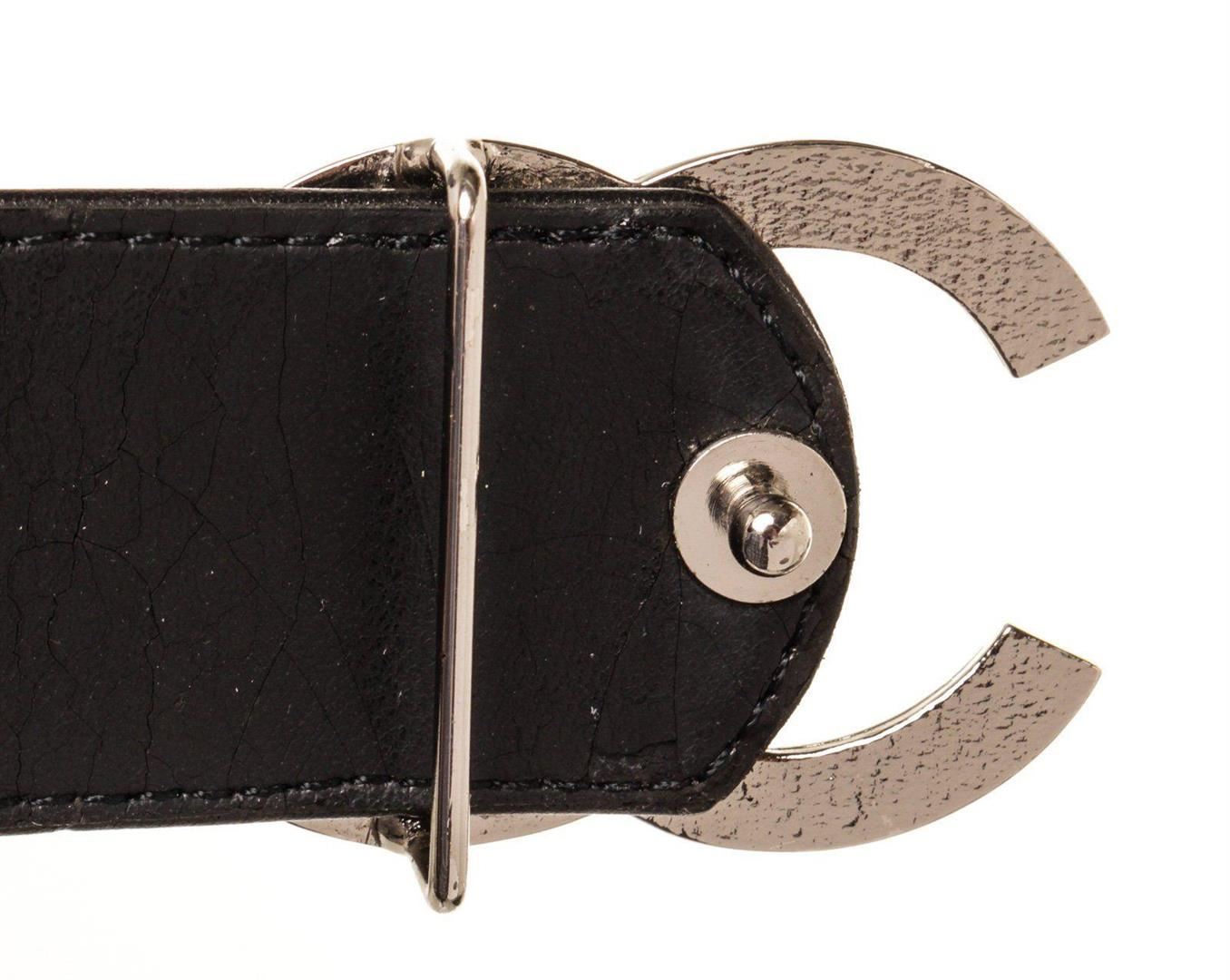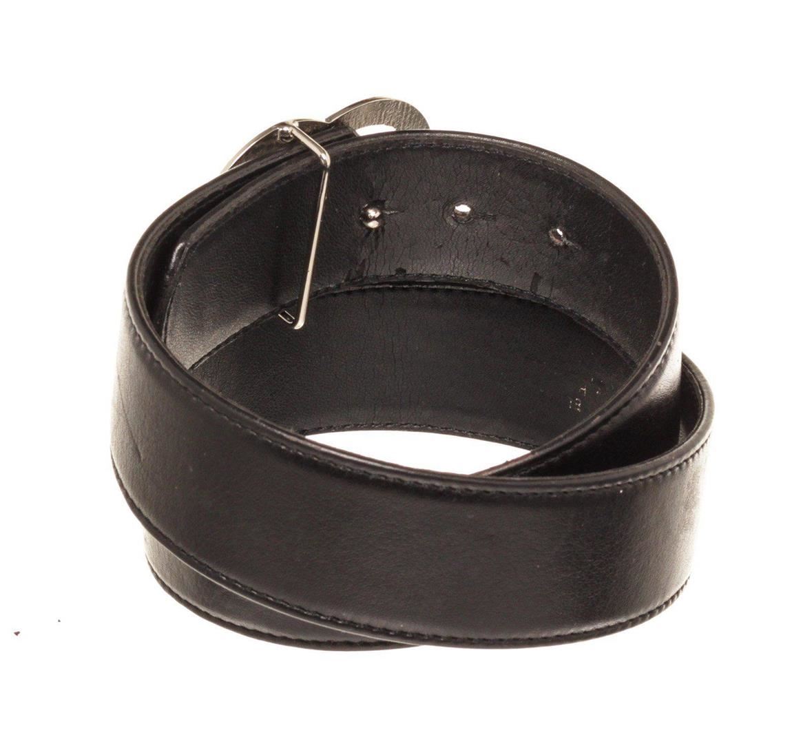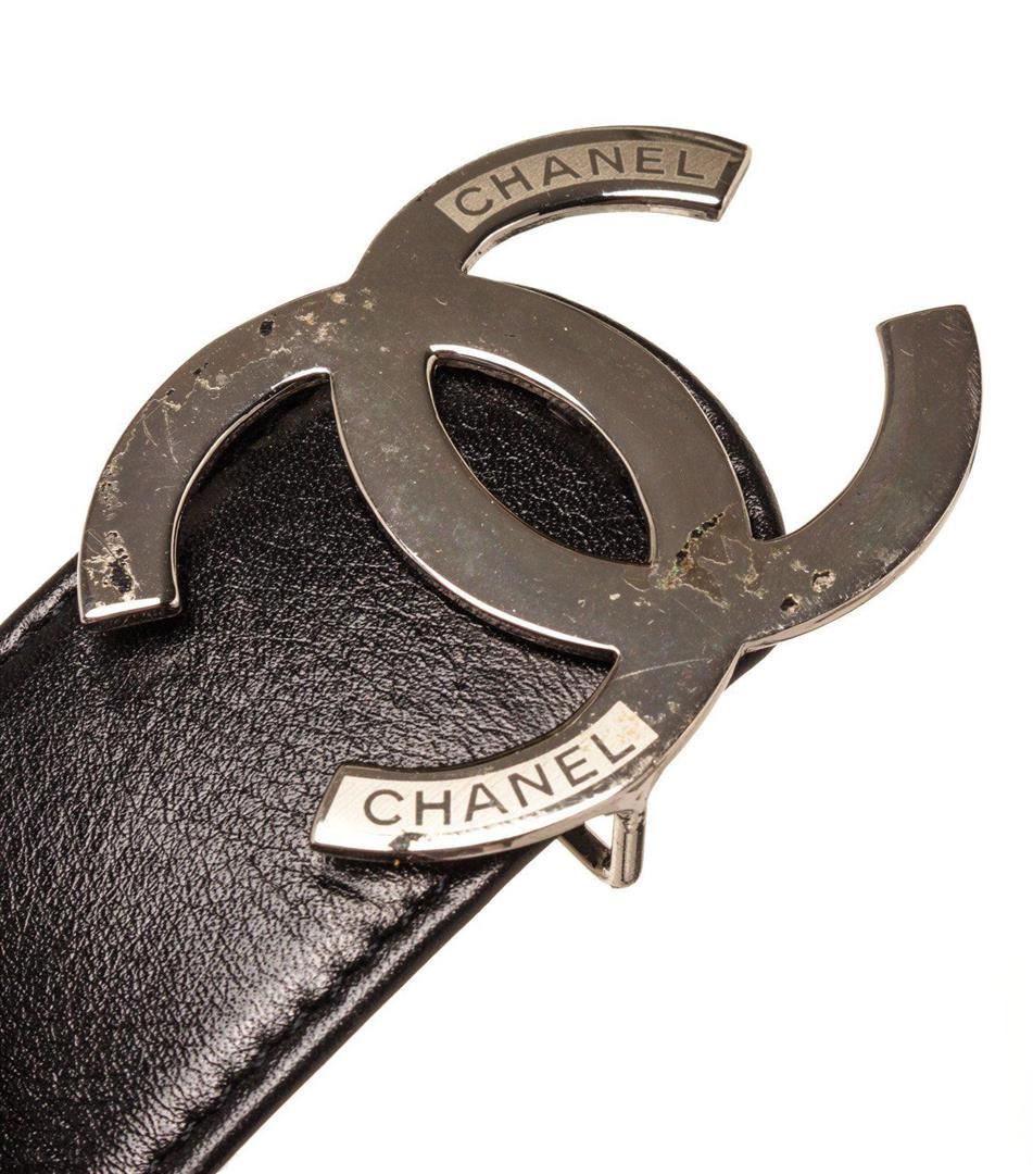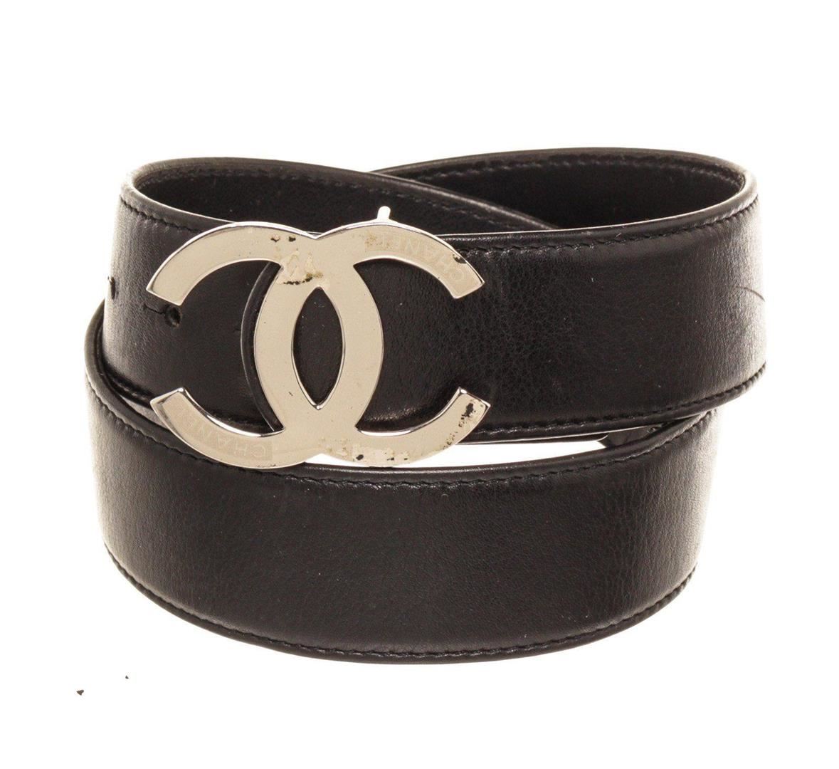 Chanel Black Leather CC Belt with silver-tone interlocking CC accent featuring peg-in hole clsoure.