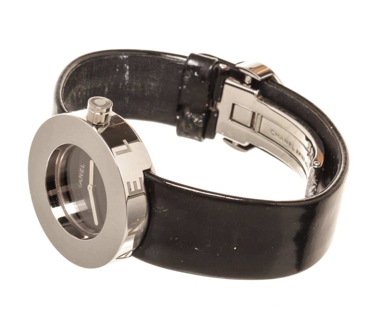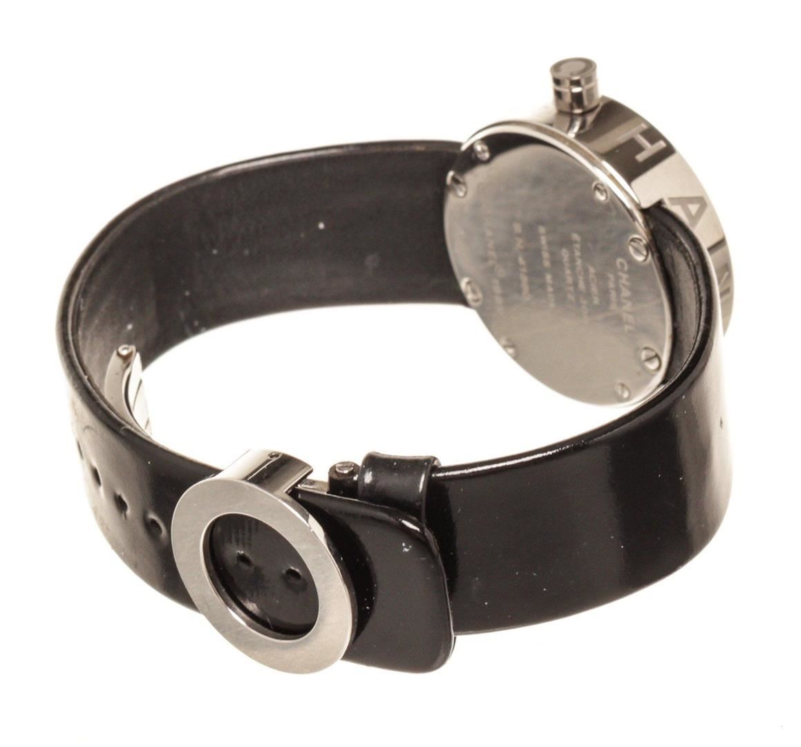 Chanel Black Leather Monte Ronde Watch with leather, gold-tone hardware and turn lock closure.