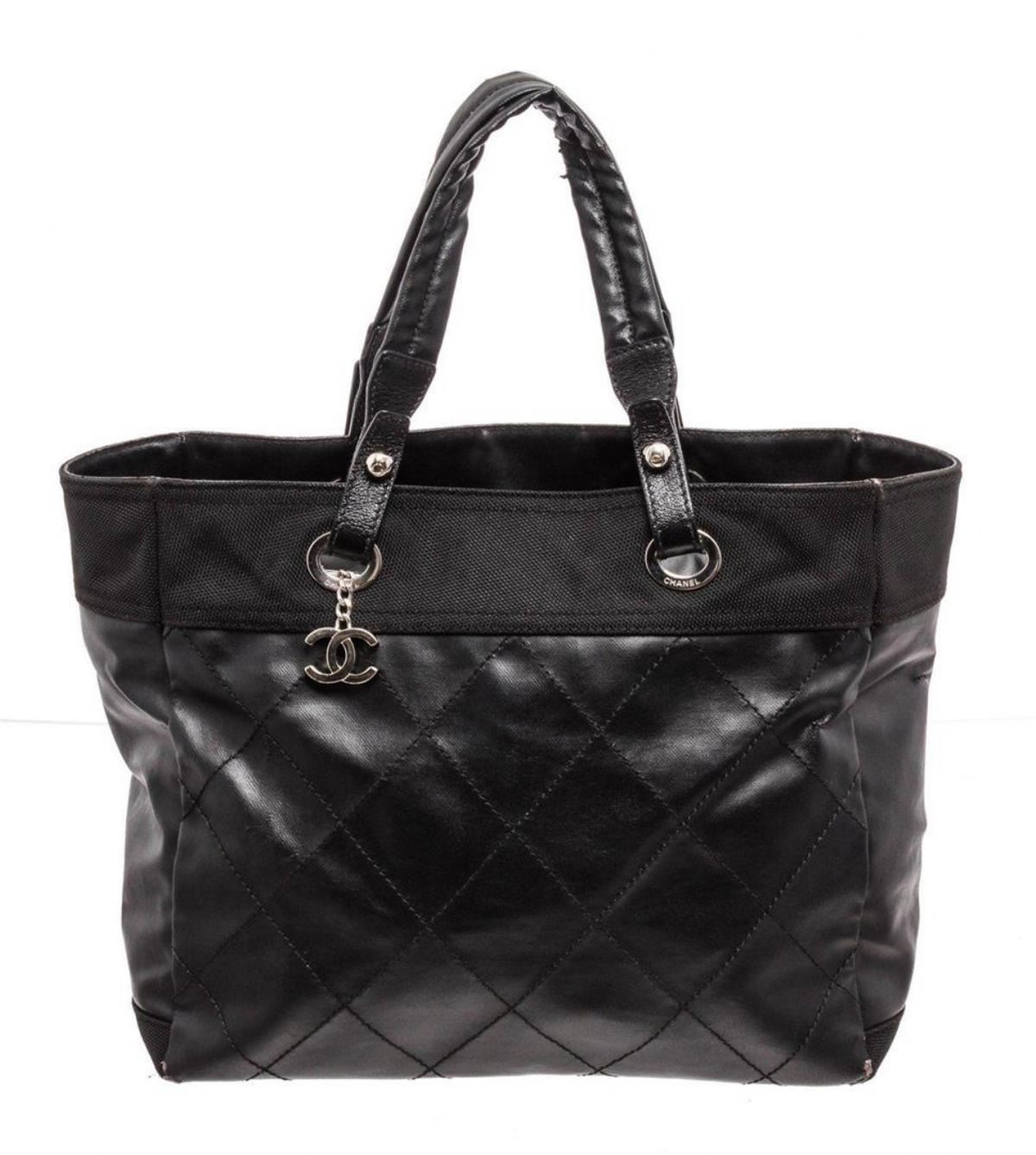 Chanel Black Leather Shoulder Bag with black-tone hardware, black leather trim, exterior zip pockets, interior zip pockets, leather lining, handle dual top handles, strap dual flat shoulder, and zipper closure. CONDITION: Pre-Owned Good overall, please see photographs for detail.