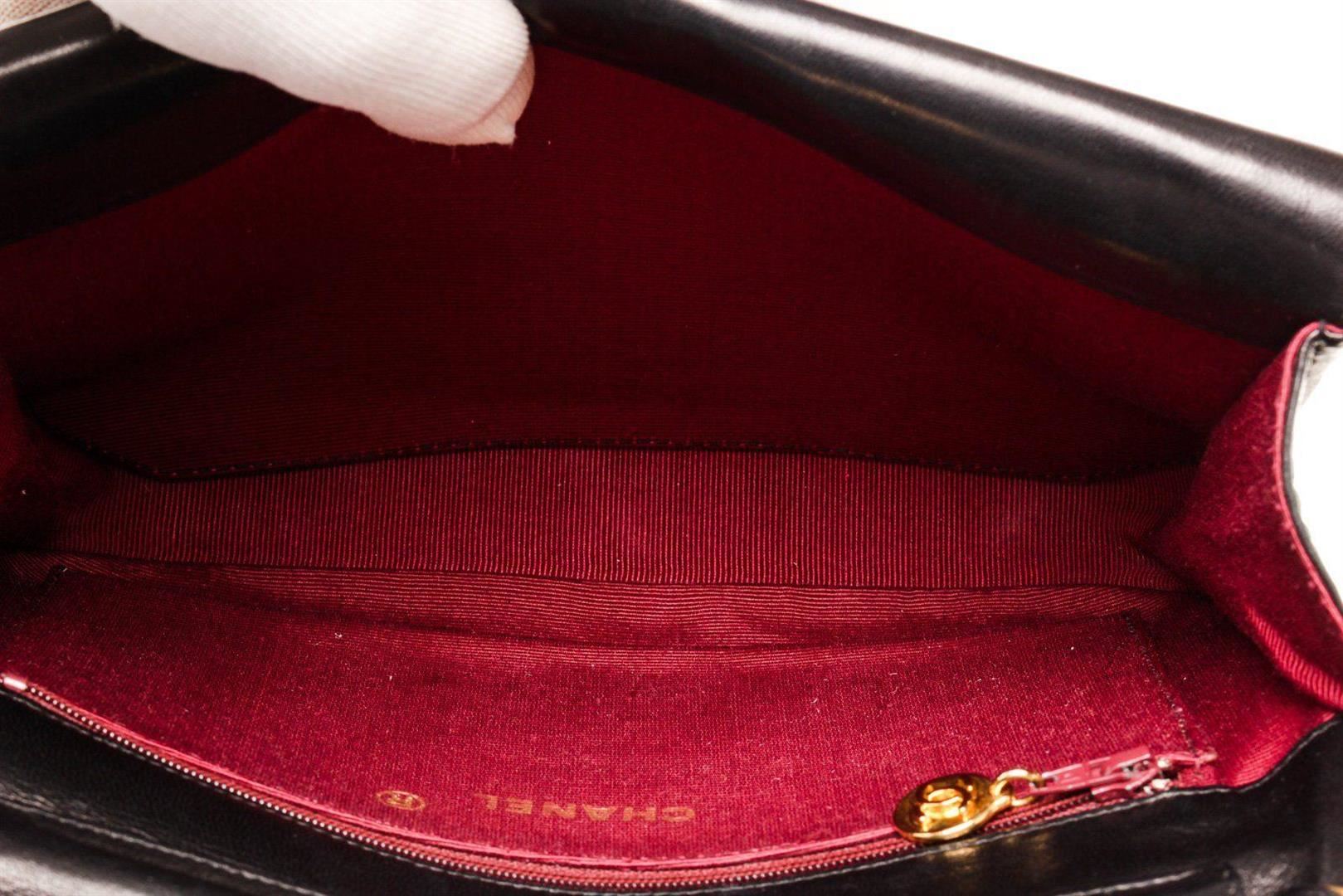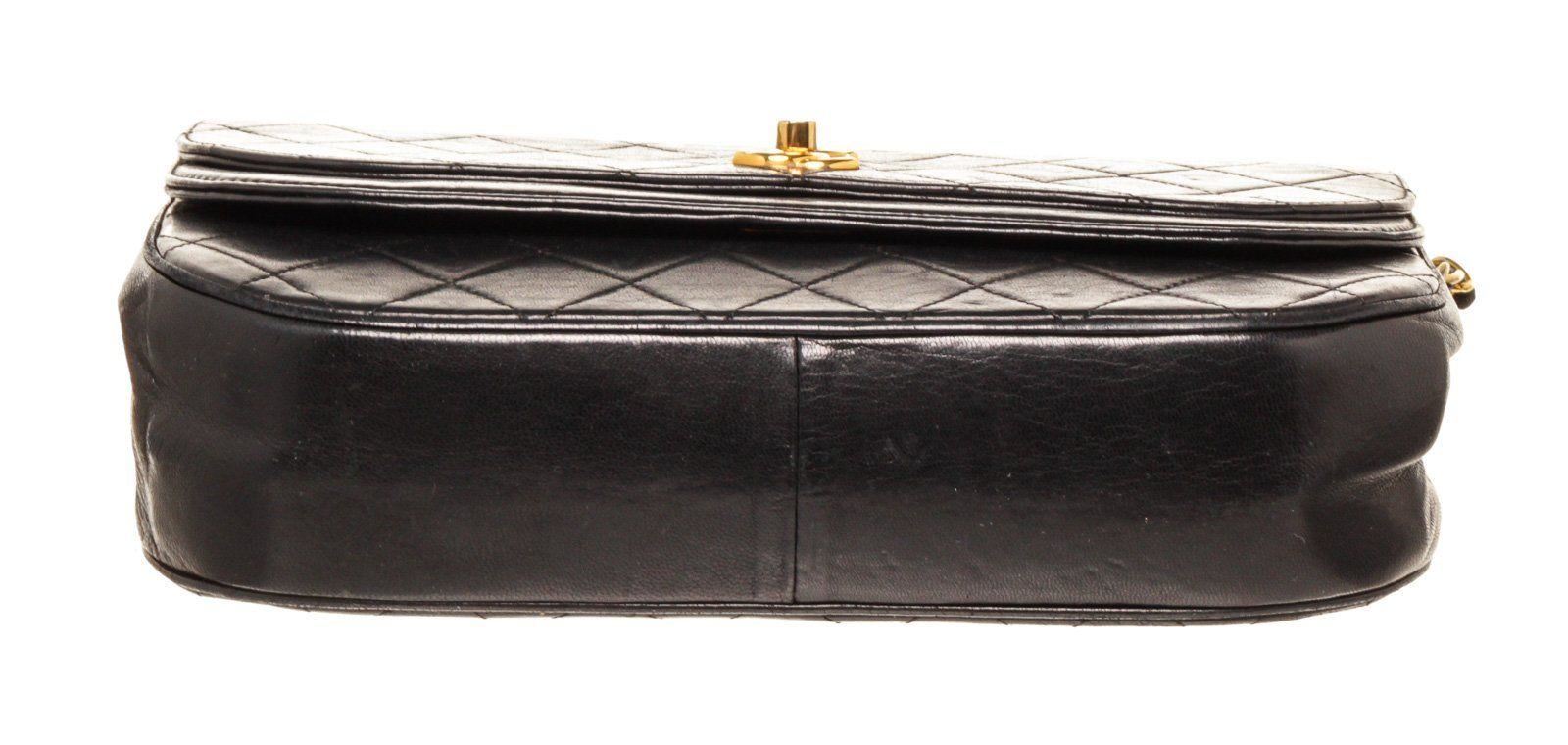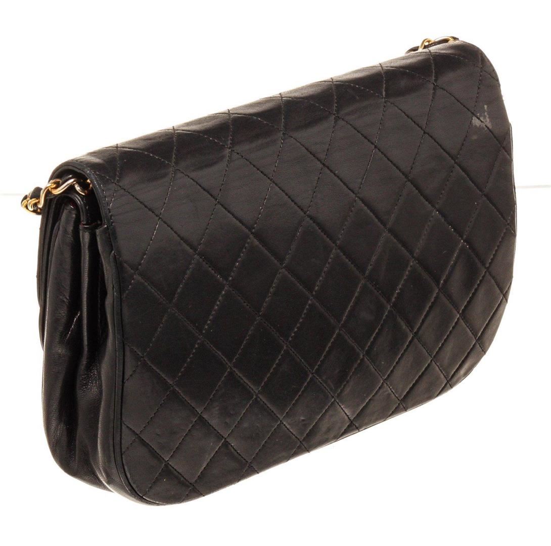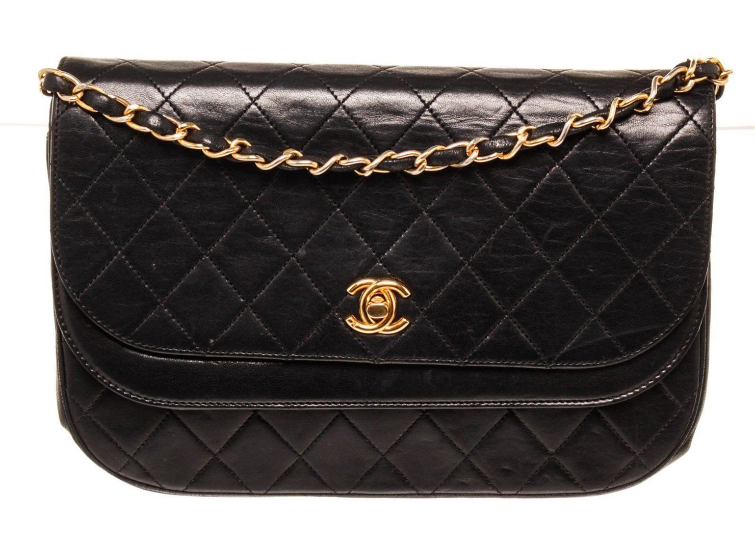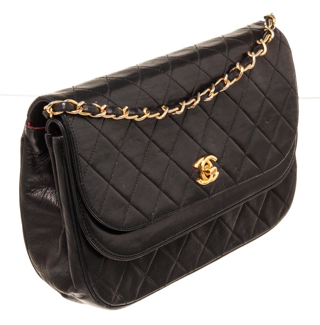 Chanel Black Leather Rounded Double Shoulder Bag with material leather gold-tone hardware, interior zip pocket top handle, chain strap and flap closure.