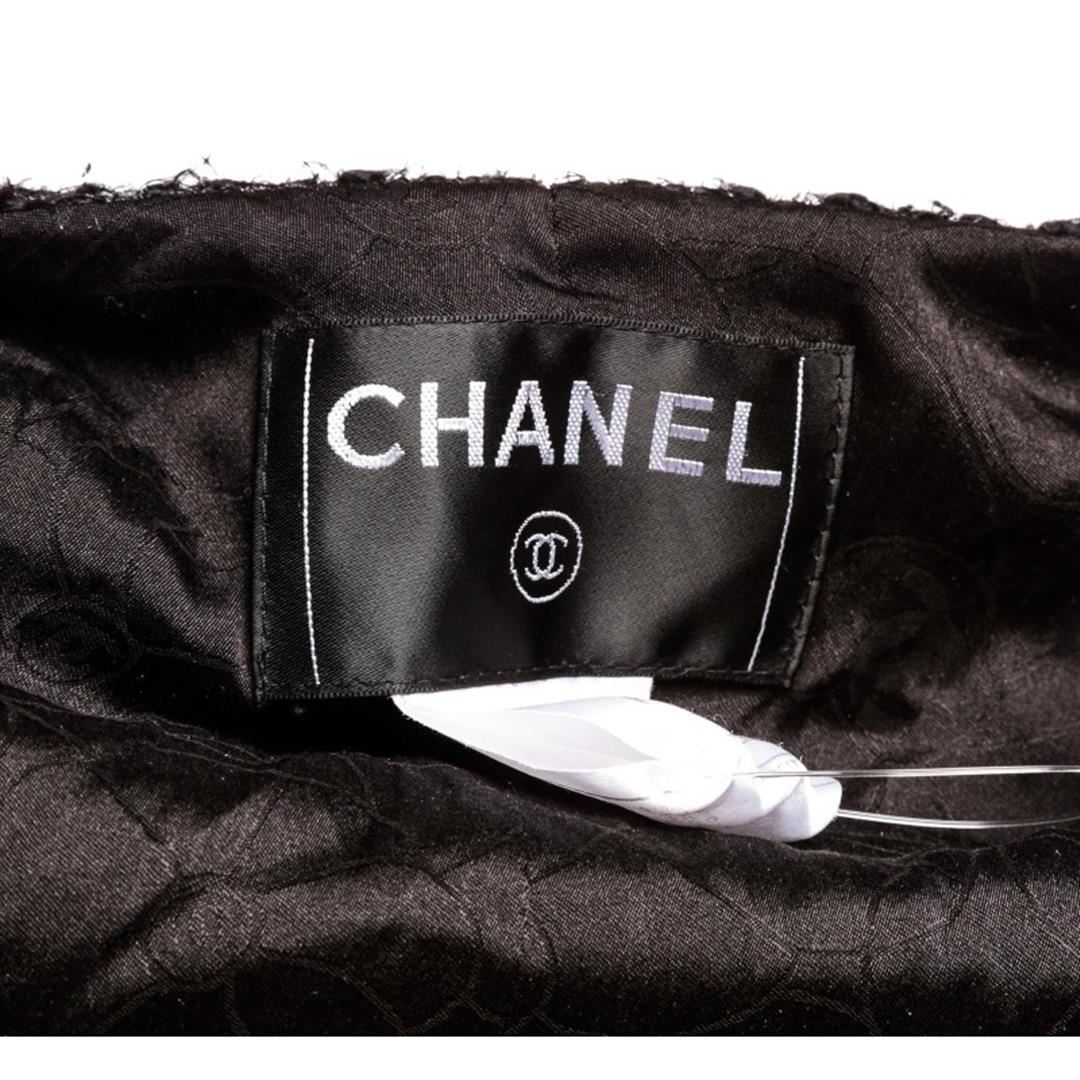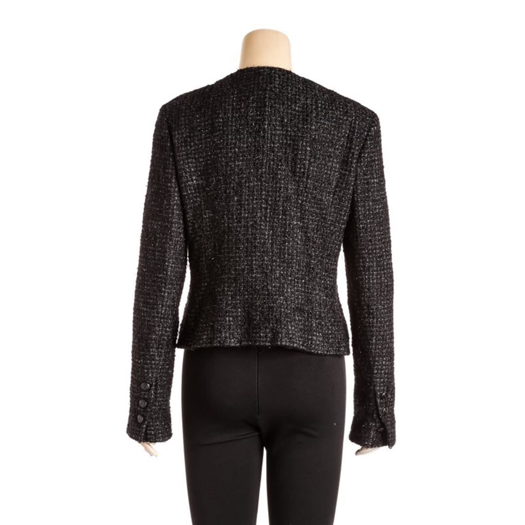 From the 06C collection. Black Chanel metallic sheen tweed jacket, dual front slip pockets, gunmetal-tone chain at interior hem CC button at cuffs, and zip front closure. Item is pre-owned. Item Dimensions: Bust:36"xWaist:32"xShoulder:32"xLength:22.5".