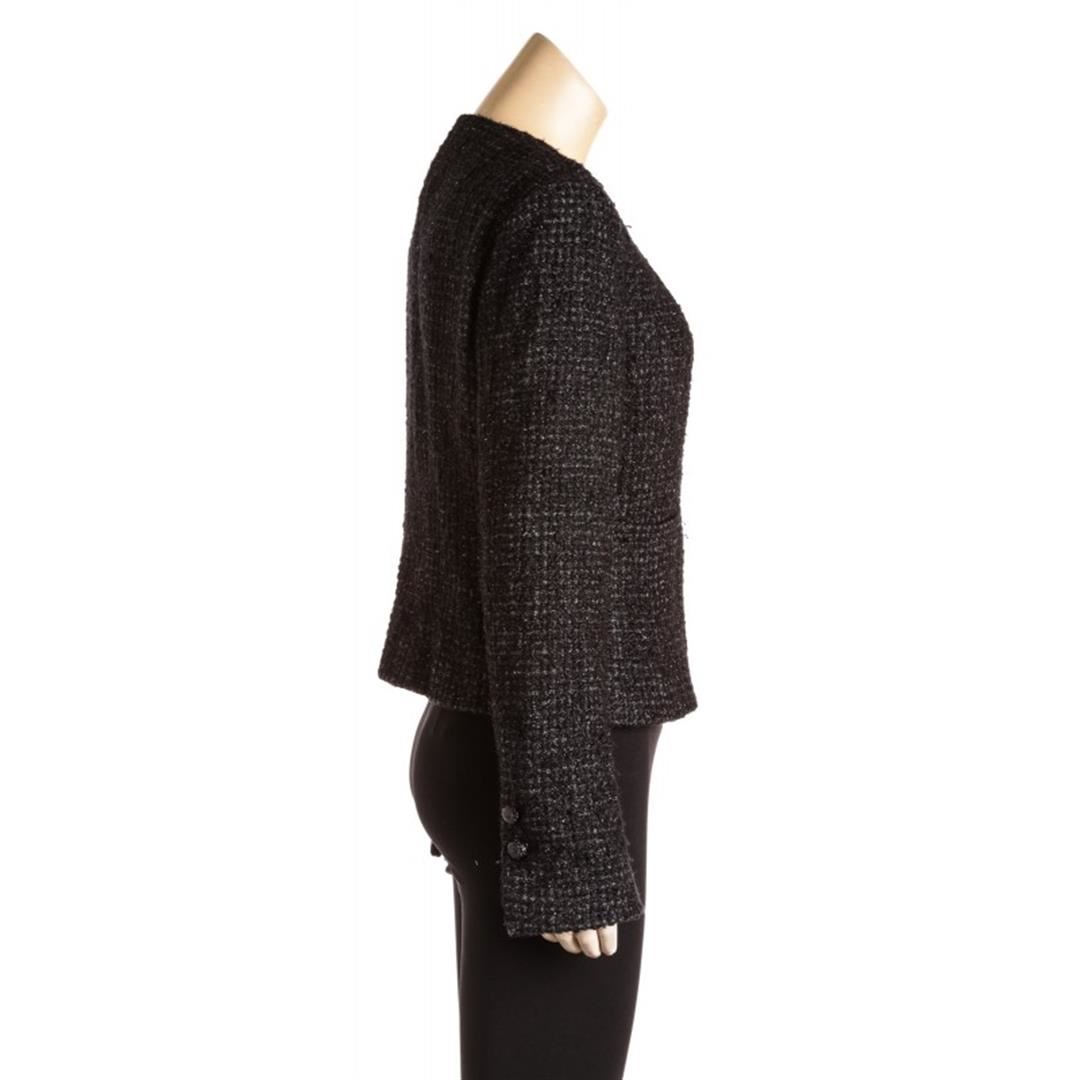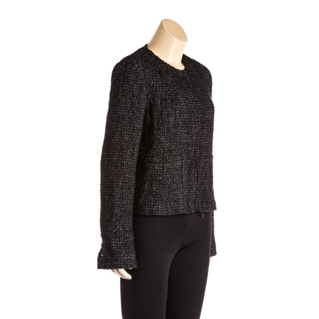 From the 06C collection. Black Chanel metallic sheen tweed jacket, dual front slip pockets, gunmetal-tone chain at interior hem CC button at cuffs, and zip front closure. Item is pre-owned. Item Dimensions: Bust:36"xWaist:32"xShoulder:32"xLength:22.5".