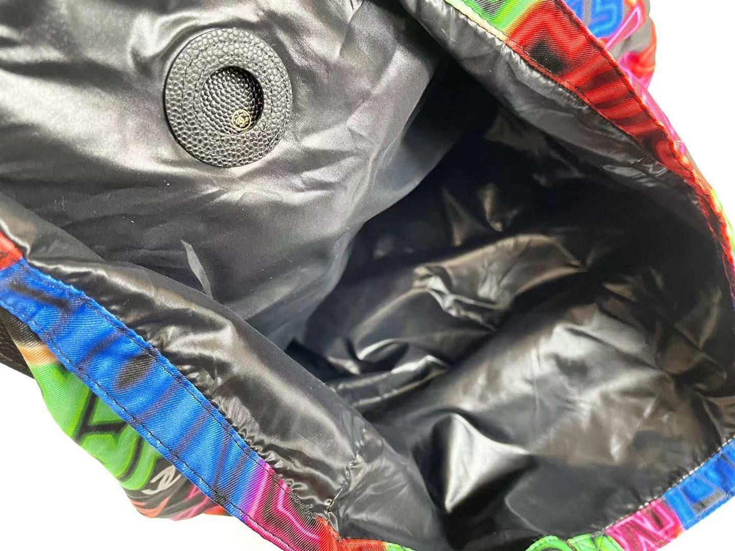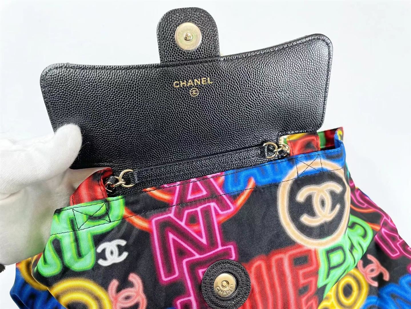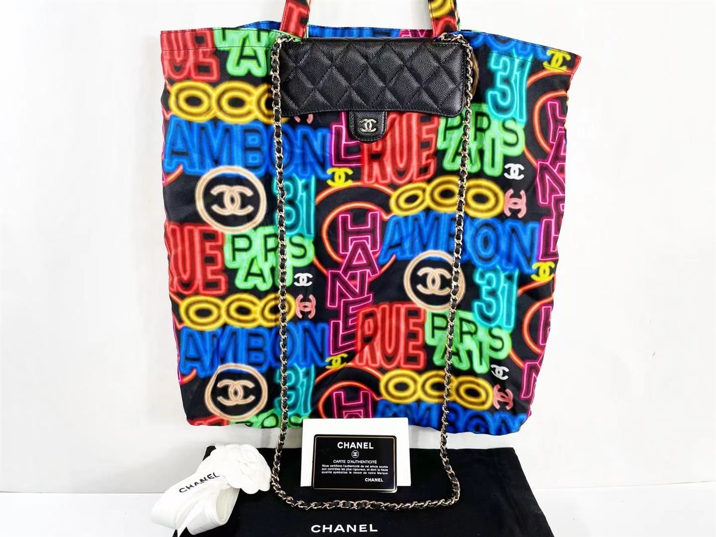 Chanel Black Multicolor Graffiti Printed Fabric Foldable Chain Tote Bag features foldable tote bag made from multicolor-printed fabric, able to be wrapped inside the flap bag made from grained calfskin, CC logo on the front flap, back pocket and gold-tone