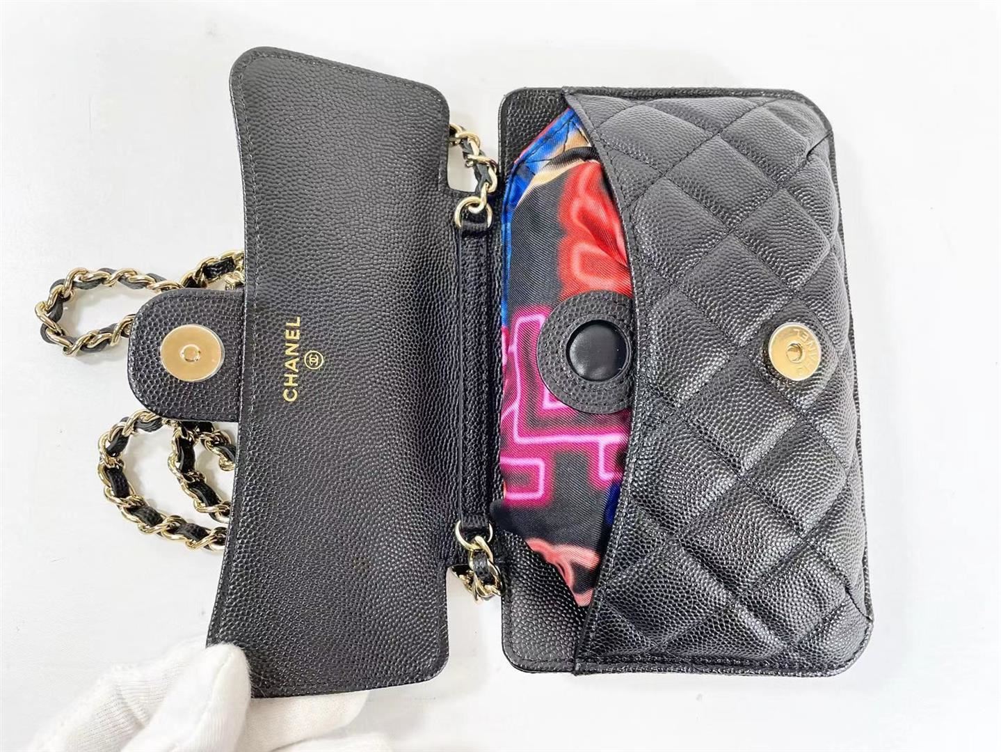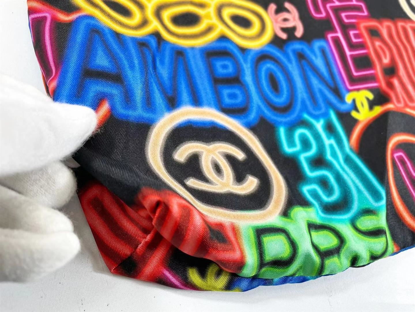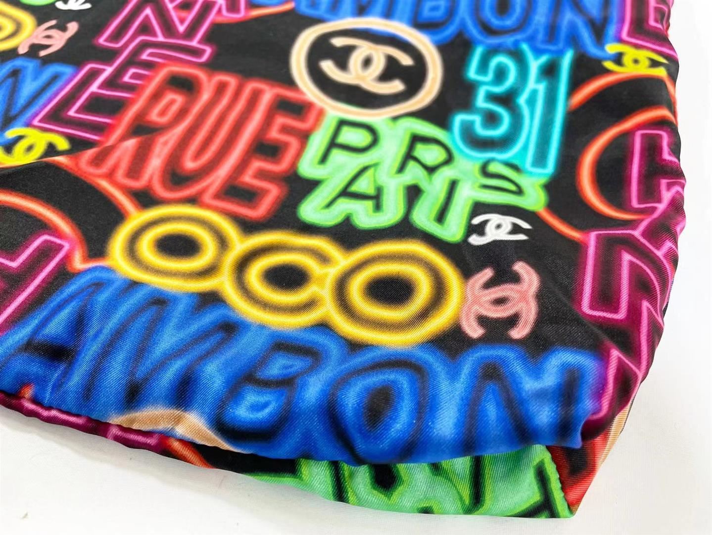 Chanel Black Multicolor Graffiti Printed Fabric Foldable Chain Tote Bag features foldable tote bag made from multicolor-printed fabric, able to be wrapped inside the flap bag made from grained calfskin, CC logo on the front flap, back pocket and gold-tone